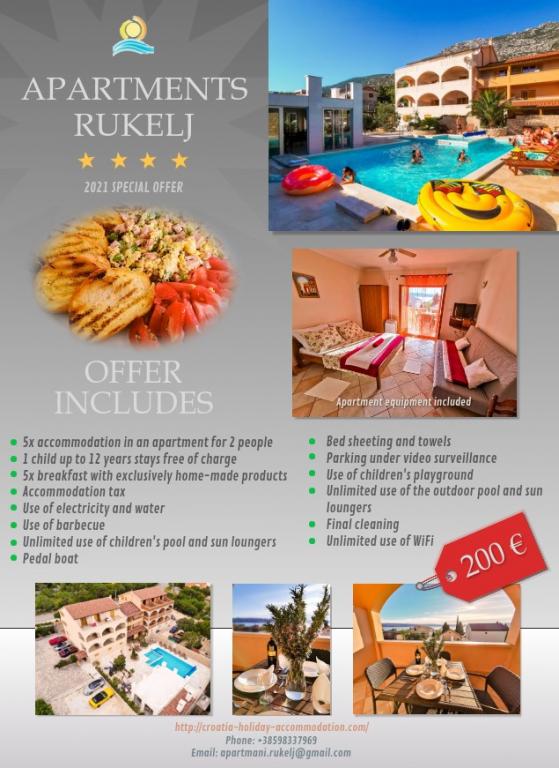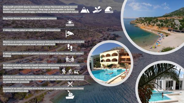 Objekt upravlja cela družina, dosegljivi smo kadarkoli v dnevu. Družina Rukelj ponuja objekte za vse starosti, izpostavimo pa lahko otroški bazen, bazen za odrasle, otroško igrišče, pedaline, vožnjo z gliserjem po zasebnih plažah in prostor za druženje, kjer lahko organizirate različna praznovanja, srečanja, predavanja in izobraževanja. Od plaže smo oddaljeni približno 50 metrov, razteza pa se med dvema čudovitima zalivoma. V sklopu objekta je veliko parkirišče pod video nadzorom. Počitek v majhnem raju na zemlji ob čudovitem morju in popolnoma čistem zraku v narodnem parku Velebit, stran od industrije in živahnega življenja. Uživajte v brezskrbnih in varnih počitnicah z družino Rukelj, domači pijači in vedno sveži hrani, pripravljeni z ljubeznijo samo za naše goste. Zaključite dan z večerjo v apartmajih Rukelj v družbi in kozarcu vina ter najboljših specialitetah z žara. Obiščite nas in z našo gostoljubnostjo bomo upravičili vašo izbiro. Avtor besedila: Apartmaji Rukelj
