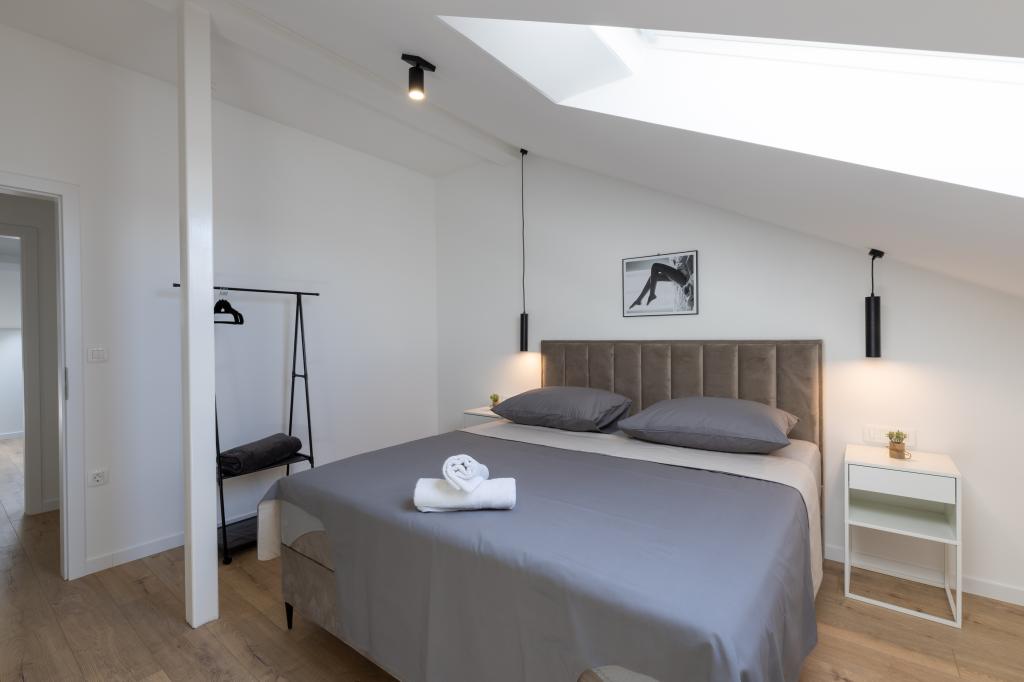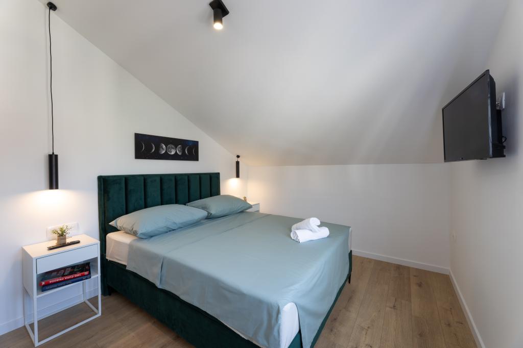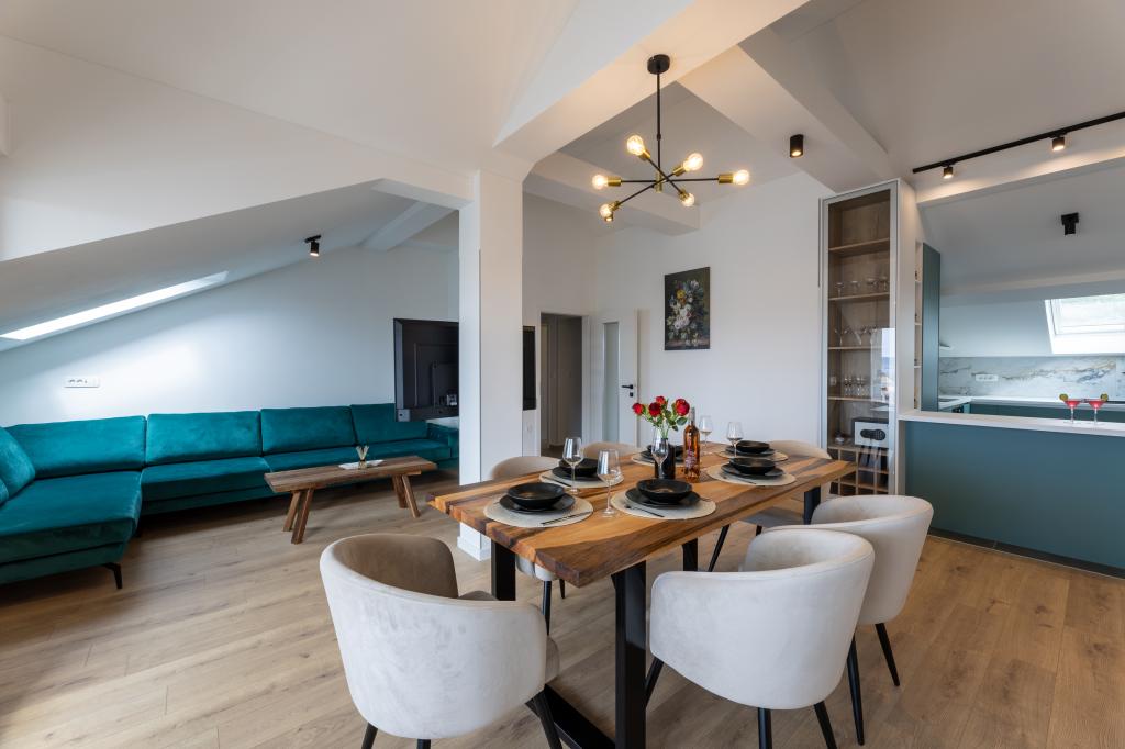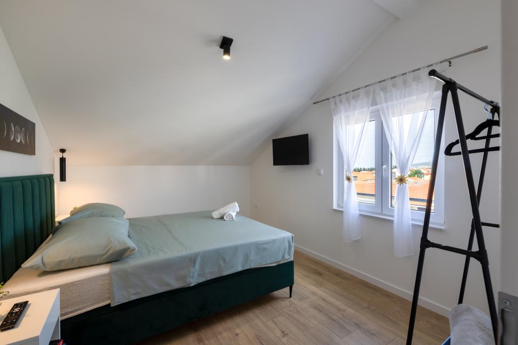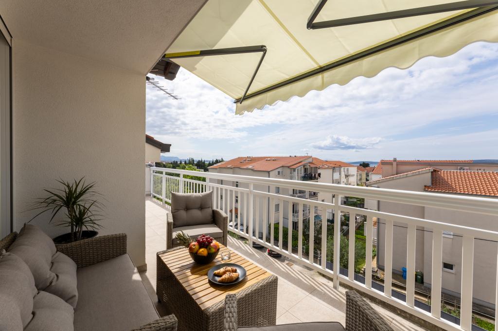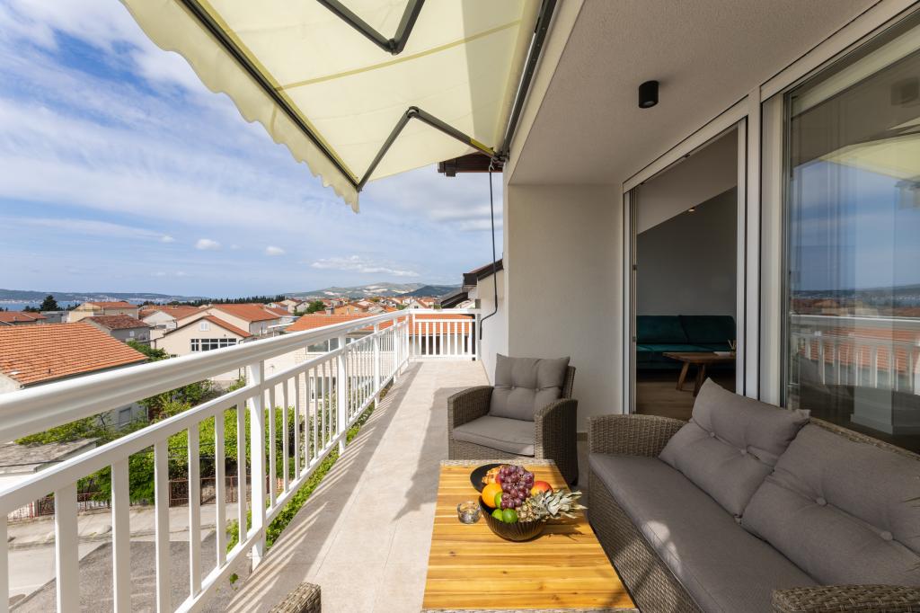 Hiša, v kateri se nahaja apartma Panorama 120 m2 (zgornje nadstropje hiše), se nahaja v mirnem okolju Kaštel Lukšića, kraja med Trogirjem in Splitom. Stanovanje je na novo prenovljeno in opremljeno z vsem potrebnim. Sestavljen je iz 3 spalnic (3 zakonske postelje), dnevne sobe, 2 kopalnic, kuhinje, opremljene z vsemi kuhinjskimi aparati, posodo in jedilnim priborom ter balkona s čudovitim pogledom na morje. Vsaka soba ima svojo televizijo. Za goste apartmaja je na voljo posteljnina, brisače in garažno mesto ima tudi WI-FI.