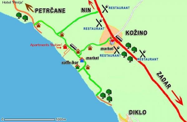 Hiša Buljan se nahaja v Kožinu, nedaleč od Zadra. Od morja in plaže je oddaljen približno 100 metrov. Kožino je kraj severozahodno od Zadra na oddaljenosti le 6 km, med Diklo in Petrčane, odličen za miren in prijeten družinski dopust. Hiša ima pet nastanitvenih enot (apartmajev). Okoli hiše je vrt z dvema vrtnima terasama, žarom in 5 parkirnimi mesti. Plaža je prodnata in tlakovana, morje pa čisto in čisto. Okolje je bogato z destinacijami, ki jih morate obiskati: staro mesto Zadar; Morske orgle; Lep pozdrav Soncu; nacionalni parki: Kornati, Krka, Paklenica, Plitvice; Mesta: Zadar, Split, Trogir, Šibenik, Biograd, Nin; Jame Cerovac; Reke: Zrmanja, Krka, Gacka; Dejavnosti: ribolov, jadranje, potapljanje, jahanje, kolesarjenje, rafting, plezanje, ....