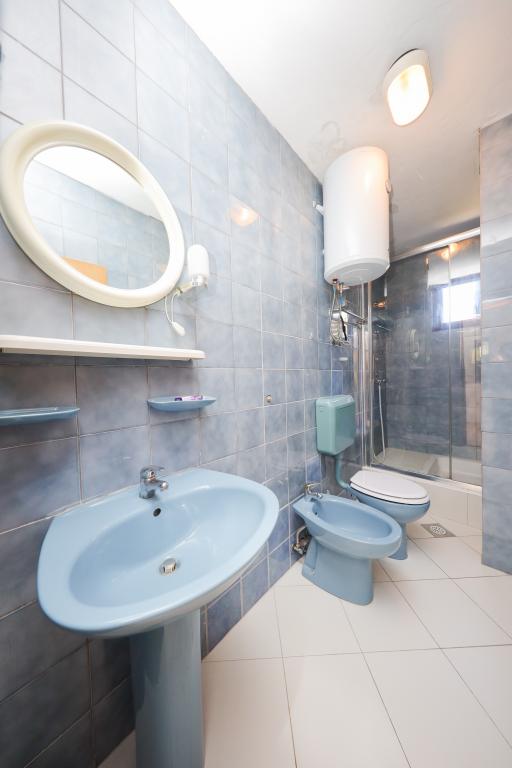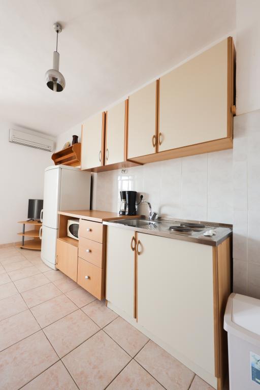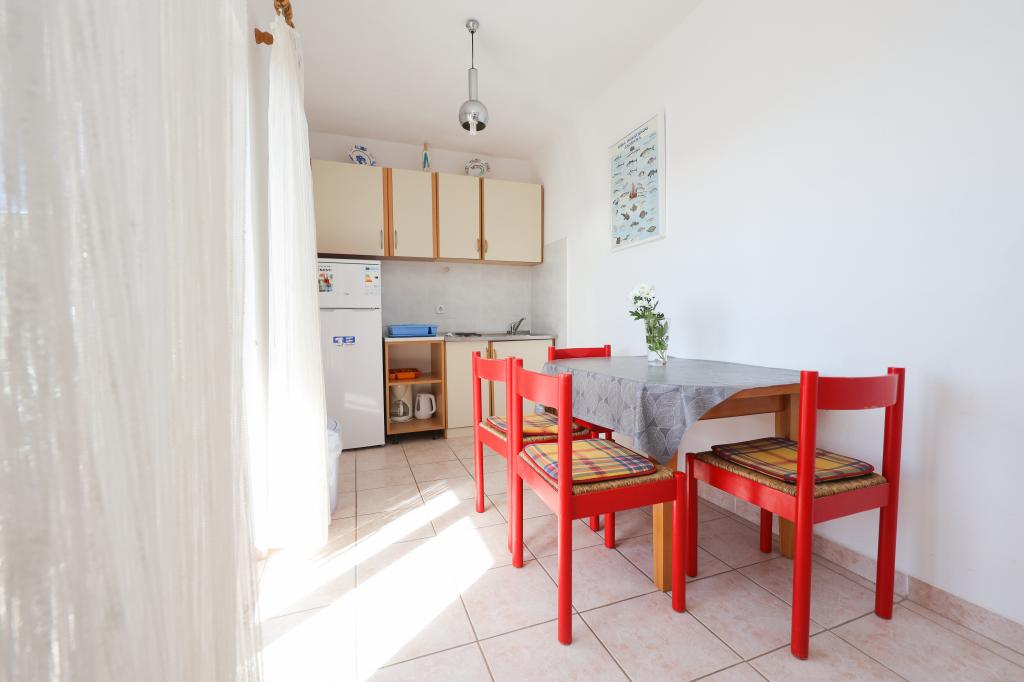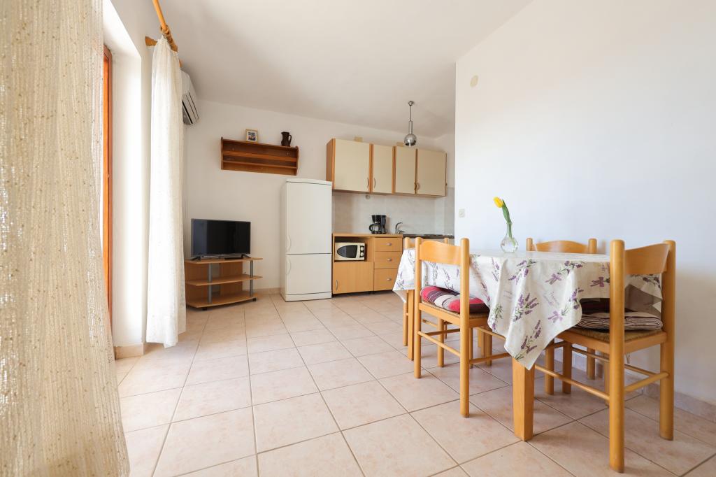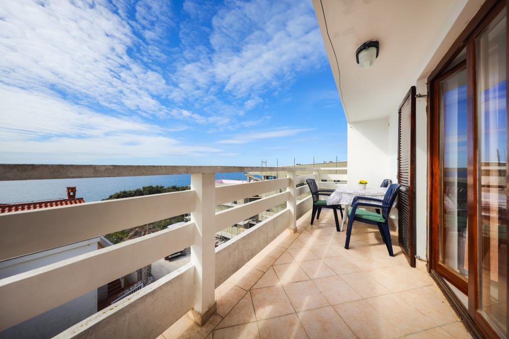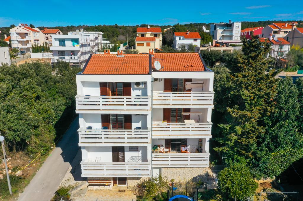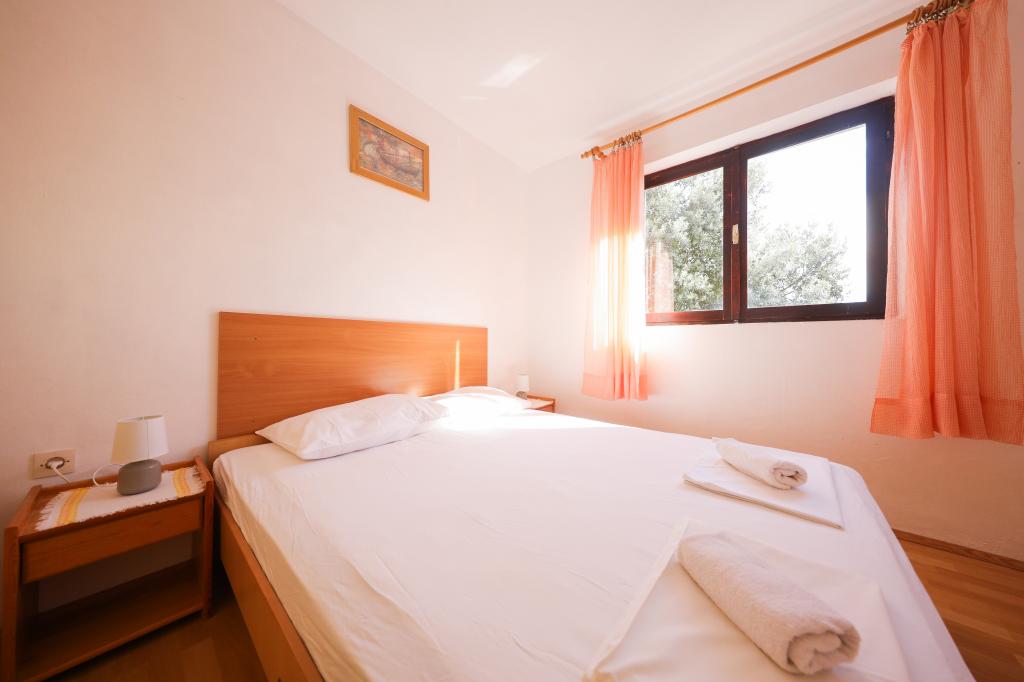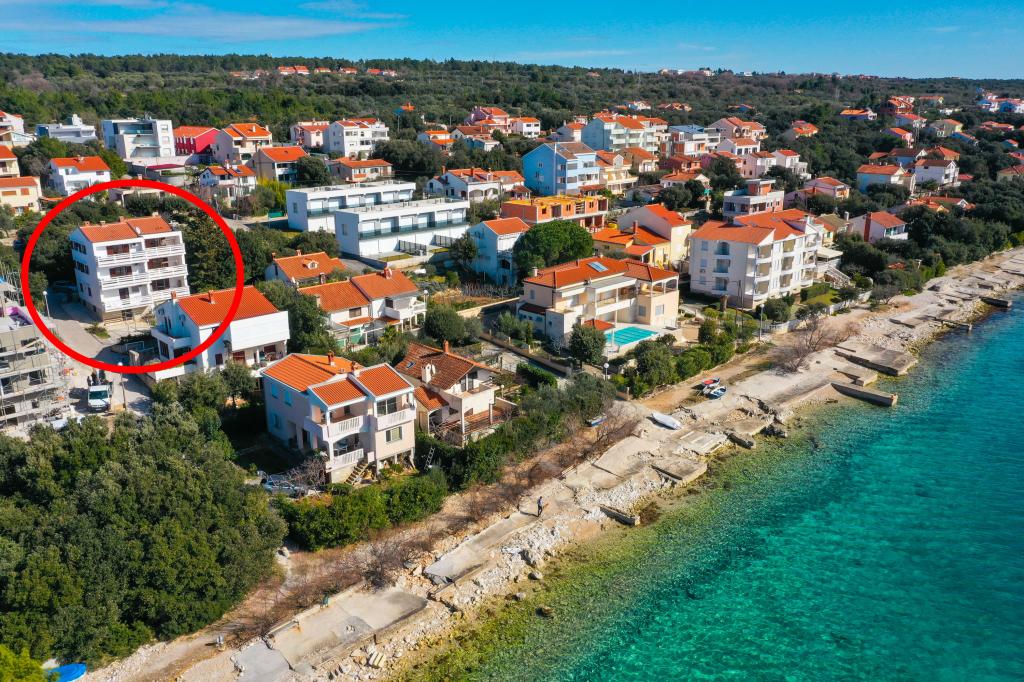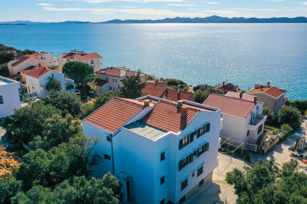 Plaža je oddaljena 40 metrov. Apartmaji so primerni za 4 osebe, (možno 5). Imajo dve ločeni spalnici s po dvema ležiščema (2 zakonski postelji, 2 enojni postelji), teraso s pogledom na morje. Apartmaji vsebujejo popolnoma opremljeno kuhinjo, kopalnico (brisače vključene), spalnice s posteljnino, varovano parkirišče. Možna je uporaba zunanjega žara. Po želji lahko postavimo otroško posteljico.