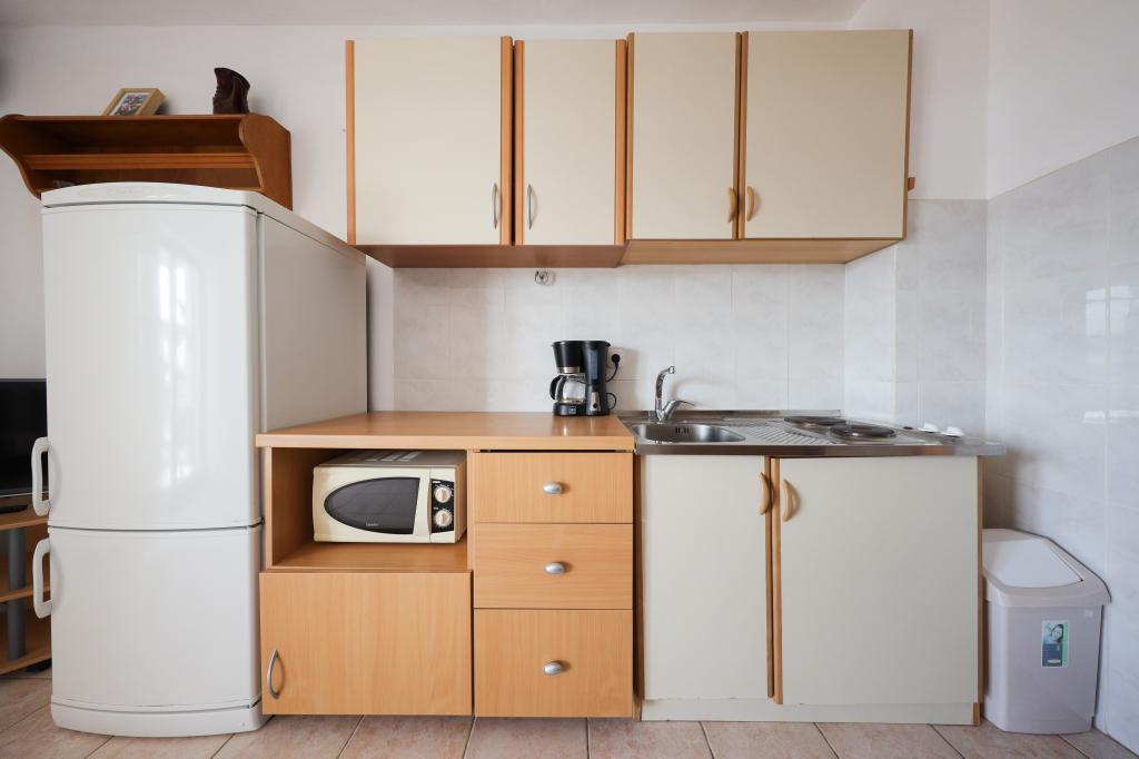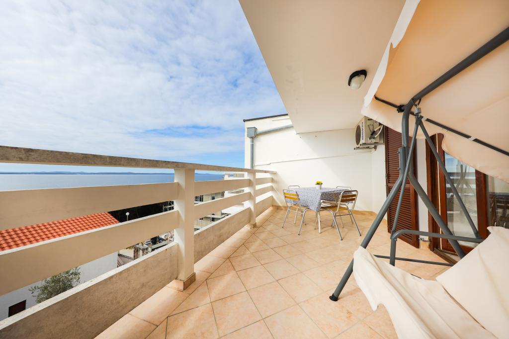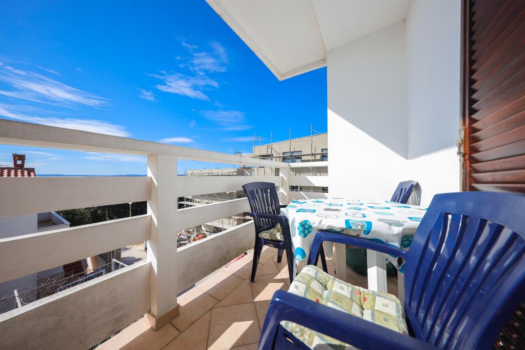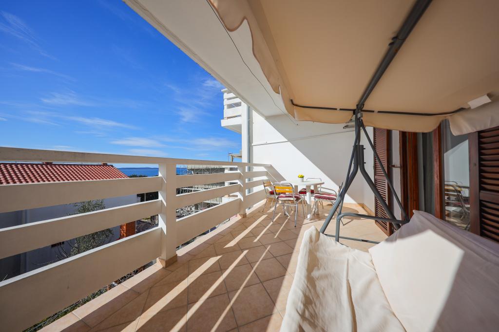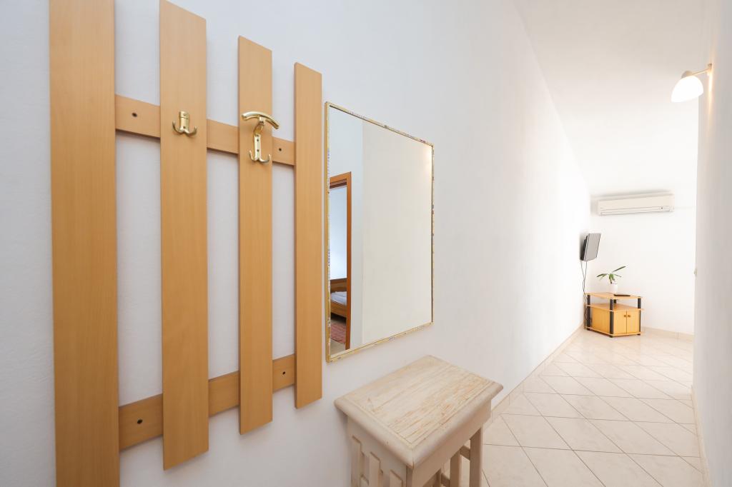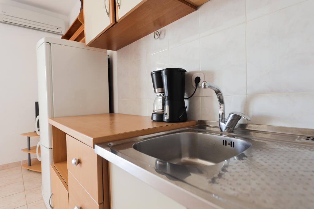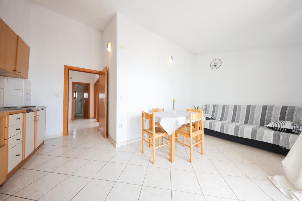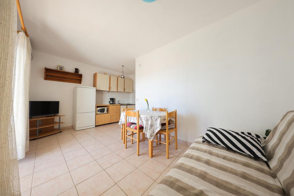 Plaža je oddaljena 40 metrov. Apartmaji so primerni za 4 osebe, (možno 5). Imajo dve ločeni spalnici s po dvema ležiščema (2 zakonski postelji, 2 enojni postelji), teraso s pogledom na morje. Apartmaji vsebujejo popolnoma opremljeno kuhinjo, kopalnico (brisače vključene), spalnice s posteljnino, varovano parkirišče. Možna je uporaba zunanjega žara. Po želji lahko postavimo otroško posteljico.