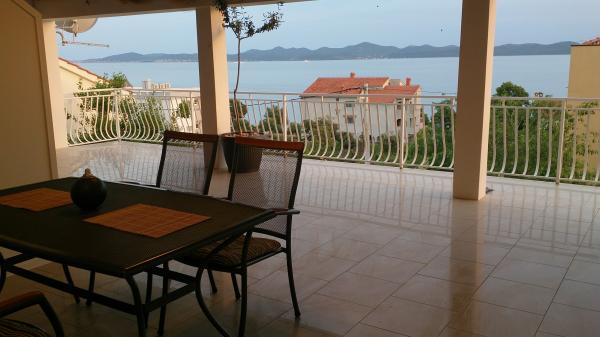 Popolnoma opremljeni apartmaji na drugem nadstropju hiše v mirnem turističnem mestu Kozino, le 4 km od mesta Zadar. Z velikim balkonom ponuja čudovit pogled na zadarskem arhipelagu. V bližini so trgovine in nekaj restavracij in plaže je le minuto stran. Cena vključuje: parkirišče, klima, Wi-Fi, žar, itd