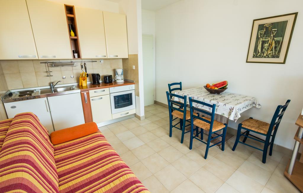 Popolnoma in moderno opremljeni apartmaji v mirnem delu Kozine. Bližina Zadra 7 km. Le 20 se jih je srečalo. do plaže, na voljo senčniki in ležalniki. Vsi apartmaji imajo teraso s pogledom na morje. Apartma A-2+2 in A-4 se nahajata v prvem nadstropju. Apartma A -4+2 se nahaja v pritličju. Vsi apartmaji imajo kuhinjo s štedilnikom, pečico, hladilnikom, zamrzovalnikom, kuhalnikom vode, aparatom. za kavo, toaster, likalnik, posteljnina, brisače, kuhinjske krpe menjava na 7 dni. po potrebi in pogosteje pripomočke za pranje in čiščenje. Apartma za 6 oseb ima pralni stroj, pomivalni stroj. , mikrovalovna pečica, aparat za kavo, opekač kruha in grelnik vode. Lastno parkirišče v senci za vse goste - Mesto na plaži po želji gosta. Avtomobilski promet samo za najemnike in goste ulice. Varno za otroke. V senci dreves je urejen žar s prostorno mizo in klopmi za druženje. Gostom so na voljo senčniki - brezplačno. Brezžični internet je brezplačen. Klima po potrebi. Zaračuna se od 5 - 7 evrov / dan. Zunanji tuš. Vezenine za manjše pogl
