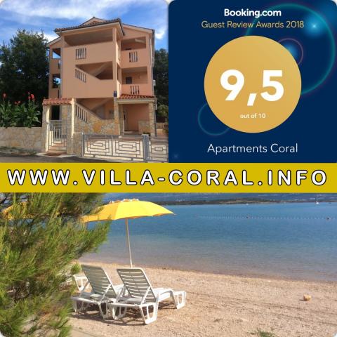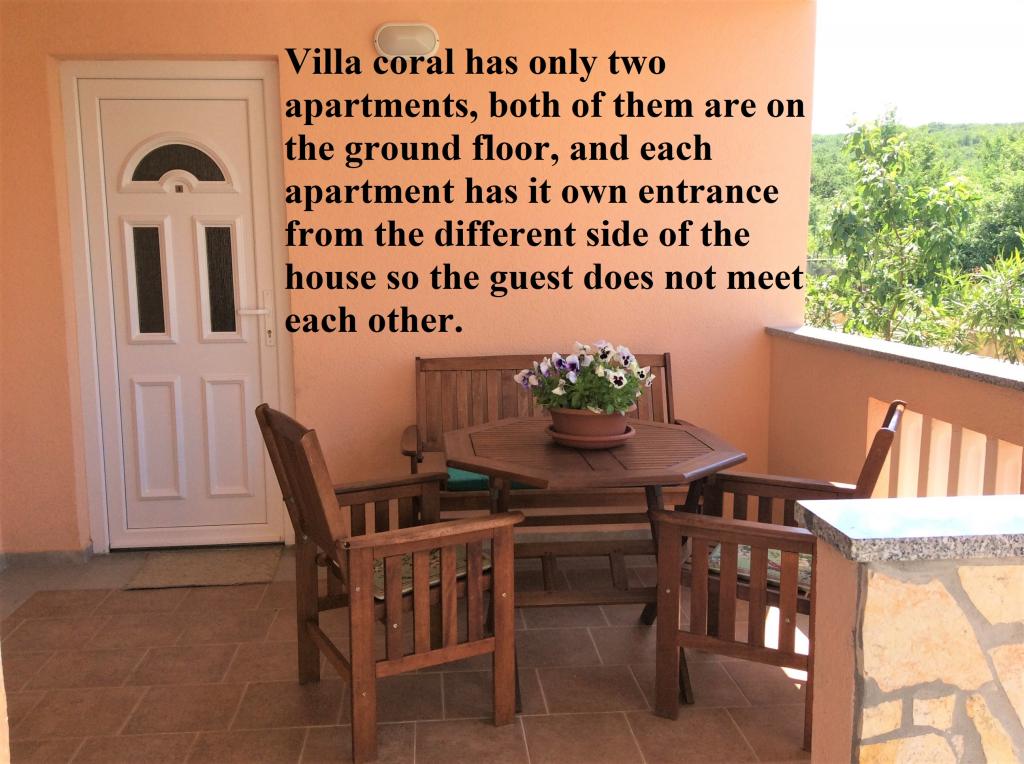 Apartma je nov in udobno opremljen 100 m od morja in najbližje plaže je oddaljena 150 m (na cesti proti morju ni korakov ali vzpone in padcev, je enostavno doseči otroški invalidski voziček) App. 2 2 se nahaja v pritličju hiše Ca. 45 m2 Ena spalnica Dnevna soba skupaj s kuhinjo Kuhinja je opremljena s potrebnimi kuhinjskimi pripomočki Dnevna soba ima raztegljiv kavč za 2 odrasla Vsa potrebna posteljnina Hladilnik z zamrzovalnikom in mikrovalovno pečico Klimatska naprava TV z digitalno satelitsko anteno. Terasa z mizo in stoli Kopalnica tuš kabina / WC Parkirišče na dvorišču hiše Možnost uporabe žara na dvorišču V okrožju 200 m od Ville Coral so na voljo naslednje možnosti: restavracije, pizzeria, kavarna, trgovina, kiosk, bankomat, igrišče, turistična agencija. · Oddaljenost do plaže je 150 m · Vrsta plaže: prodnata (na plaži je tuš, WC in menjava kabine) · Oddaljenost od centra je 150 m