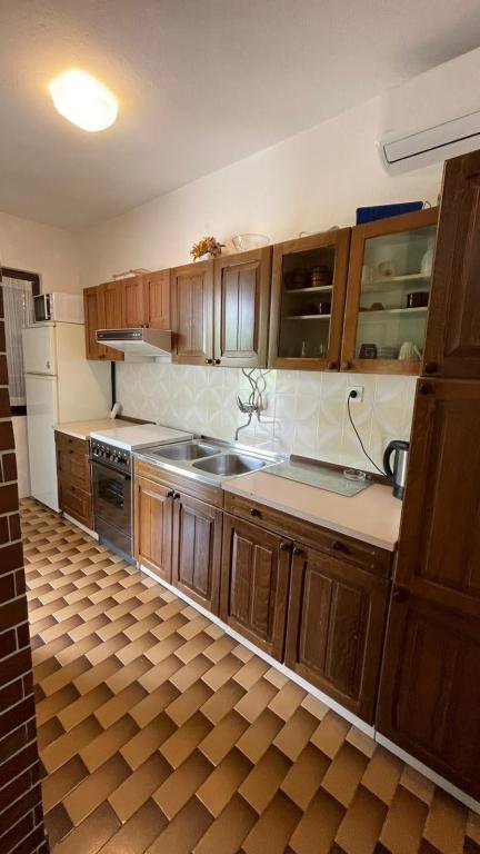 Družinska hiša z 2 velikima apartmaja 80m2 obdana z zelenjem s prijaznimi gostitelji. Miren del Krka z družinskimi hišami. Družina najema že več kot 30 let. Zgornje stanovanje vsebuje veliko teraso s čudovitim razgledom, kuhinjo in jedilnico, dnevno sobo, 2 spalnici in kopalnico. Spodnji apartma vsebuje teraso v senci, kuhinjo in jedilnico, dnevno sobo, 2 spalnici in kopalnico. Objekt se nahaja 10min hoje do morja. Bližina trgovin, restavracij in bencina je 3 min hoje. Zasebno parkirišče. .