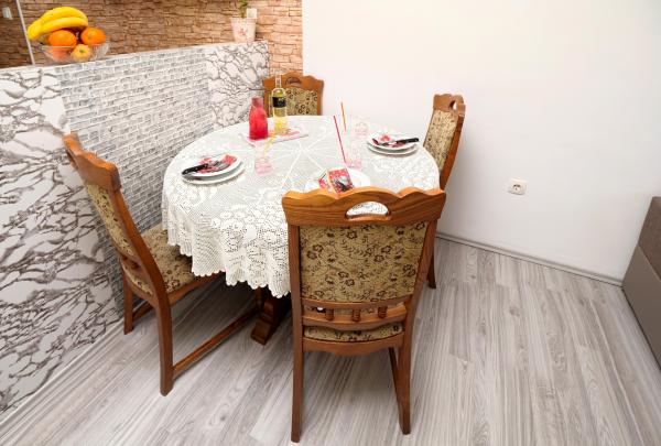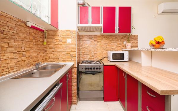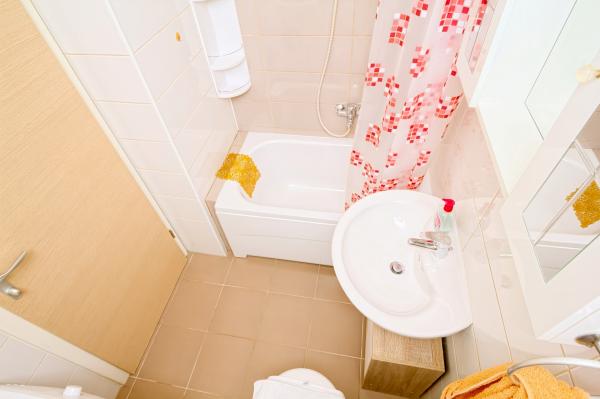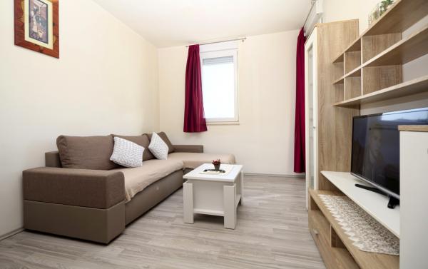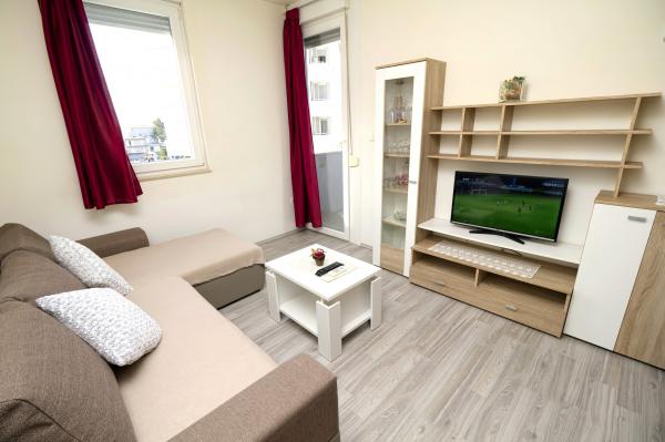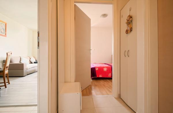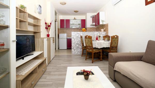 Enosobno stanovanje v zrgadi v prvem nadstropju - nova stavba, v celoti opremljena in opremljeno. Sasotji hodnik, dnevno sobo, jedilnico in kuhinjo, spalnico in kopalnico. Majhen balkon s pogledom na morje. Parkiranje v garaži objekta (rezervirano parkirno), in pred stavbo (skupna parkirišča).