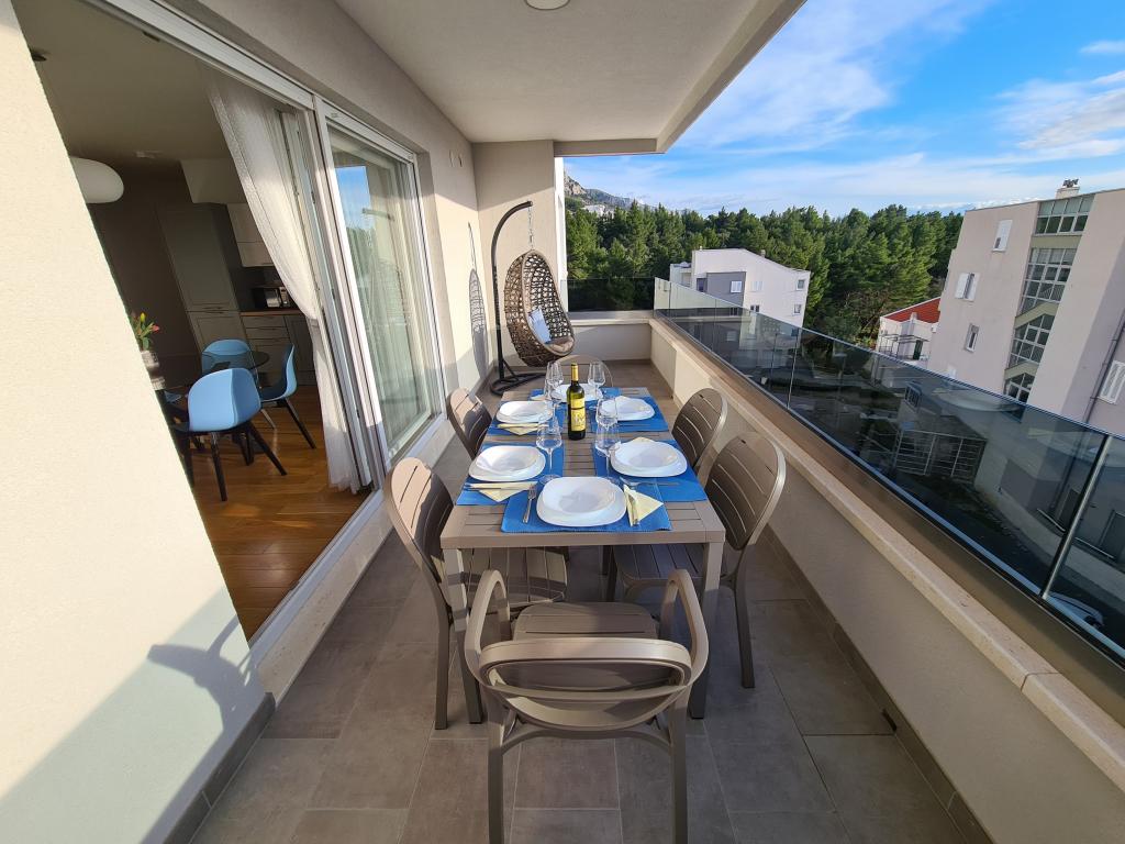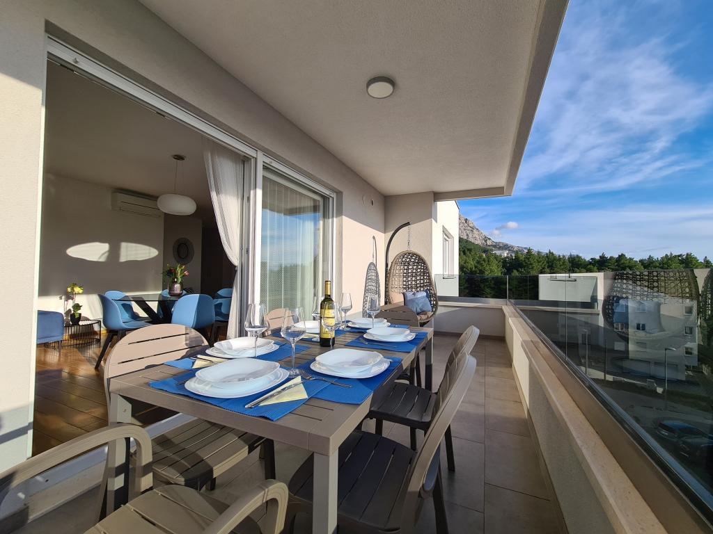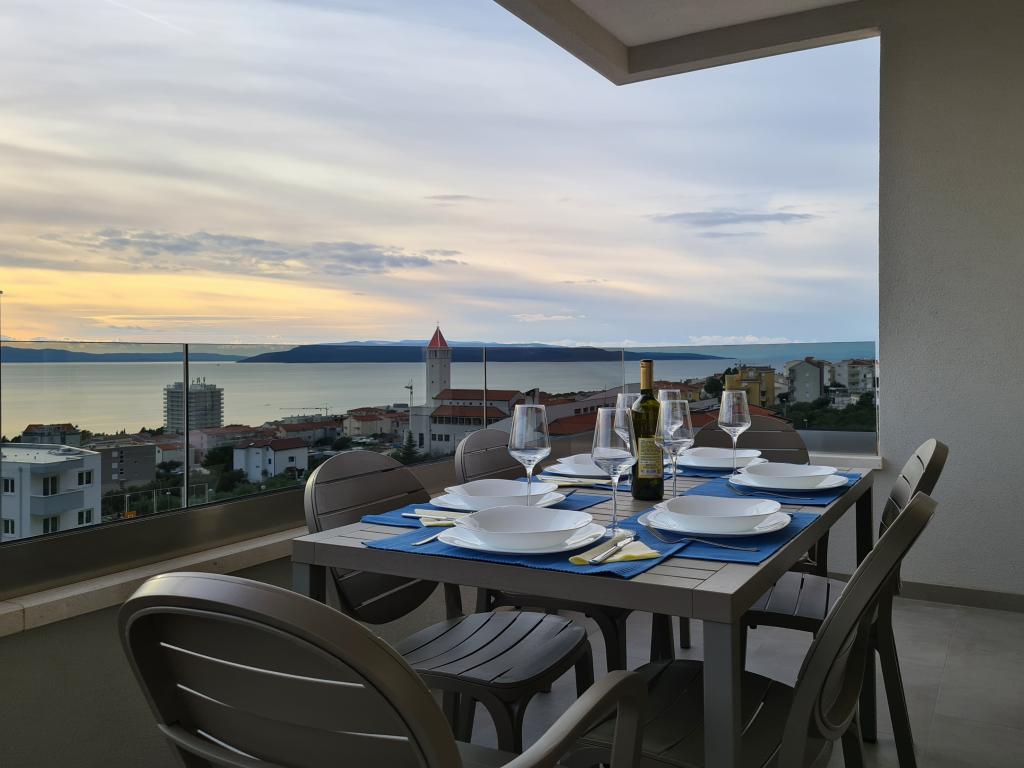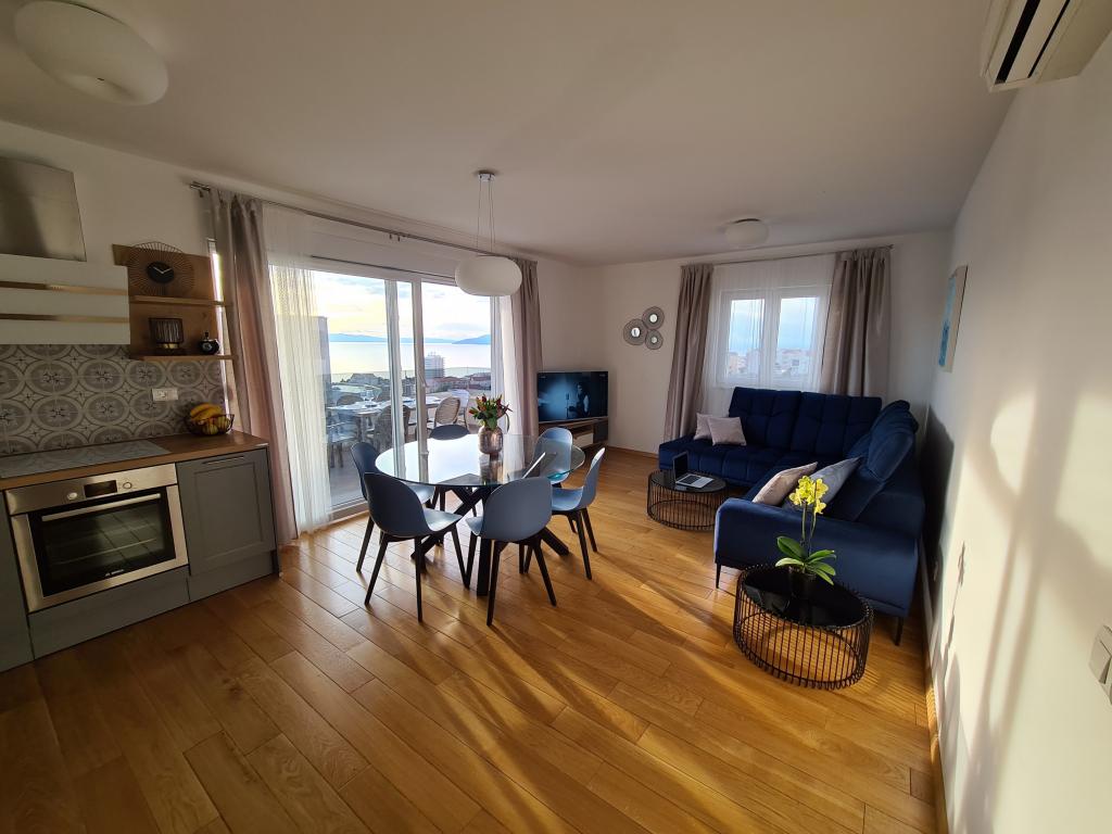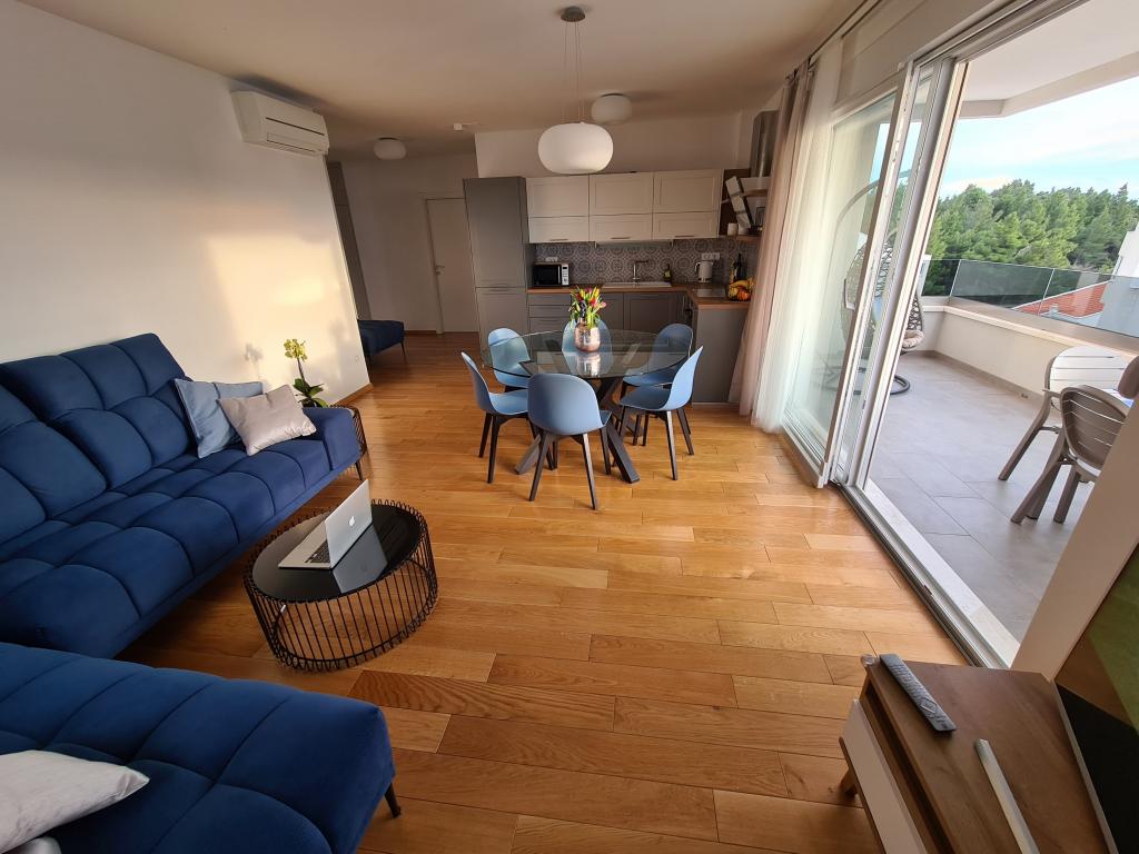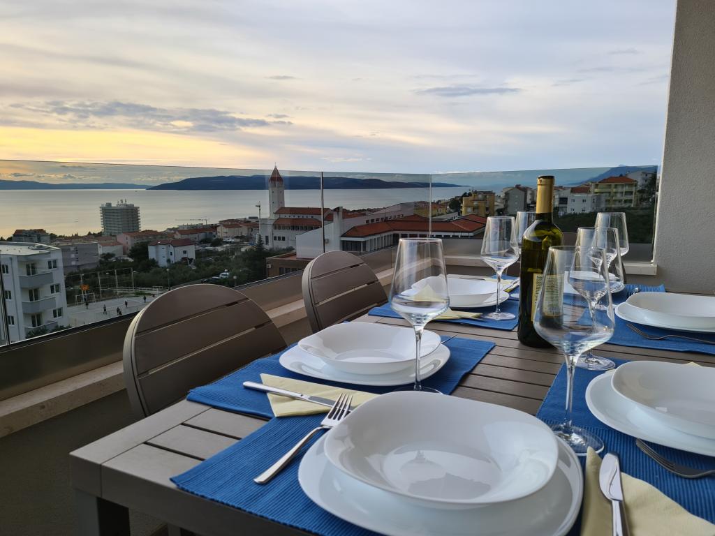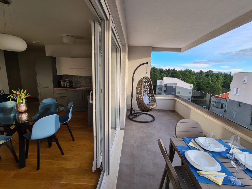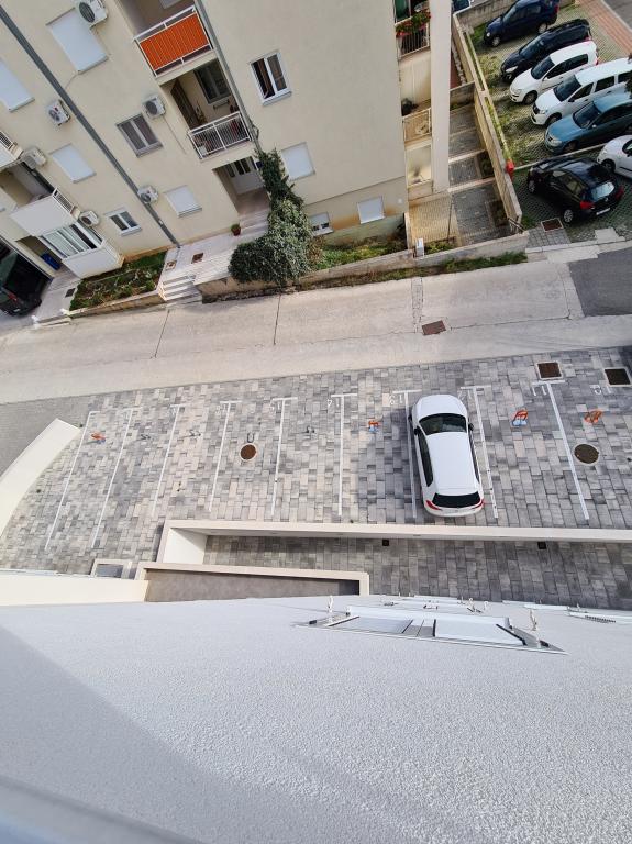 V 4. (najvišjem) nadstropju novozgrajene stavbe z dvigalom v mirni družinski soseski se nahaja južno obrnjeno novo prenovljeno stanovanje velikosti 83 m2 z veliko dnevno sobo in polno kuhinjo (hladilnik, zamrzovalnik, mikrovalovna pečica, pomivalni stroj, pečica , štedilnik), 3 spalnice, od katerih sta 2 z zakonsko posteljo (160x200), tretja pa z enojno posteljo (90x200) in kavčem, ki lahko služi kot dodatno ležišče, na voljo pa sta še TV in PlayStation 4, ker je ta soba je zasnovan kot dodatna dnevna soba. Vsaka soba ima klimatsko napravo (skupaj 4). Apartma ima 2 kopalnici s tuši, pralni / sušilni stroj, likalnik, sušilec za lase, sef. Na voljo so bombažno posteljnina in brisače. Na prostornem balkonu velikosti 13m2 je dodatna jedilna miza za 6 oseb in viseči fotelj za uživanje v pogledu na morje ter otoke Brač in Hvar. Na voljo sta 2 parkirni mesti: 1 pred stavbo in 1 v garaži stavbe. Vse v apartmaju je novo, kakovostno in skrbno izbrano za maksimalno udobje naših gostov.