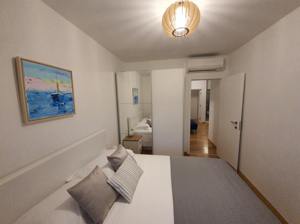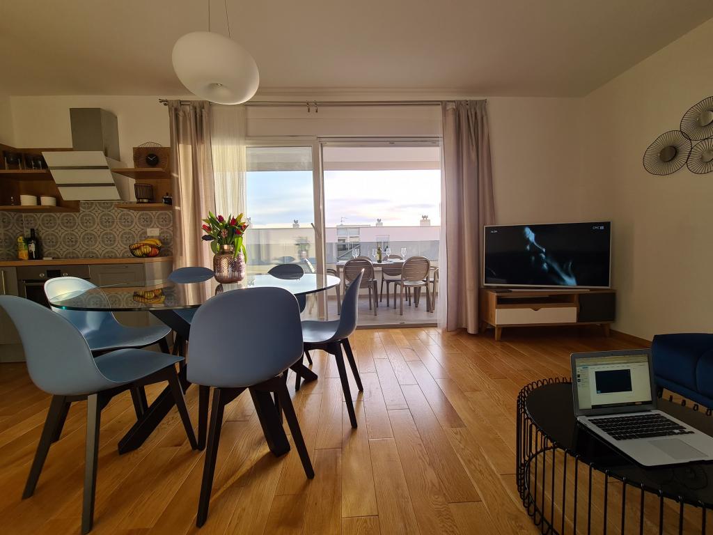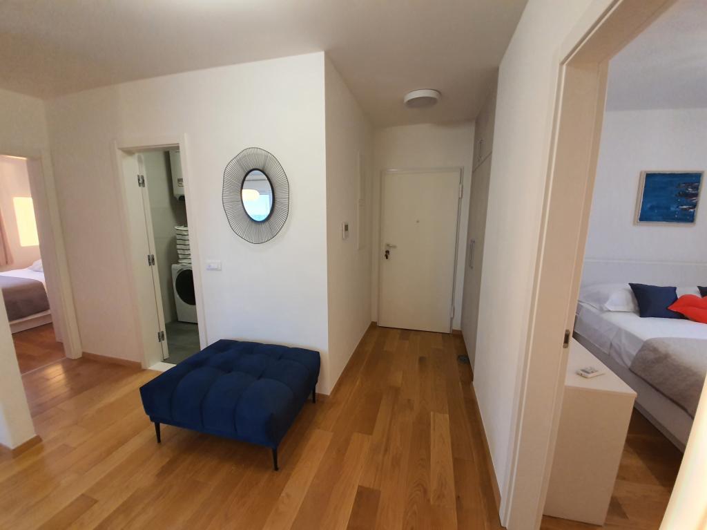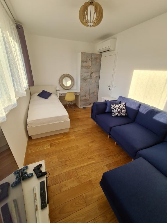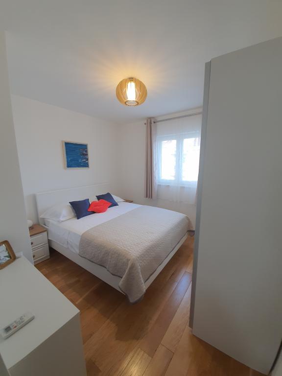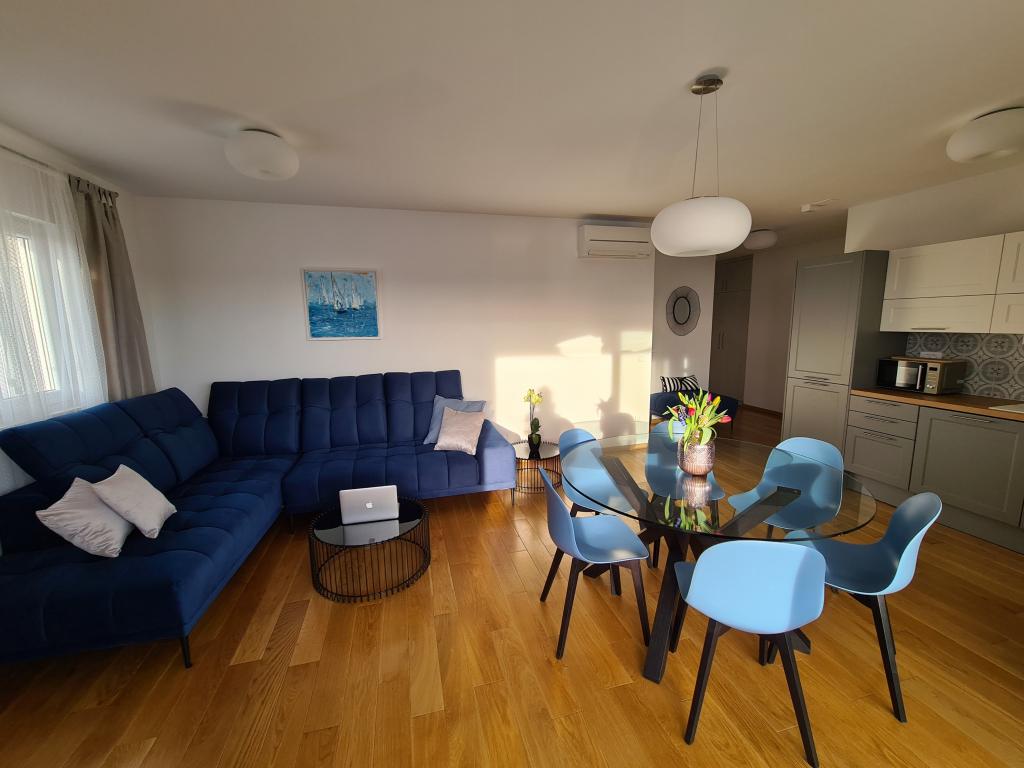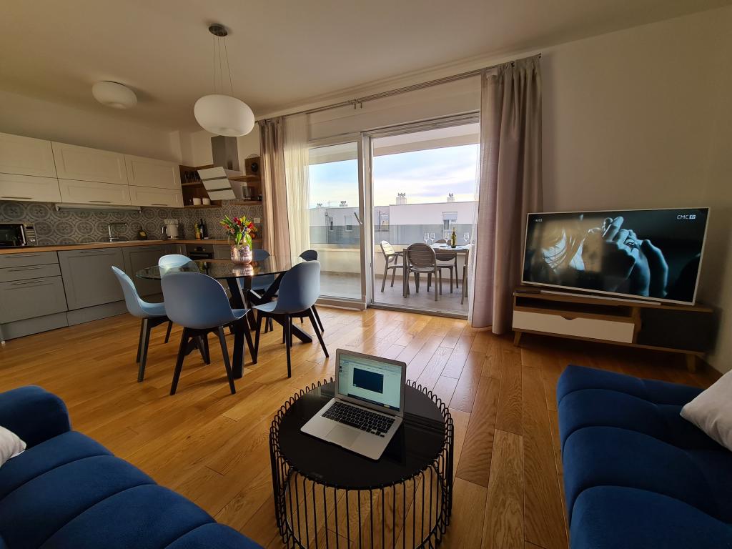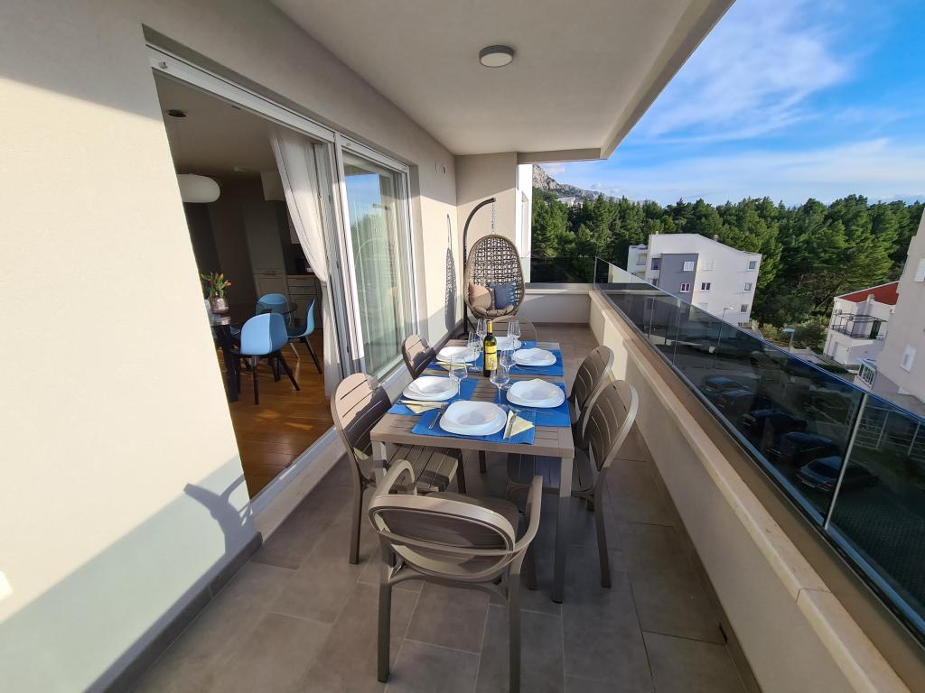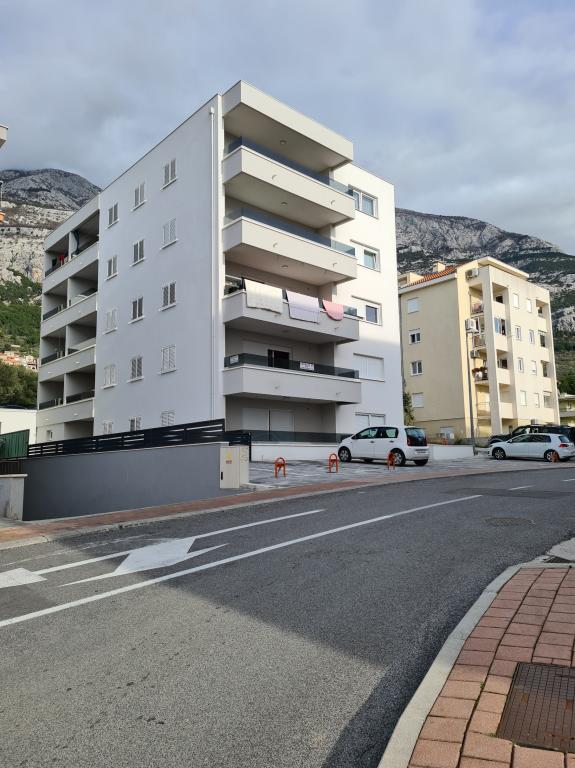 V 4. (najvišjem) nadstropju novozgrajene stavbe z dvigalom v mirni družinski soseski se nahaja južno obrnjeno novo prenovljeno stanovanje velikosti 83 m2 z veliko dnevno sobo in polno kuhinjo (hladilnik, zamrzovalnik, mikrovalovna pečica, pomivalni stroj, pečica , štedilnik), 3 spalnice, od katerih sta 2 z zakonsko posteljo (160x200), tretja pa z enojno posteljo (90x200) in kavčem, ki lahko služi kot dodatno ležišče, na voljo pa sta še TV in PlayStation 4, ker je ta soba je zasnovan kot dodatna dnevna soba. Vsaka soba ima klimatsko napravo (skupaj 4). Apartma ima 2 kopalnici s tuši, pralni / sušilni stroj, likalnik, sušilec za lase, sef. Na voljo so bombažno posteljnina in brisače. Na prostornem balkonu velikosti 13m2 je dodatna jedilna miza za 6 oseb in viseči fotelj za uživanje v pogledu na morje ter otoke Brač in Hvar. Na voljo sta 2 parkirni mesti: 1 pred stavbo in 1 v garaži stavbe. Vse v apartmaju je novo, kakovostno in skrbno izbrano za maksimalno udobje naših gostov.