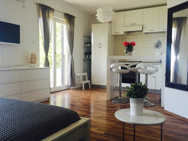 Beautiful novo obnovljeni apartmaji v predmestju mesta Makarske, Veliki hrib, ki se nahaja na pobočjih gora strmine, zahodno od mesta. Apartmaji imajo veliko zakonsko posteljo, kuhinjo in jedilnico in ločeno kopalnico. Gostje, tudi lahko uživajo in kosilo na teraso. Apartmaji se nahajajo v luksuznem letovišču makaraskog obali, gosti jo pogosto imenujemo oaza miru in tišine, in je idealen za vse ljubitelje adrenalinskega športa, kolesarjenje in padalstvo. Mi smo le 6 minut vožnje od mestnega vrveža, restavracije in nočno življenje. Vsi gostje prejmejo brezplačno WIFI internet in brezplačno parkiranje predhodno rezervacijo. Vse namjještaj je popolnoma nov glede stanovanj prenovljenih poleti leta 2015. Vsak apartma je opremljen z LCD televizijo in novo blagovno znamko kuhinjskih aparatov. Mi smo odlična izbira za ljudi, ki resnično cenijo svoje počitnice, mirno spanje, čist gorski zrak, čudovite peščene plaže v Makarski rivieri.