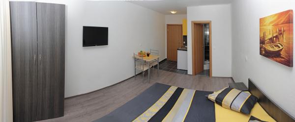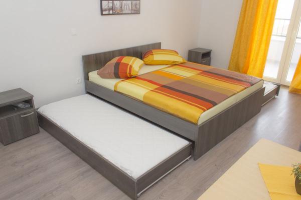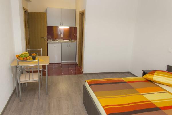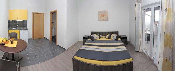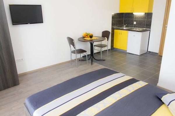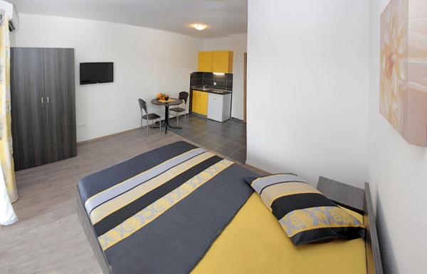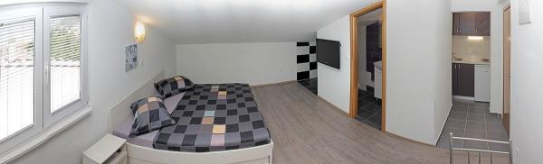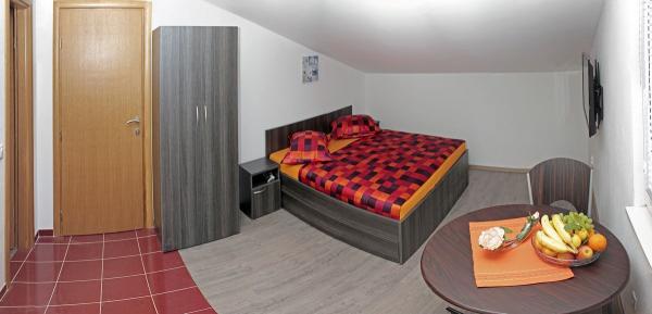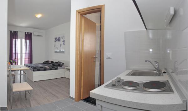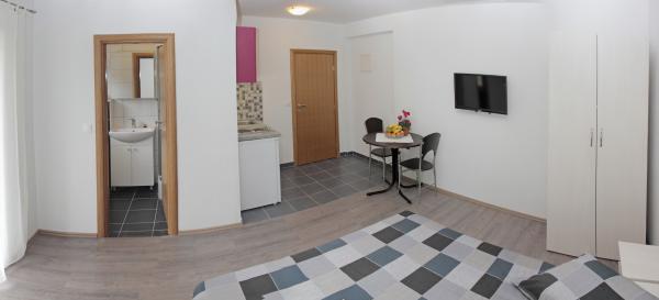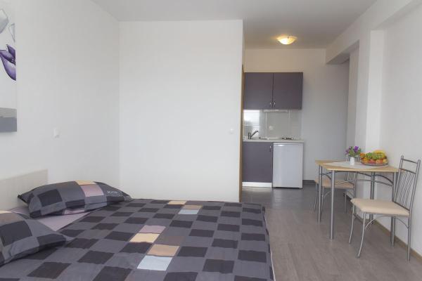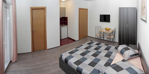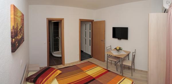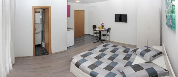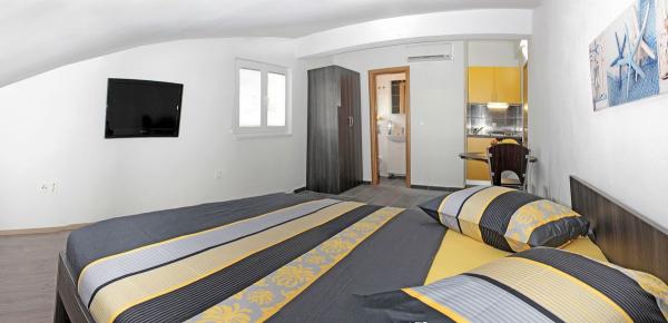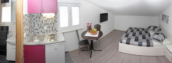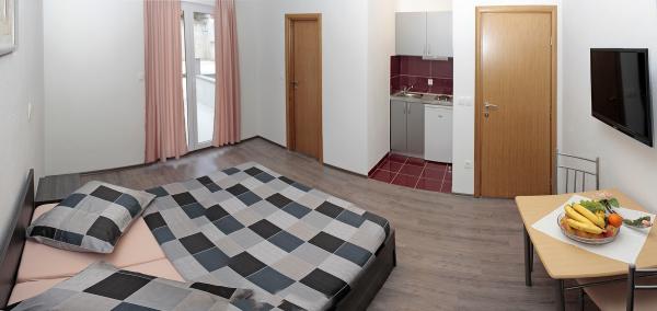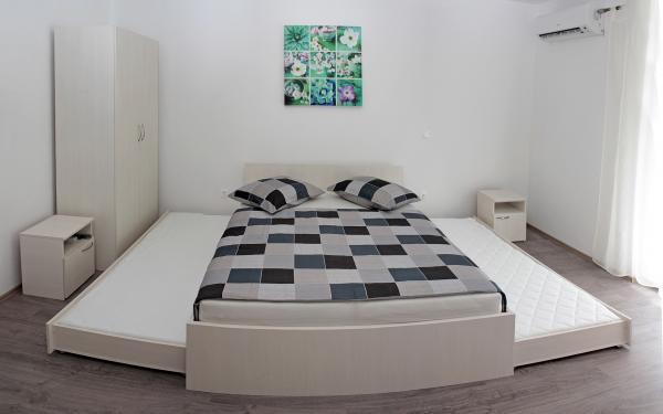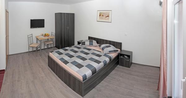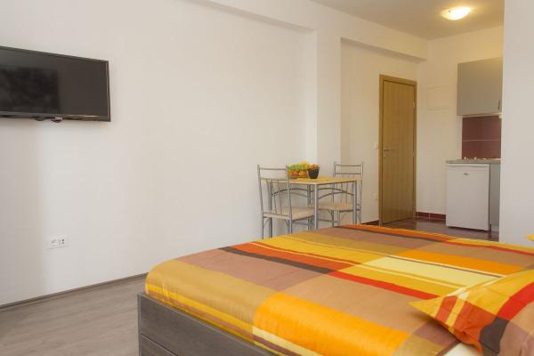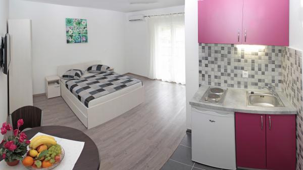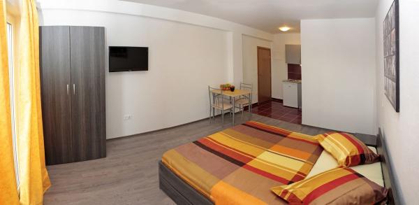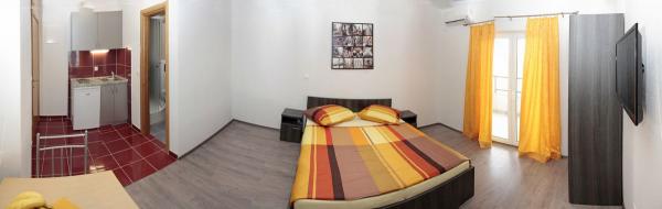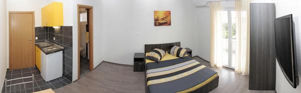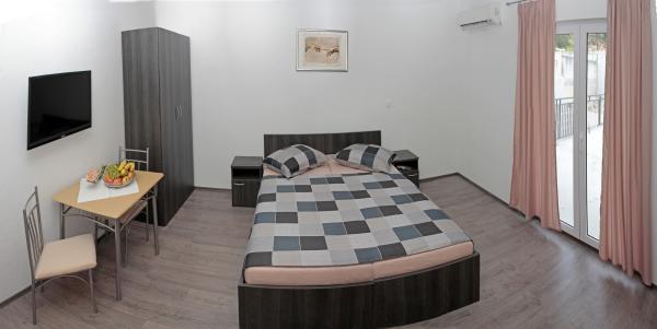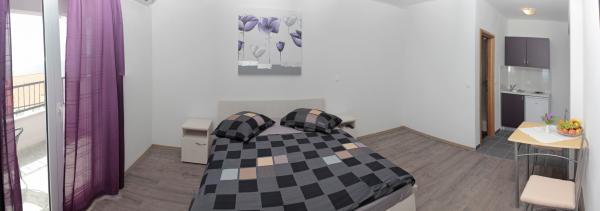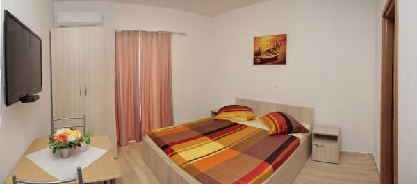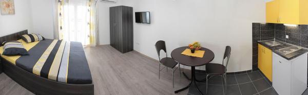 Vila se nahaja na atraktivni lokaciji, v bližini je več barov, lekarna, supermarket, tri trgovine, bankomat, cerkev, itd Vsi apartmaji so novi in vsi ukuhinju imajo, klima, Wi-Fi, SAT TV, parkirni prostor v stavbi, teraso s pogledom na morje ali gore ali skupno teraso, WC / tuš / kopalnico kabinet. Apartmaji so napovedali za 2 april 1-08 oseb. Naša vila se nahaja na atraktivni lokaciji, cca. 450m od morja (7-8mn. Walk) in pribl. 800m od mesta (15 min. Hoje). Vsak studio-apartma / stanovanje ima svojo kopalnico, teraso, zakonska postelja pomožno ležišče, kuhinjo, klimatsko napravo, satelitsko televizijo, mize in stoli, Wi-Fi internet, parkirišče.