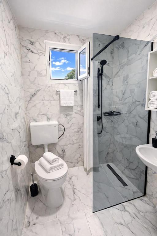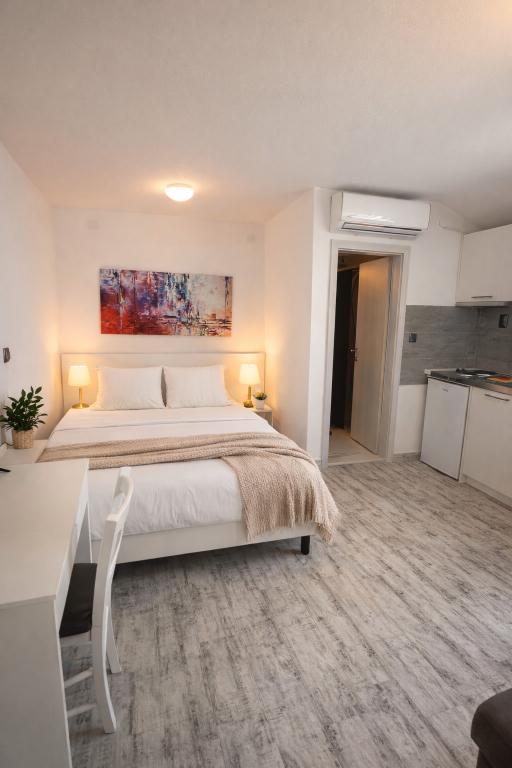 Villa Dalmacija se nahaja v Makarski, le 2 minuti hoje od plaže, z brezplačnim parkirnim mestom. Vsi studii in apartmaji imajo klimatsko napravo, majhno kuhinjo s štedilnikom in osnovno opremo, manjšim hladilnikom, lastno kopalnico in satelitsko TV. Studio 2+1: en studio s francosko posteljo in raztegljivim kavčem za 1 osebo, balkon (garsonjera v prvem nadstropju nima balkona). Studio 3+1: ena spalnica s francosko posteljo in raztegljivim kavčem za 1 do 2 osebi, zaprta mansarda, visoko pritličje. Apartma 2+2: spalnica z zakonsko posteljo in dnevna soba z raztegljivim kavčem za 2 osebi, terasa. Apartmaji se nahajajo v visokem pritličju, v 2. ali 3. nadstropju. Brezžični internet in parkirišče sta brezplačna.
