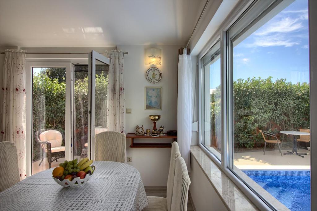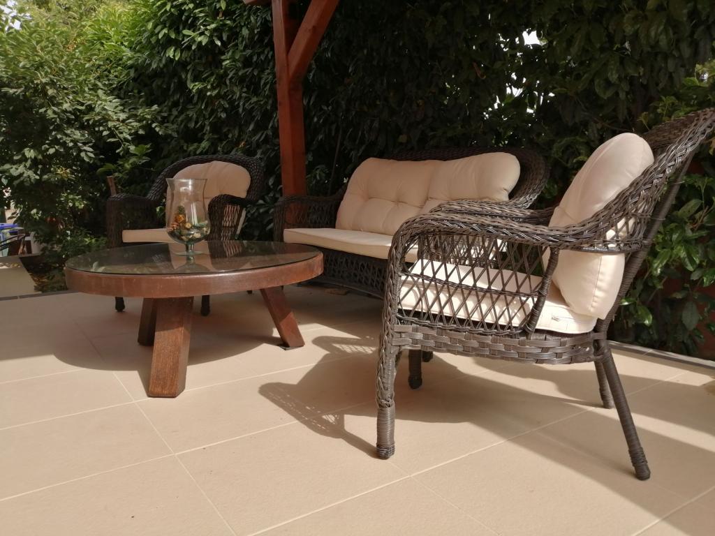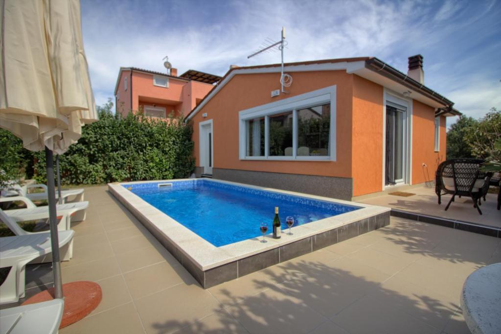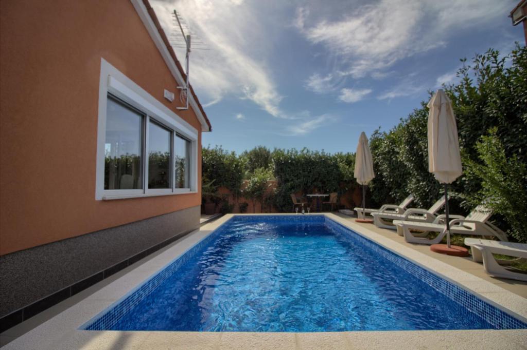 Popolnoma opremljena vila z bazenom. Obstaja zasebni zunanji bazen, vrt, žar, brezplačen brezžični internet. brezplačno parkirišče. Hiša ima 100m2 bivalne površine, obsega popolnoma opremljeno kuhinjo in jedilnico, dnevno sobo, dve spalnici in popolnoma opremljeno kopalnico z bidejem in pralnim strojem. Dnevna soba ima satelitsko televizijo in DVD. Hiša je oddaljena 600 m od najbližje plaže in se nahaja na mirni lokaciji. Veselimo se vašega prihoda!