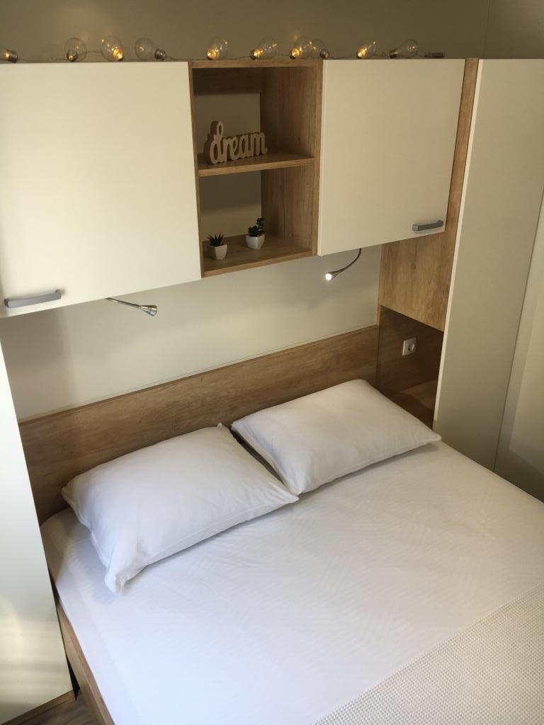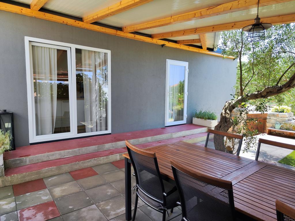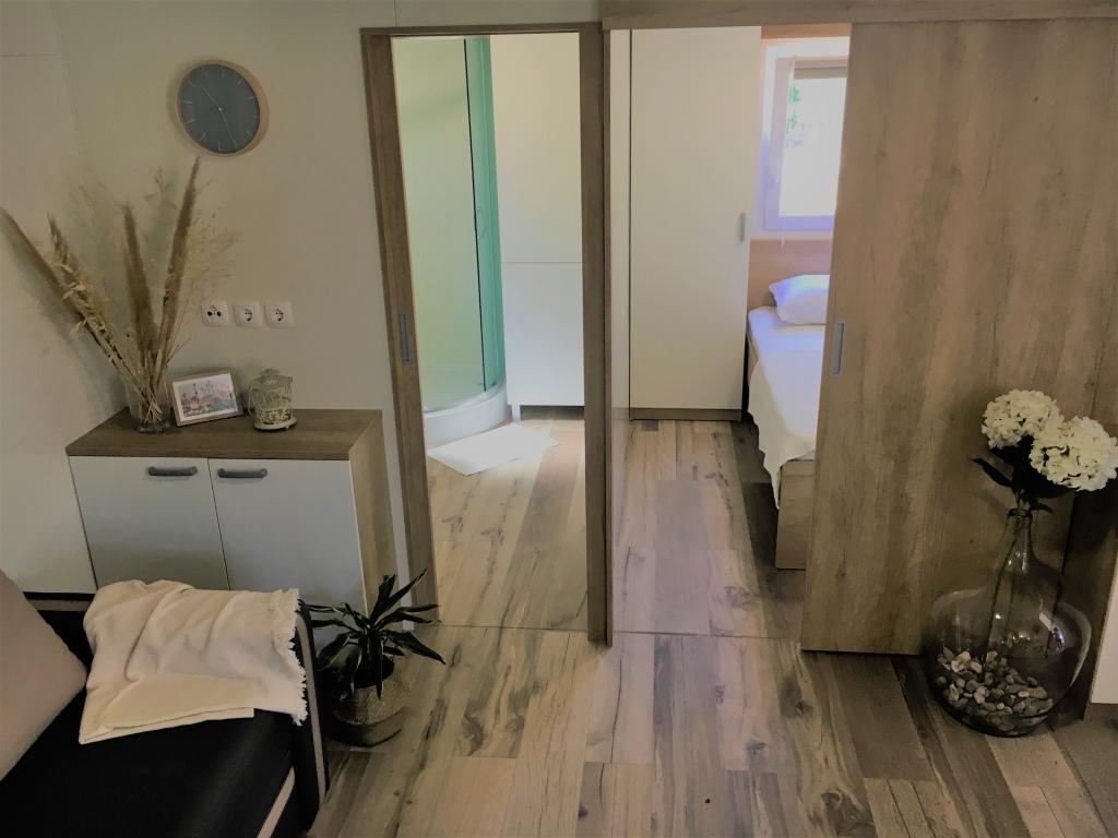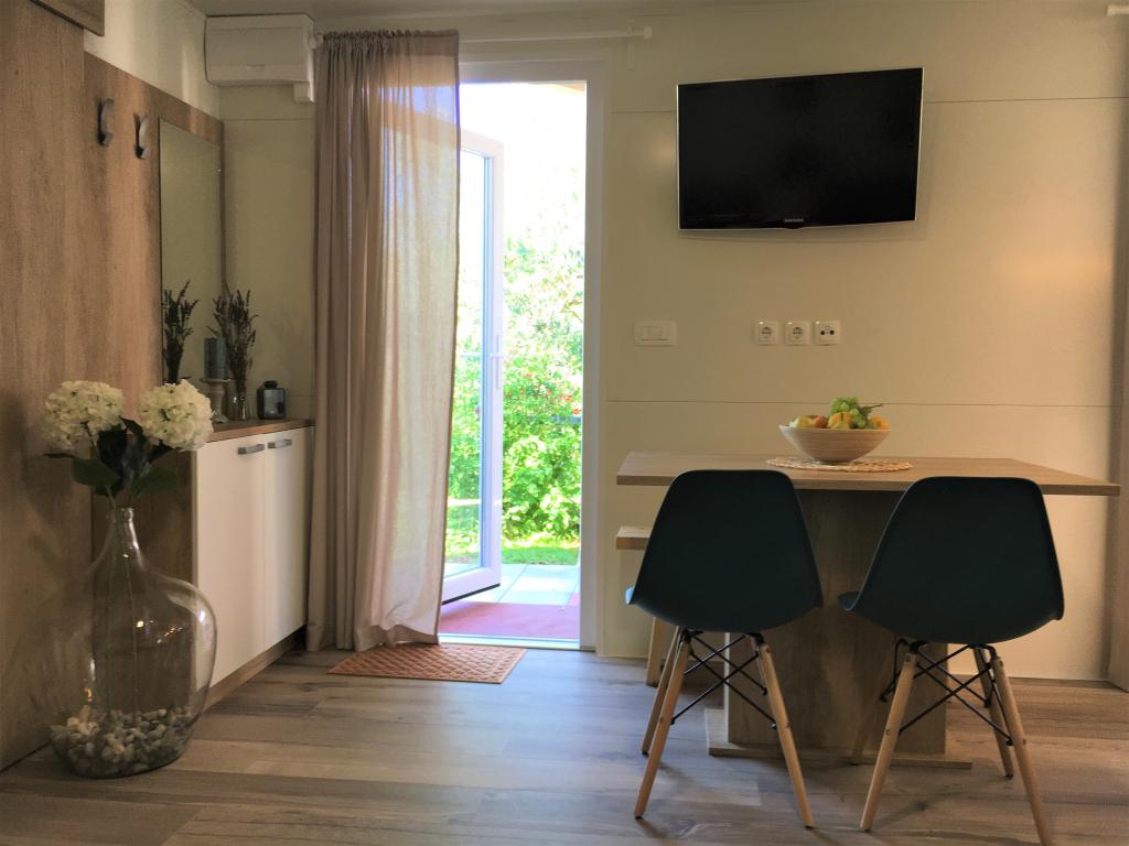 Mobilna hiška na vrtu, polnem oljk in zelenja, idealna za družine in ljudi, ki imajo radi zasebnost. Moderna in sodobno opremljena hiša, le 400 metrov od glavne, peščene plaže Slanice, in 10 minut hoje od centra. Bližina restavracij, kavarn, trgovin...