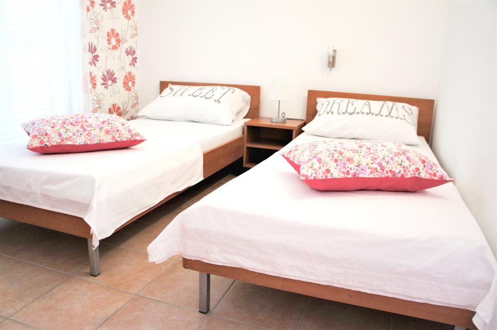 Popolnoma in moderno opremljeno stanovanje se nahaja v višjem pritličju manjše stavbe. Apartma je sestavljen iz: Kuhinja: opremljena z vsem potrebnim za prijetno bivanje: - Dnevna soba s klimatsko napravo in LCD TV. V dnevnem delu je tudi kavč, ki se po potrebi lahko spremeni v udobno ležišče. -Popolnoma nova kuhinja, popolnoma opremljena (vključuje kuhalno ploščo, pomivalni stroj, pečico, celotno posodo, mikrovalovno pečico). Sestavljen je iz 2 spalnic: Soba 1: je sestavljena iz ene zakonske in ene enojne postelje Soba 2: sestavljena iz 2 enojnih postelj WC-tuš kabina, z vsemi sanitarnimi elementi in pralnim strojem. Posebnost apartmaja je velika terasa na južni strani, v kateri lahko uživate ves dan. Na terasi je zunanja jedilnica in žar. Na terasi je velika oljka, ki daje naravno senco ves dan. Tik pred apartmajem je zasebno parkirišče.