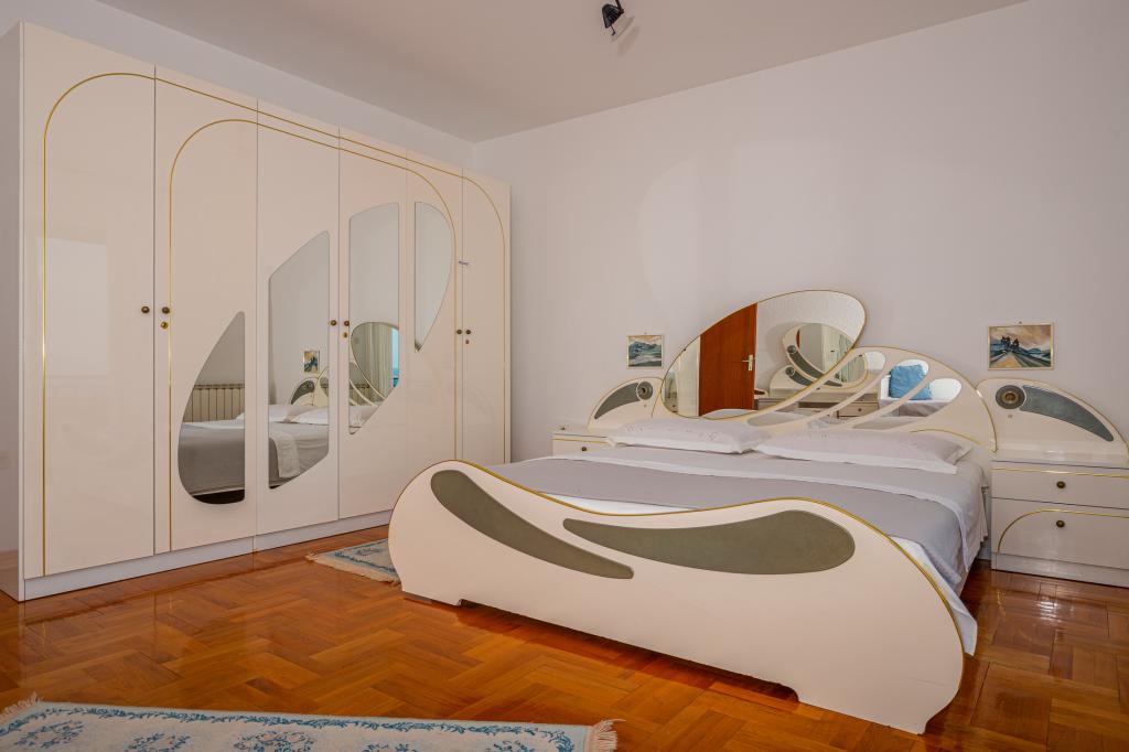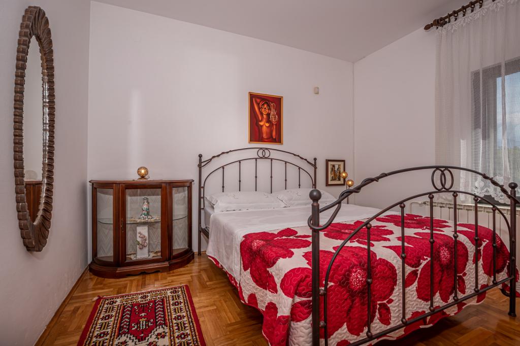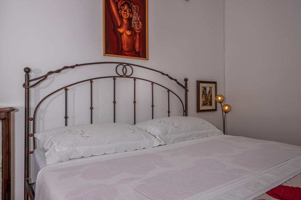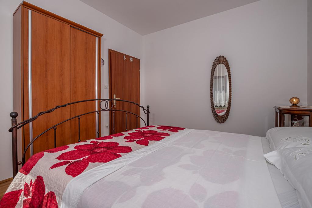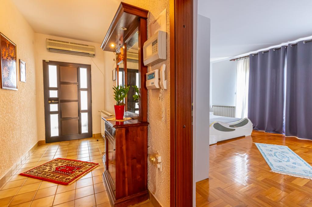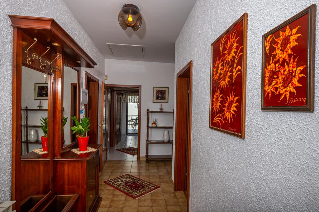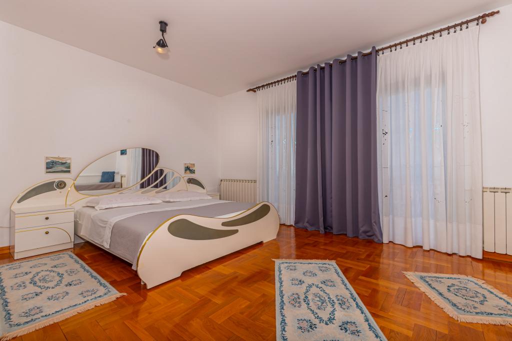 Apartma Laura se nahaja v družinski hiši. V prvem nadstropju hiše so 3 spalnice, 2 kopalnici s tušem, kuhinja z balkonom. Dve spalnici imata balkon s pogledom na morje. Skupna velikost tega dela stanovanja je 100m2. Apartma Laura je edini apartma v objektu, ki se oddaja, tako da boste med poletnimi počitnicami imeli popolno zasebnost. Na dvorišču je žar, ki je na voljo gostom. Morje in plaža sta le nekaj minut hoje po ulici, medtem ko je center mesta oddaljen 900 m od hiše.