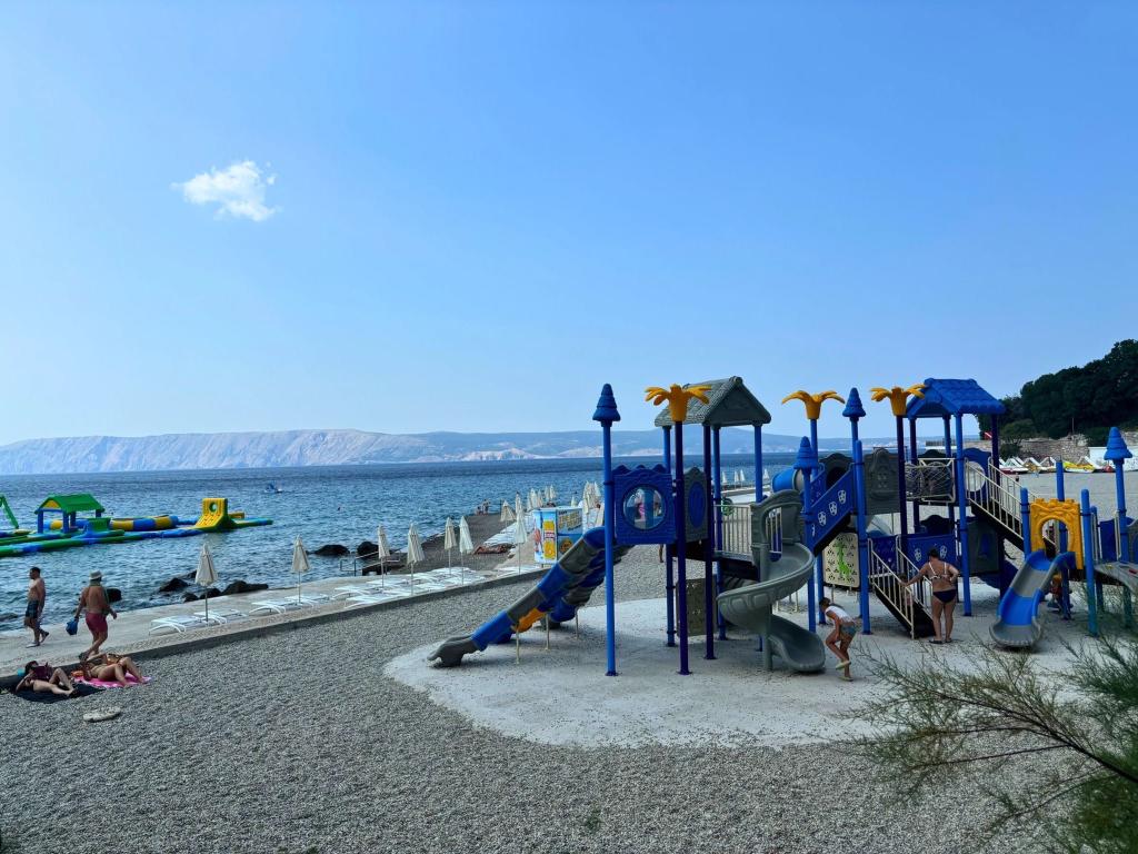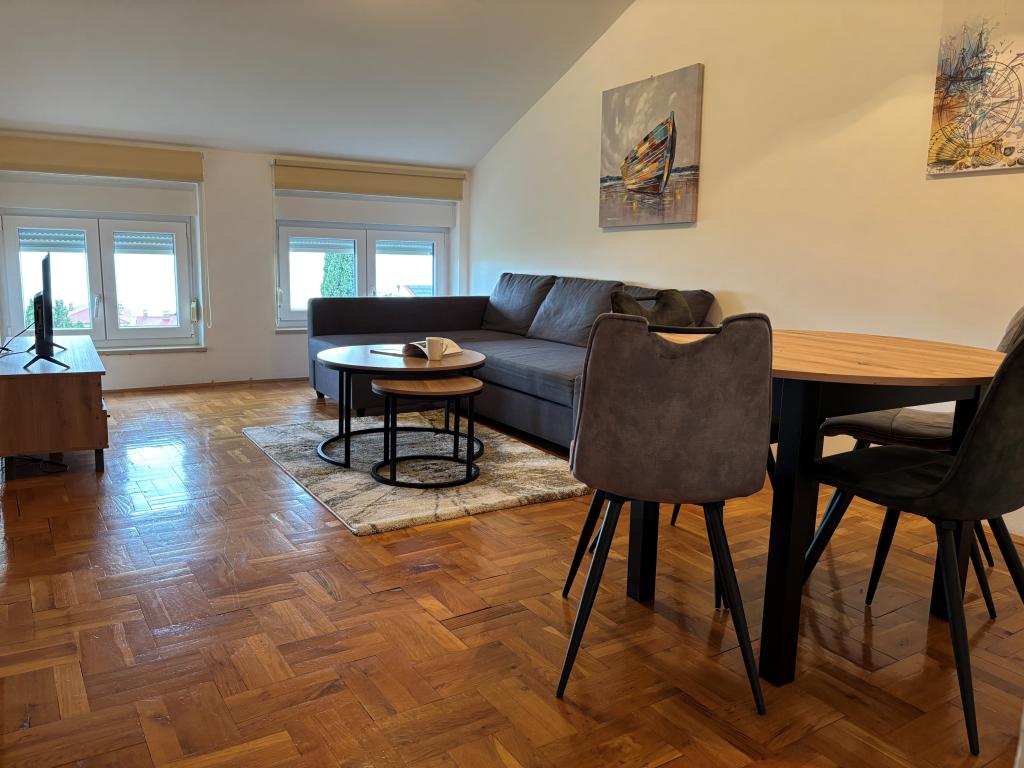 Apartma se nahaja v prvem nadstropju družinske hiše v mirnem delu mesta, s teraso v pritličju in pogledom na morje in otok Krk. Le nekaj minut hoje (3-5) od mestne plaže. Od centra mesta in tržnice je oddaljen 200 metrov. Bližina restavracij, trgovin ter zabaviščnih in športnih objektov. Varovano parkirišče, SAT-TV, Wi-Fi. Gostom apartmaja je na voljo žar in jedilnica na vrtu.