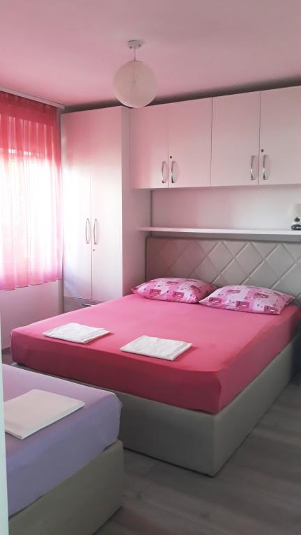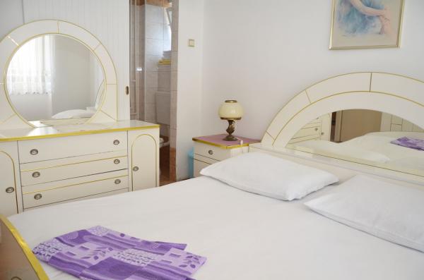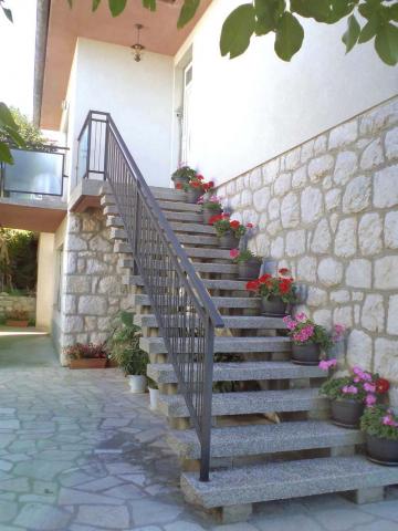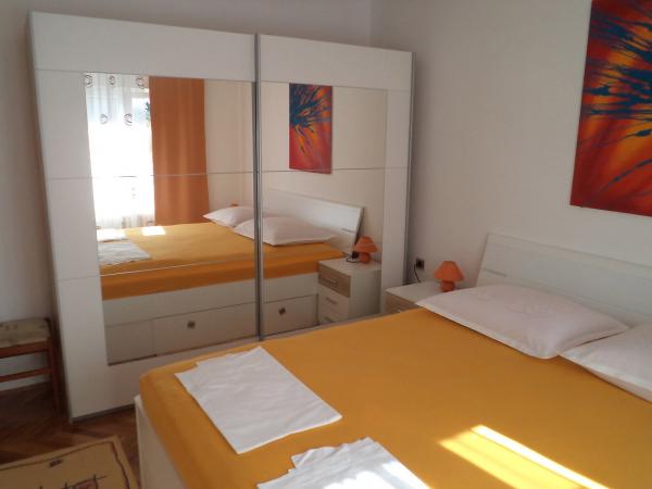 Družinska hiša z dvema popolnoma in moderno opremljenima apartmajema (pritličje in nadstropje) se nahaja v mirnem delu mesta. Od centra mesta je oddaljen le nekaj minut hoje, od mestne plaže pa 5 minut hoje. Apartma 1 ima lastno teraso, dve spalnici in dnevno sobo z raztegljivim kavčem, kjer lahko po potrebi spita dve osebi, medtem ko ima apartma 2 3 spalnice in 4 balkone. Vsak apartma ima dve kopalnici in kuhinjo z jedilnico. Uporabnikom obeh apartmajev je na voljo žar z jedilnico.