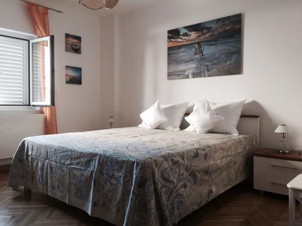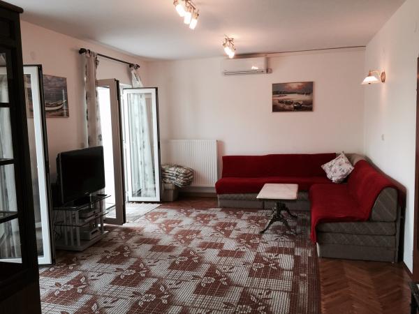 Popolnoma luksuzno opremljene apartmaje v mirnem delu Novega Vinodolskega. 300m od morja (5 min hoje) in 10 min peš do središča. Manjše stanovanje se nahaja v pritličju in velika v prvem nadstropju hiše. Notranjost majhen ima kuhinjo, dnevno sobo s kavčem, kopalnico in spalnico. Velik apartma ima veliko kuhinjo, dve kopalnici, velika teras, balkonov, dnevna soba in tri prostorne spalnice s šestimi ležišči. Obstaja popolna vrt z žarom. Pralni stroj na zahtevo. Veliki popusti v pred-sezoni.