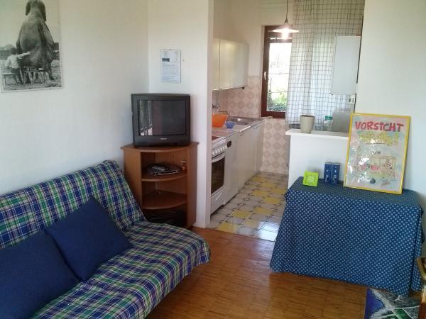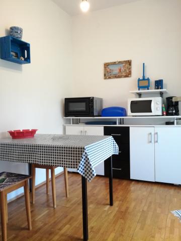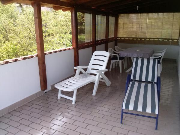 Št. Apartmaja 1 (30m2) se nahaja v pritličju družinske hiše. Sestavljen je iz dnevne sobe in spalnice, kuhinje, kopalnice, shrambe in velike terase, namenjen je za 2 osebi na zakonski postelji in do dve osebi na dodatnem ležišču v dnevni sobi. Opremljen je s televizijo, brezžičnim internetom, tuš kabino, hladilnikom, štedilnikom, mikrovalovno pečico, aparatom za kavo in popolnim pomivalnim strojem. Št. Apartmaja 2 (35m2 pokrita terasa 20m2) se nahaja v prvem nadstropju družinske hiše. Sestavljen je iz dnevne sobe in spalnice, kuhinje, jedilnice, kopalnice in velike terase. Namenjen je za 2 osebi na zakonski postelji in za največ dve osebi na dodatnem ležišču v dnevni sobi. Opremljen je s klimatsko napravo, TV, brezžičnim internetom, hladilnikom, štedilnikom, mikrovalovno pečico in polnim kuhinjskim pripomočkom. Skupni žar se nahaja na vrtu, medtem ko je parkirišče 50 metrov od hiše in se nahaja na javnem prostoru.