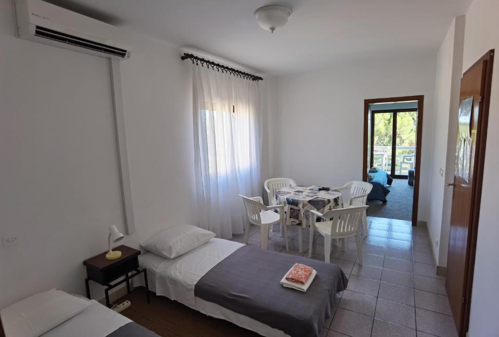 Namestitev se nahaja v zadnji ulici na zahodni strani Orebića. V bližini hotelskega kompleksa, tik ob borovem gozdu. Od morja in javnih plaž smo oddaljeni približno 2,5 min hoje. Obala s plažami je bogata s senco borovcev in črnike, na voljo pa so tudi bari in restavracije. Posebno privlačna je javna plaža pod hotelom Grand z zalivčkom in plitvim morjem s peskom na dnu. Vsi apartmaji imajo balkon - ložo, kjer v vročem vremenu in popolni tišini brez vetra zrak močno in prijetno kroži. Apartmaji z dodatnimi ležišči "2+2" in "2+1" so primerni za družine z dvema ali enim otrokom. Apartma "2+2" je opremljen z dvema, apartma "2+1" pa z eno klimatsko napravo. DOBRODOŠLI