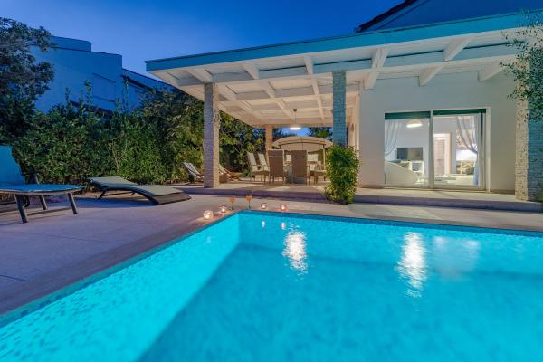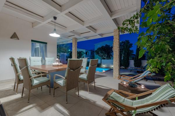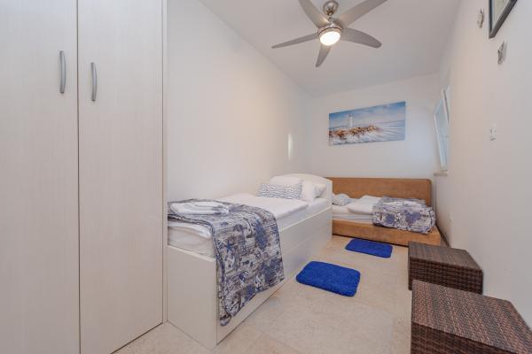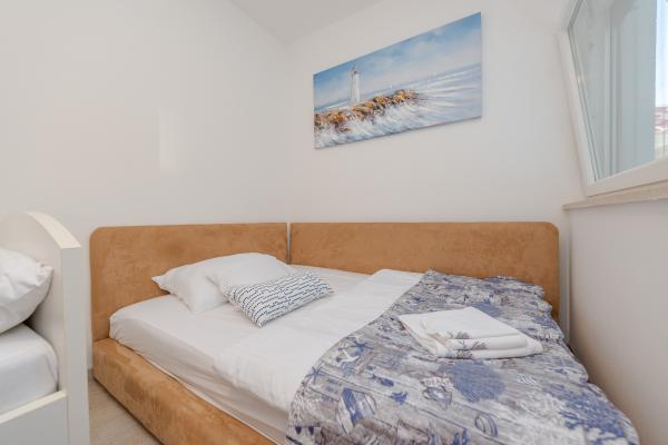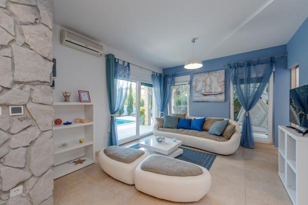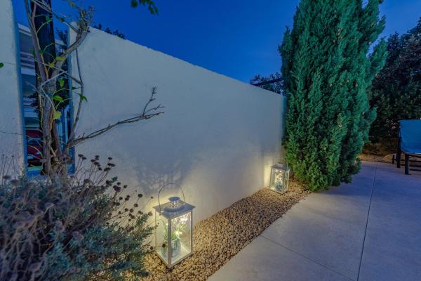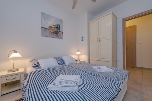 Apartma se nahaja v novejši stavbi, popolnoma je in moderno opremljen, na novo opremljen za prijetno in sproščujoče bivanje, oddaljen od morja približno 250 m. Nahaja se v pritličju stavbe. Ima ločen vhod, vrt, ki je razdeljen na prostor za sončenje ob bazenu, vrt in pokrito teraso, kjer potekajo dnevna in večerna srečanja. Obstaja velika miza na terasi in poleg mahalnega krova za počitek. Bazen v velikosti 26 m2 lahko uporabljajo samo gostje tega apartmaja. V vrtu so zasajene fige, v katerih lahko gostje uživajo v sadju, in okrašeno vrtnarstvo (lovorjeva češnja, ciprese, rožmarin, sivka in oleander). Gostje imajo zasebnost in mir. Notranja ureditev - dnevna soba in tri spalnice, 2 tuš kabina, 1 WC, shramba. Skupna uporabna površina stanovanja je 112 m2, od tega je 70 m2 zaprto. Stanovanje ima tudi dve parkirni mesti. V nekaj minutah hoje od apartmaja je trgovina, lekarna, ribarnica, frizer, domači pridelovalci sadja in zelenjave ...