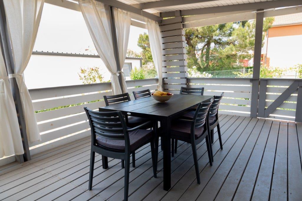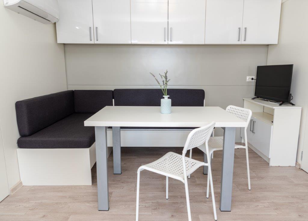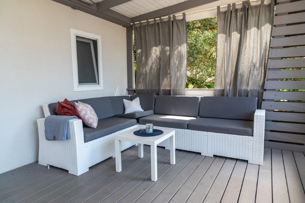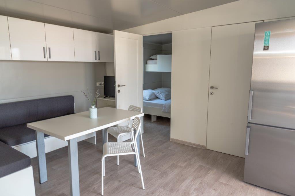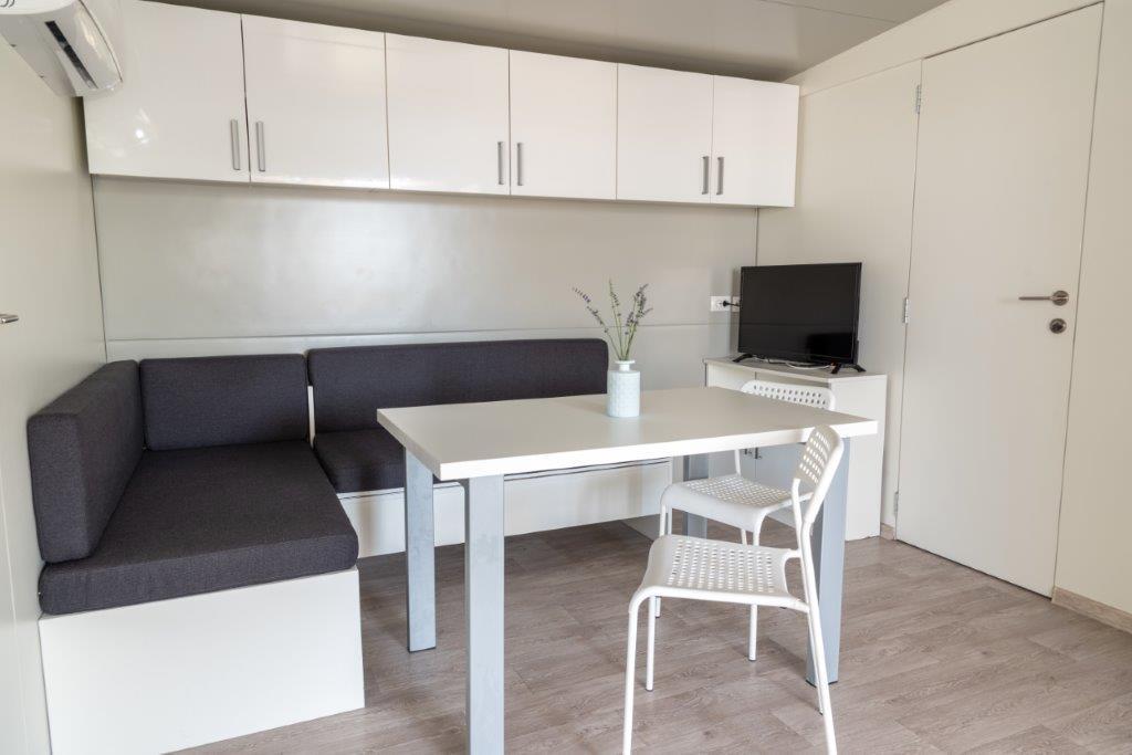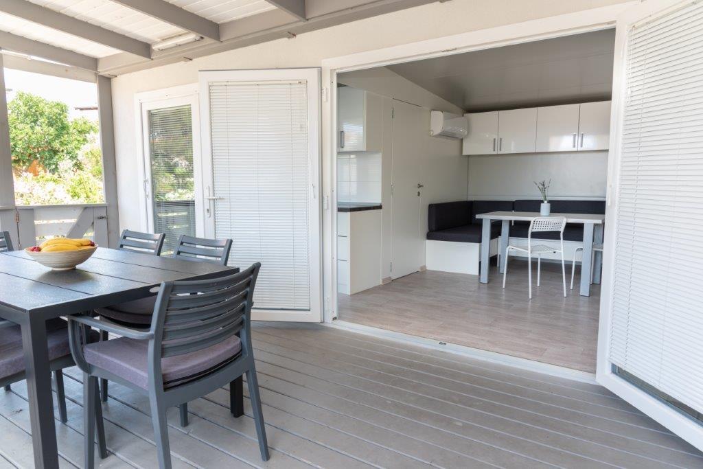 Mobilne hišice se nahajajo v središču Pakoštanov, tik ob glavni peščeni plaži z neposrednim pogledom na morje. Mobilna hišica ima dve spalnici, jedilnico, kuhinjo, stranišče in veliko teraso (5). Vsi gostje imajo na voljo žar. Gostom je na voljo parkirno mesto. Hišni ljubljenčki so dovoljeni, vendar se zaračuna doplačilo 7 €/noč na hišnega ljubljenčka. Imamo lasten privez za čolne in parkirišče za prikolice, ki sta gostom na voljo za doplačilo.