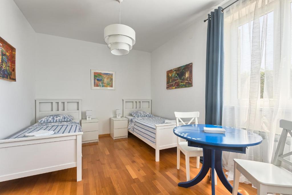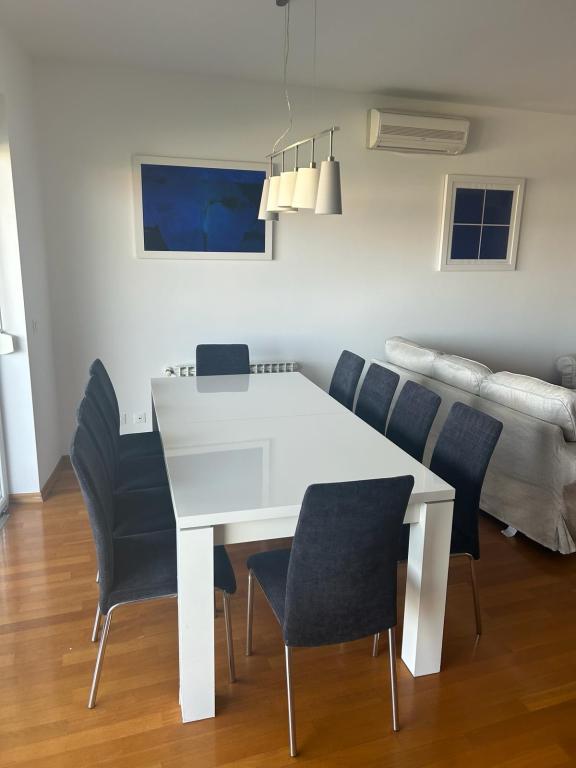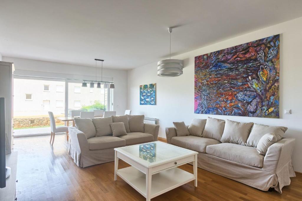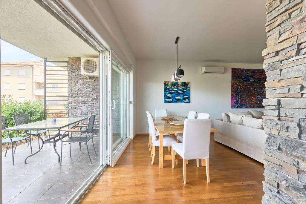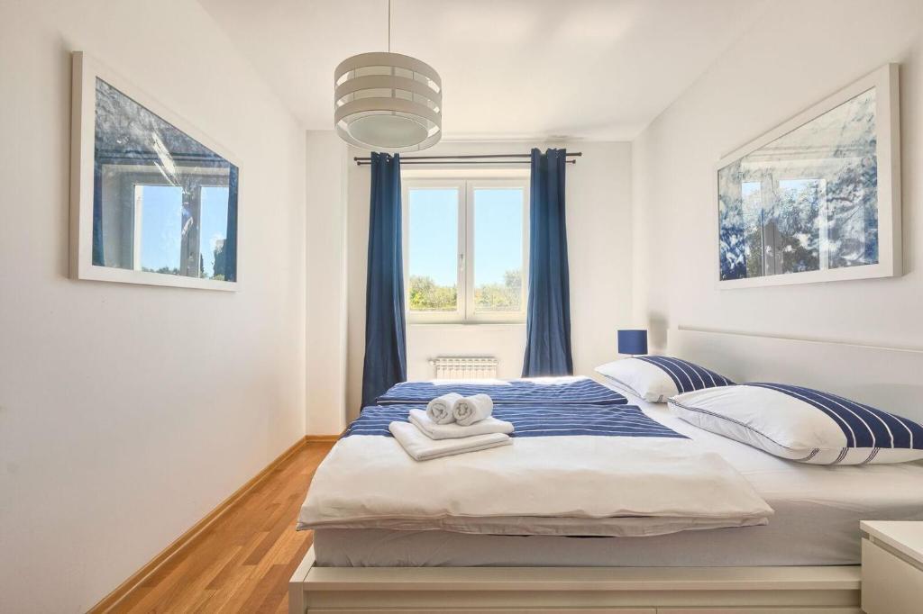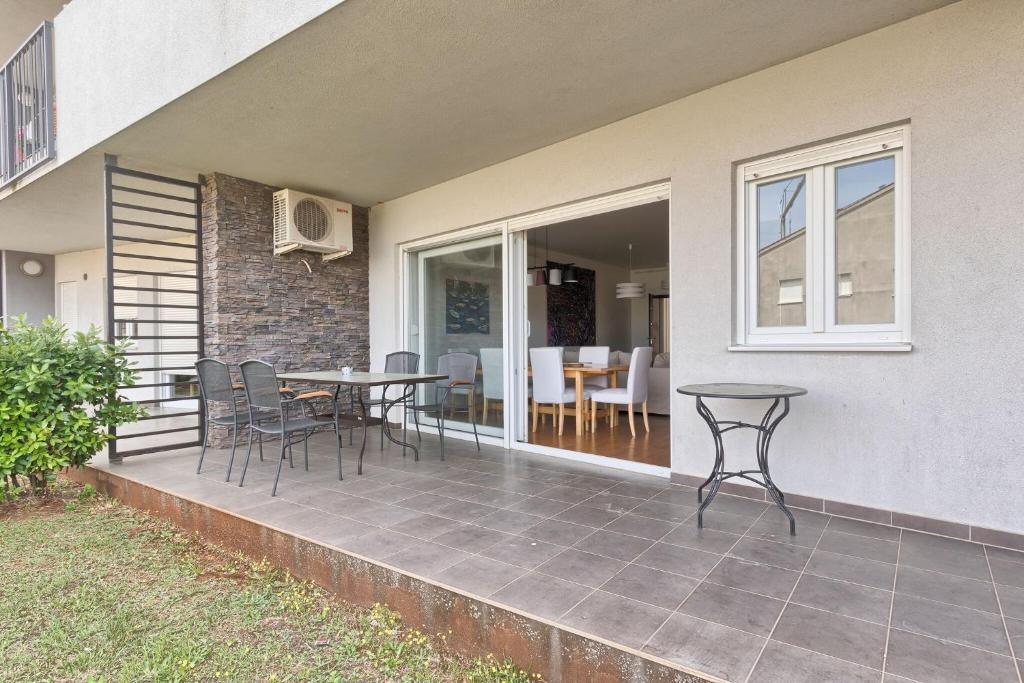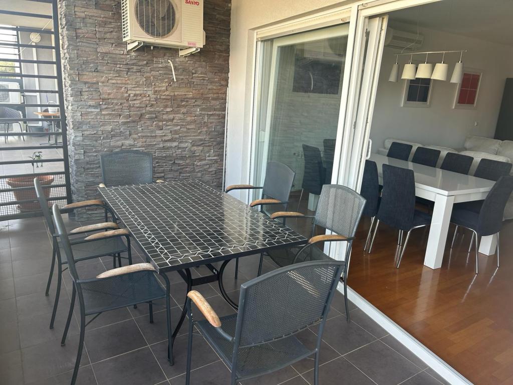 Turistična taksa nije vključena v ceno.Apartmaji obsegajo 3 prostorne spalnice, 1 stranišče opremljeno s pralnim strojem, 1 kopalnico z straniščem, opremljeno kuhinjo s pečico in pomivalnim strojem, dnevno sobo, teraso z vrtom, skupno letno kuhinjo in parkirno mesto. . Opremljene so z modernim pohištvom, klimatsko napravo, WiFi in Smart TV. Brisače in posteljnina so vključeni v ceno. Če se naveličate pripravljanja obrokov v apartmaju, lahko pečete na žaru na skupnem vrtu ali pečete v naši letni kuhinji! :)