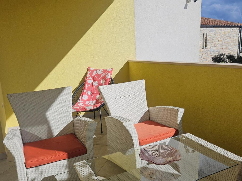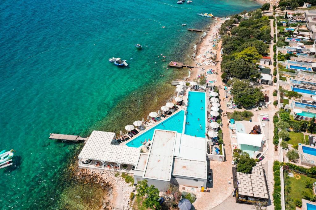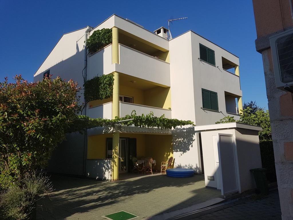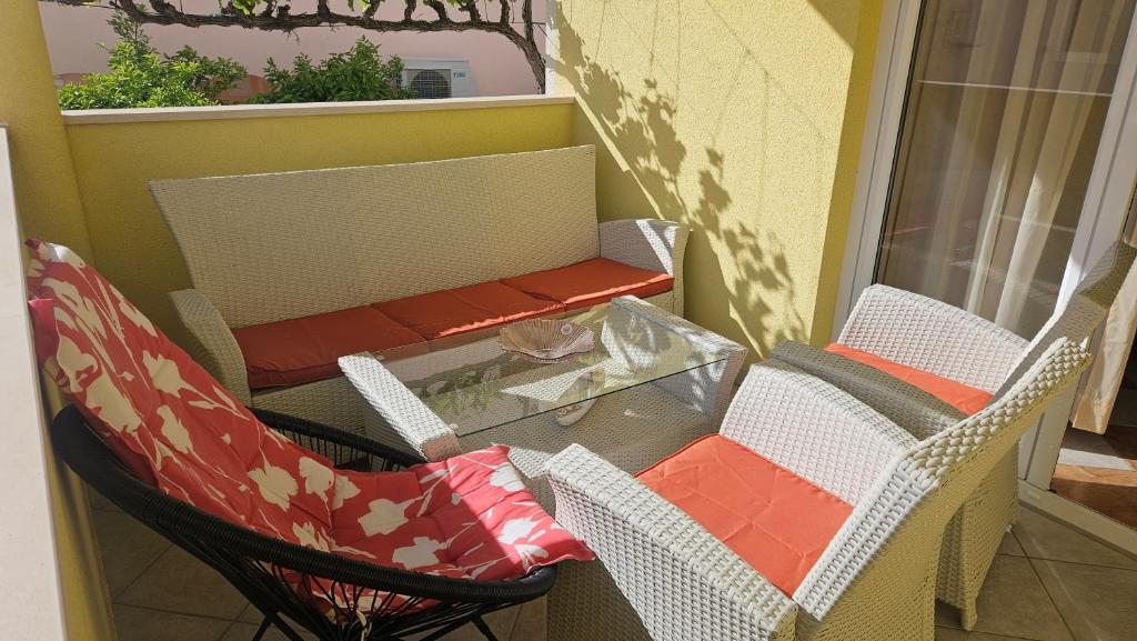 Turistična taksa je vključena v ceno.Kuhinja je opremljena s pripomočki za pripravo in serviranje hrane in pijače, jedilnim priborom ter kuhinjskimi aparati - hladilnikom, zamrzovalnikom, štedilnikom s pečico, pomivalnim strojem, opekačem kruha, aparatom za kavo, mikrovalovno pečico in grelnikom vode. Kuhinja je povezana z dnevno sobo, kjer je raztegljiv kavč za eno odraslo osebo ali dve. Kuhinja in dnevna soba sta klimatizirani. Apartmaja imata dve ločeni spalnici z zakonsko posteljo za dve osebi (skupaj 4 odrasli). Sobe so klimatizirane. Kopalnice so moderno opremljene in imajo tuš kabino ter sušilec za lase. Vsak apartma ima svojo teraso. Dostop do objekta z avtomobilom je odličen - za vsako stanovanje je zagotovljeno 1 parkirno mesto. Za tiste, ki radi tečejo, hodijo, kolesarijo in podobno, je na voljo zelo lepa promenada, dolga približno 5 km, ki je zvečer osvetljena. Oddaljenost od plaže je 50 m, od bazena za odrasle in otroke 100 m, od restavracije in supermarketa 40 m. V bližini je veliko polje z vinogradi, kjer je majhna restavracija-gostilna, kjer lahko dobro jeste in pijete lokalno vino.