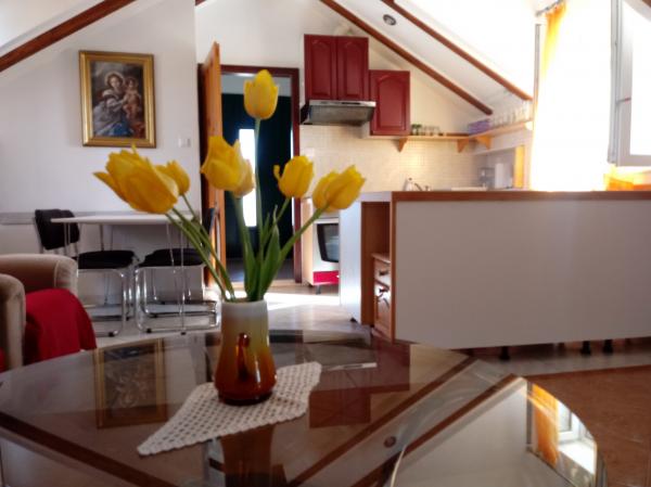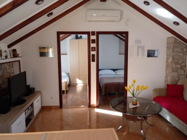 Moderno opremljeno stanovanje v zgornjem nadstropju stare hiše v tihem Primošten zaledju. Objekt se nahaja v vasi prhovo, manj kot 3 km od centra mesta, morja in lepih plaž. Idealen kraj za mirne počitnice, vendar z vsemi poletnimi znamenitosti in morske lepote na dosegu roke na.