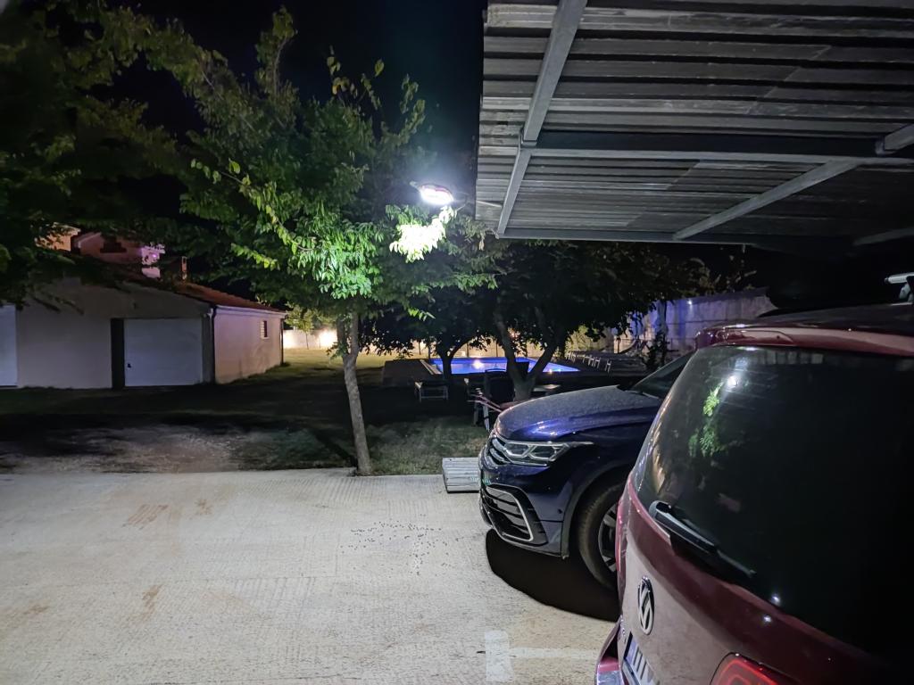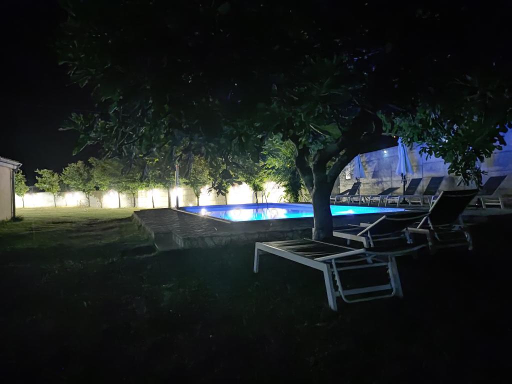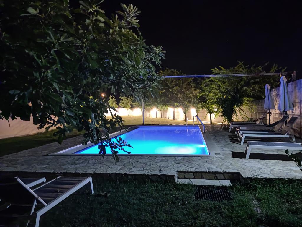 Na našem dvorišču imamo za vsak apartma dobro vzdrževano in rezervirano pokrito parkirno mesto. V pomožni stavbi imajo gostje dostop do gostilne za druženje in pripravo hrane s potrebno jedilno opremo. Bazen je preliven na dveh straneh in opremljen z dvema vrstama vodnih masaž ter je gostom na voljo od 8.00 do 22.00 ure. Ležalniki in senčniki so vključeni v ceno apartmaja. Večnamenska vadbena naprava je gostom na voljo od 8.00 do 22.00 ure in je vključena v ceno apartmaja. Pralni stroj se nahaja v pomožni stavbi in je gostom na voljo od 8.00 do 22.00 ure in je vključen v ceno apartmaja.