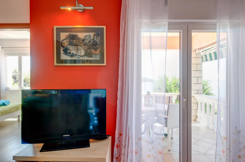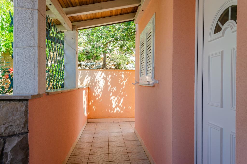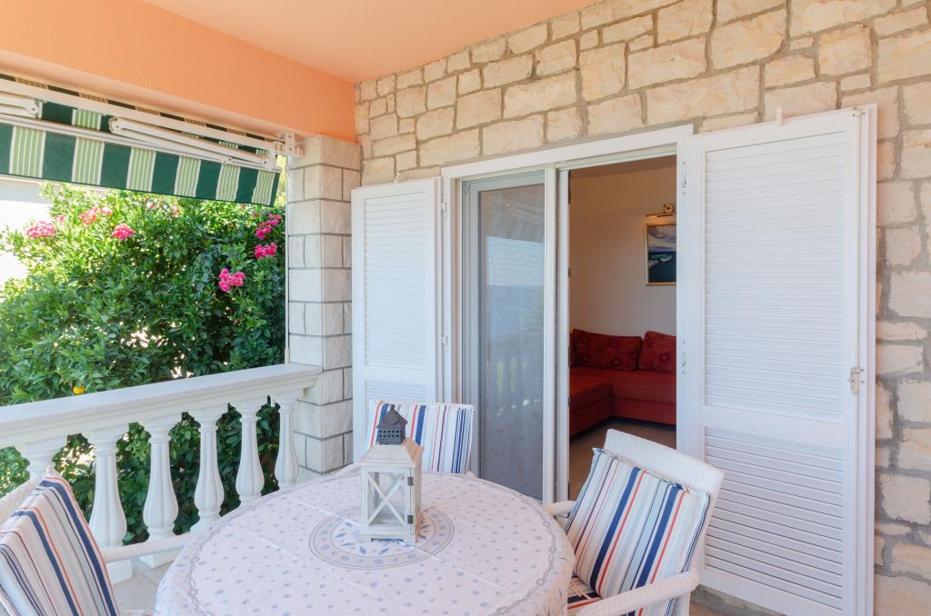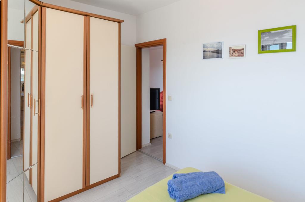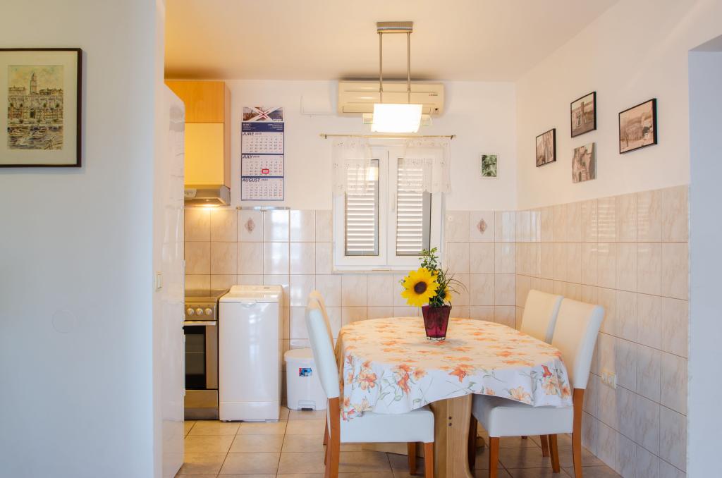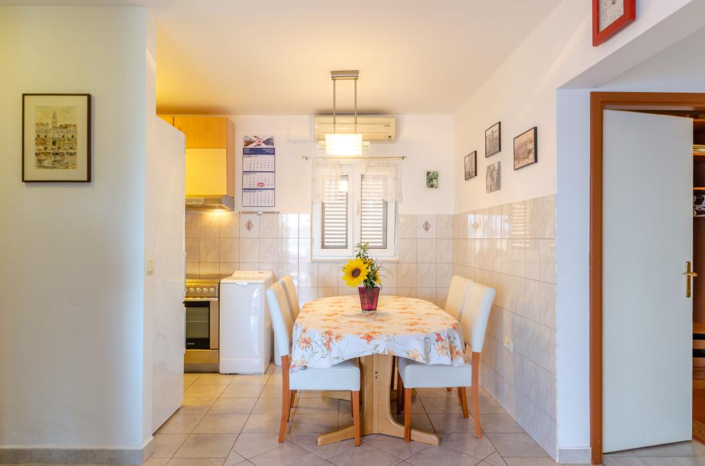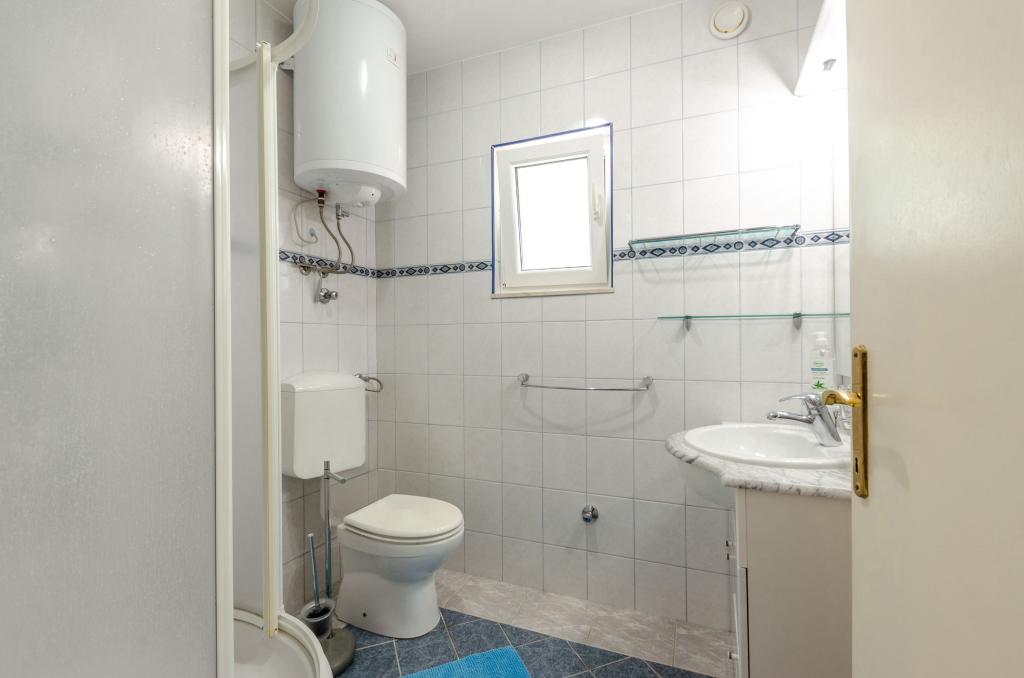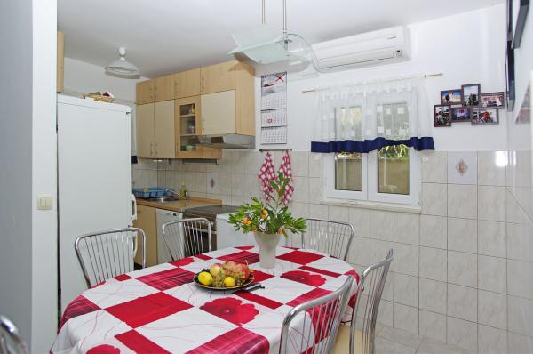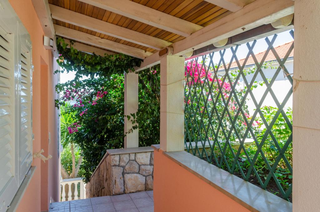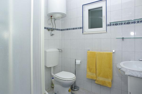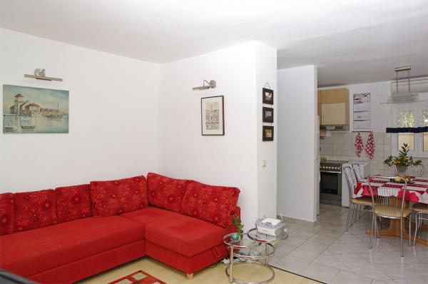 Apartma v družinski hiši, orientacije sever-jug, 30 m od morja, nahaja se v prvem nadstropju in obsega dve spalnici, dnevno sobo/jedilnico s kuhinjo, manjšo garderobo, kopalnico/wc in teraso. s pogledom na morje od 12m2 V bližini apartmaja je trgovina z živili, do centra Prižbe pa se zlahka sprehodite, cca 400 m do vseh ostalih vsebin.