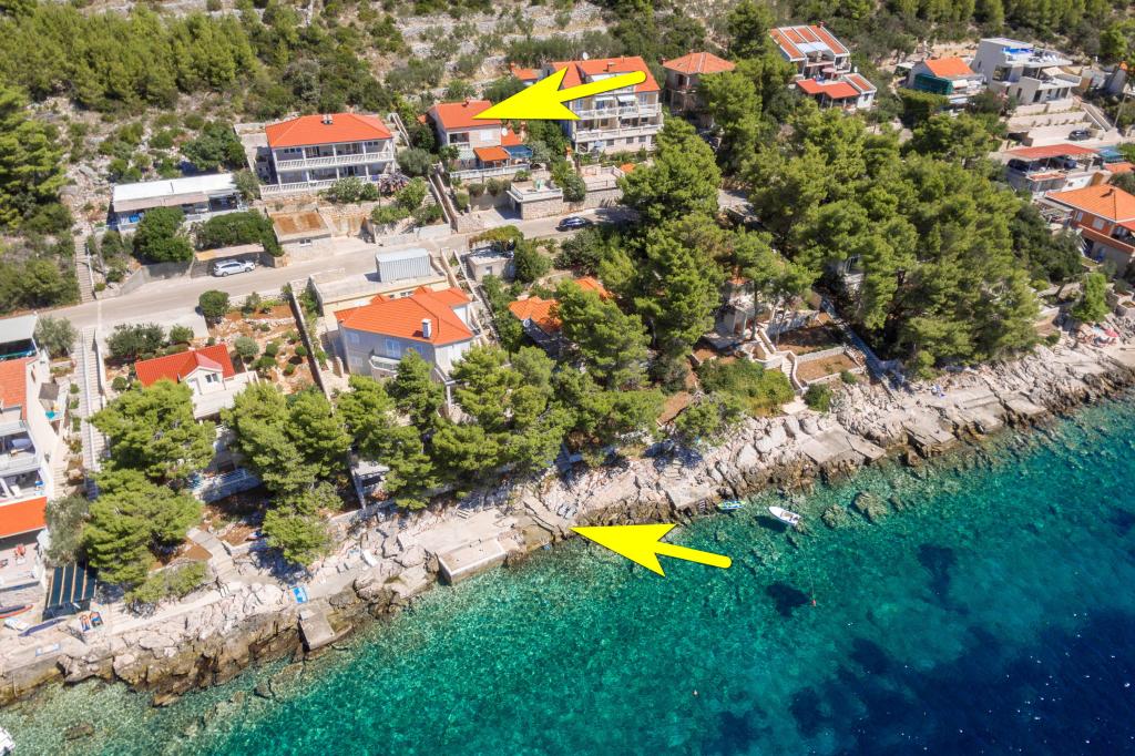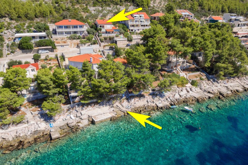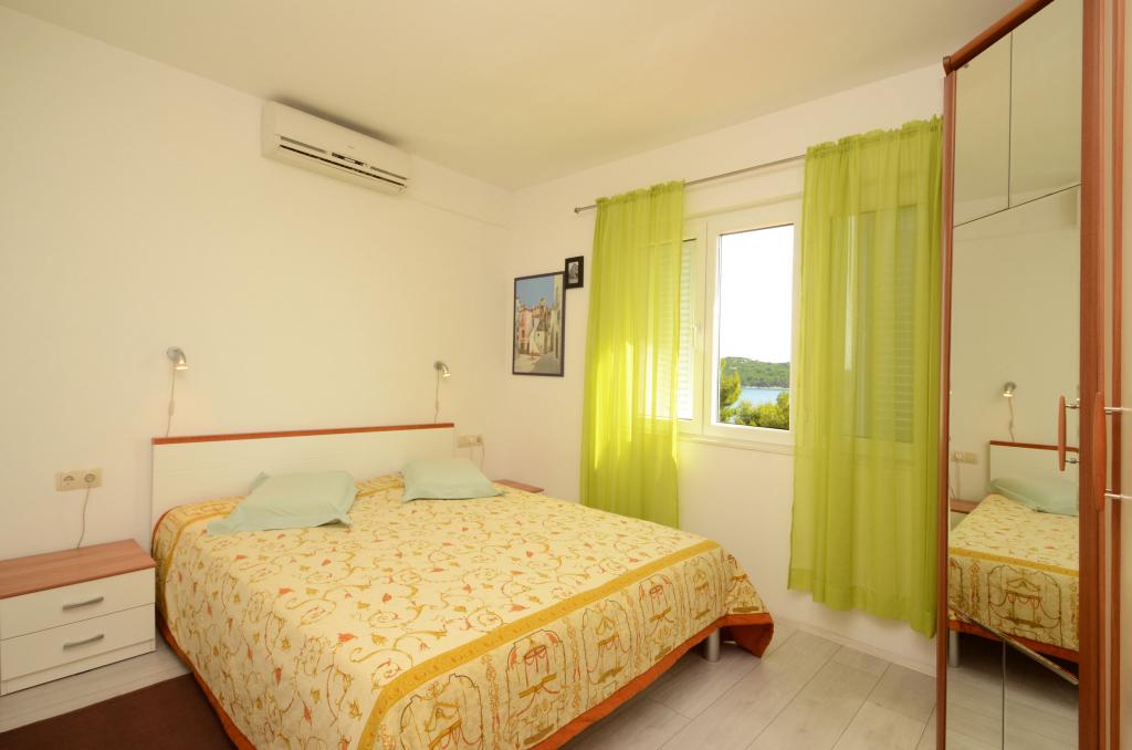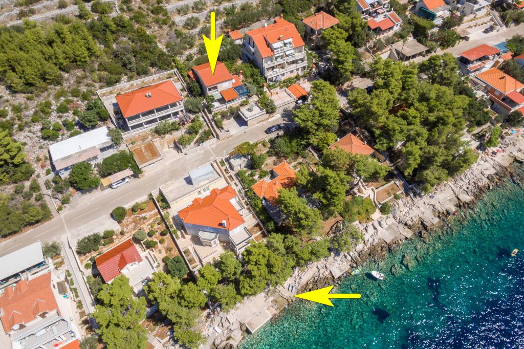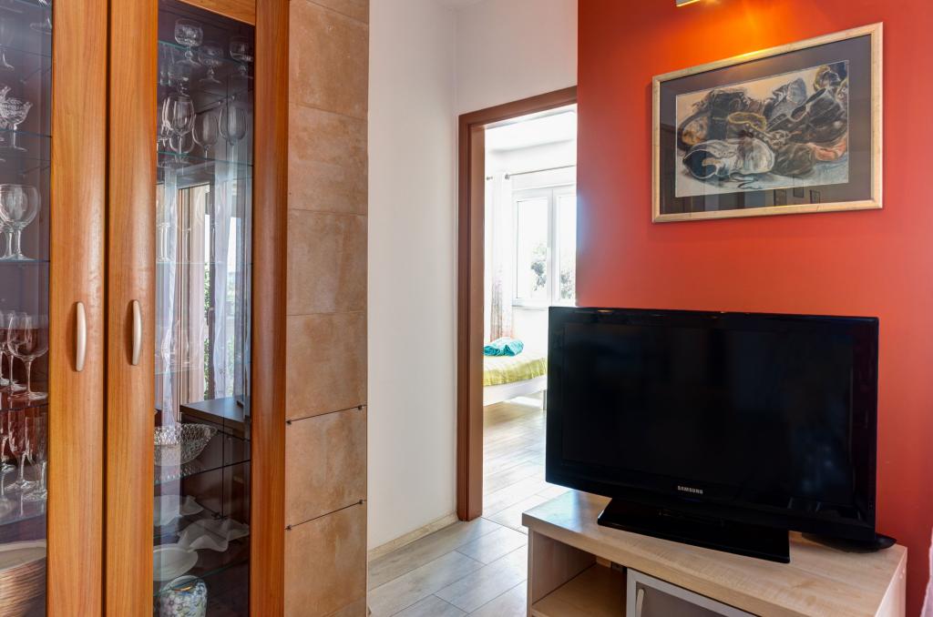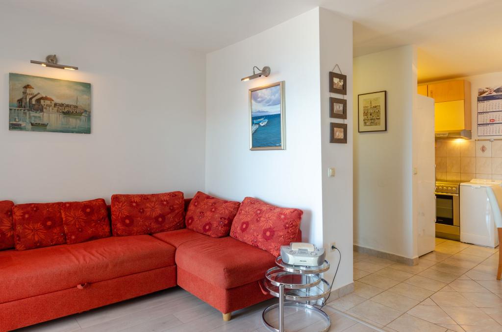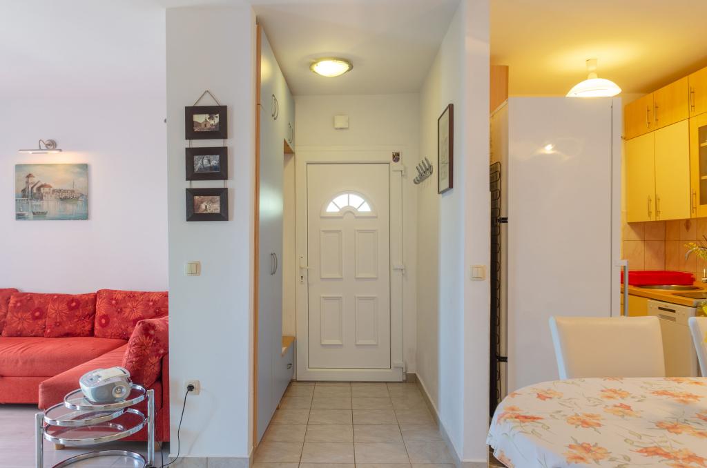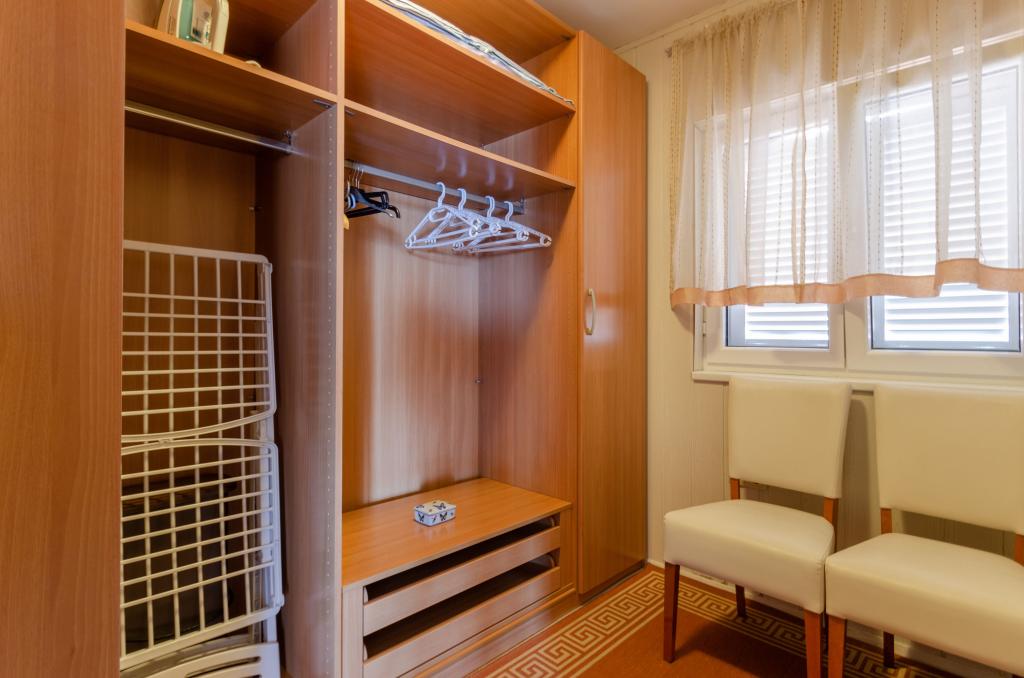 Apartma v družinski hiši, orientacije sever-jug, 30 m od morja, nahaja se v prvem nadstropju in obsega dve spalnici, dnevno sobo/jedilnico s kuhinjo, manjšo garderobo, kopalnico/wc in teraso. s pogledom na morje od 12m2 V bližini apartmaja je trgovina z živili, do centra Prižbe pa se zlahka sprehodite, cca 400 m do vseh ostalih vsebin.