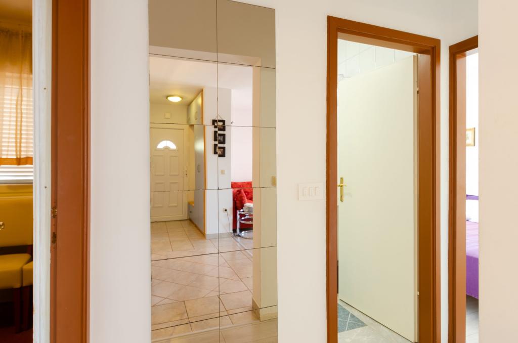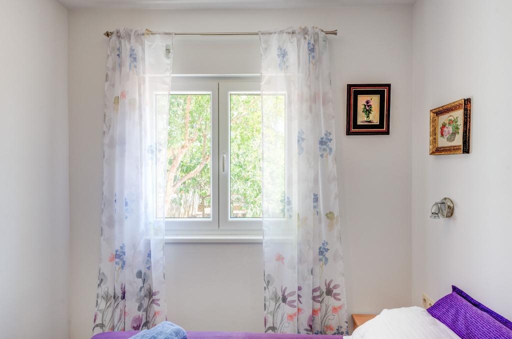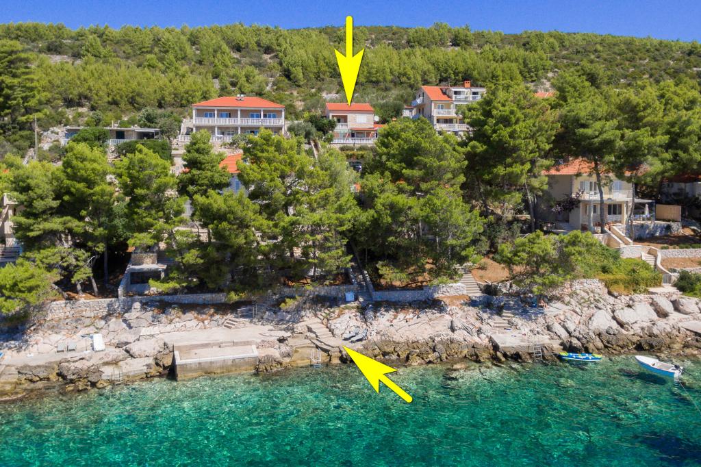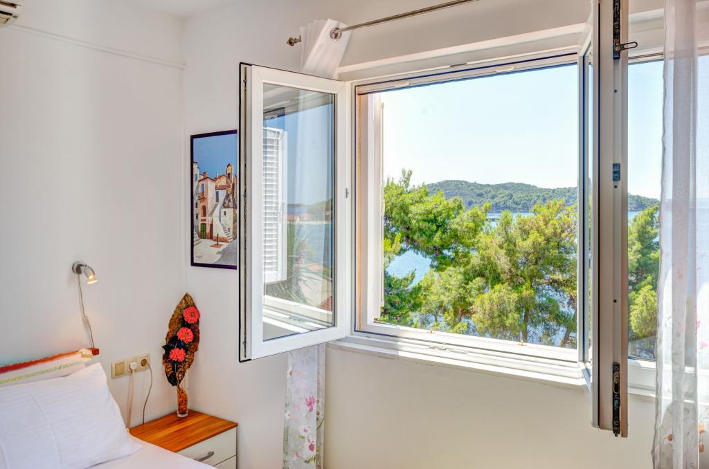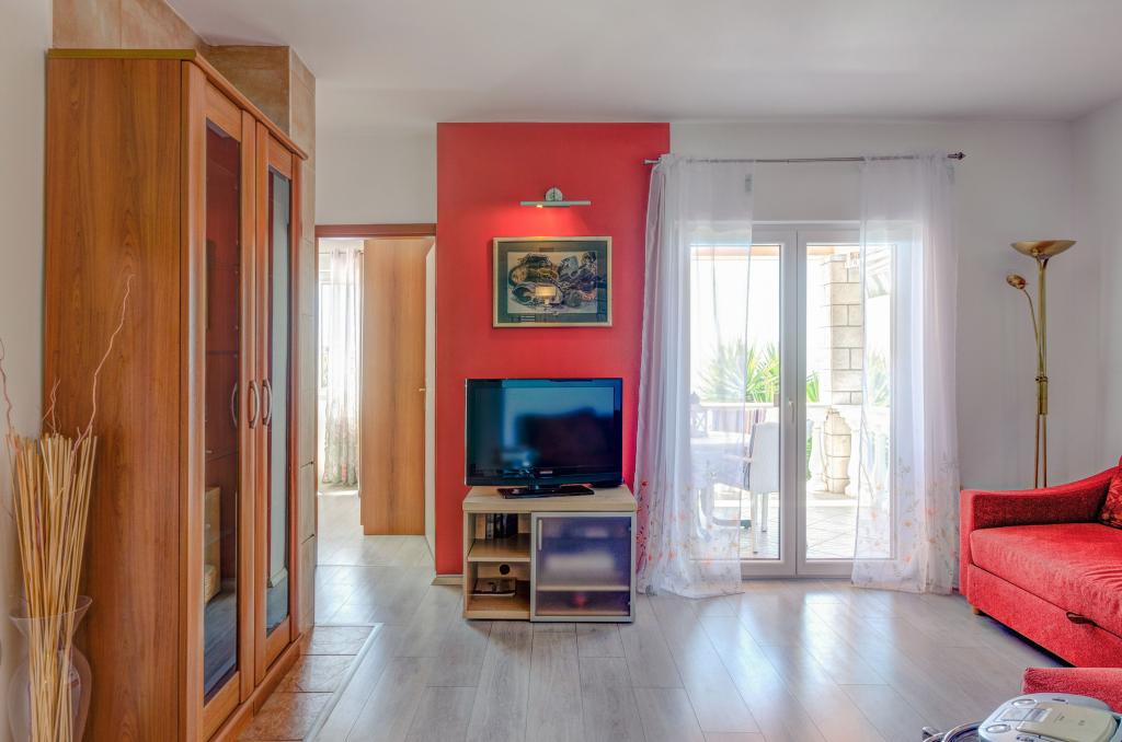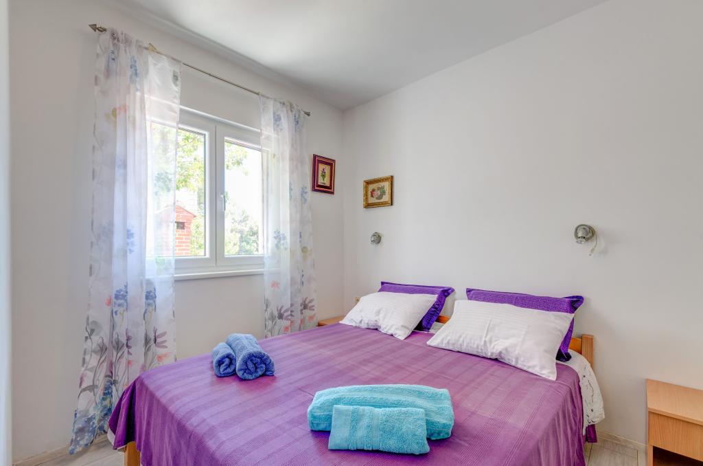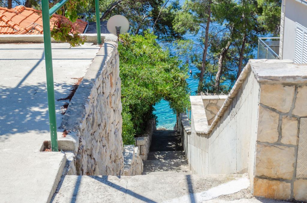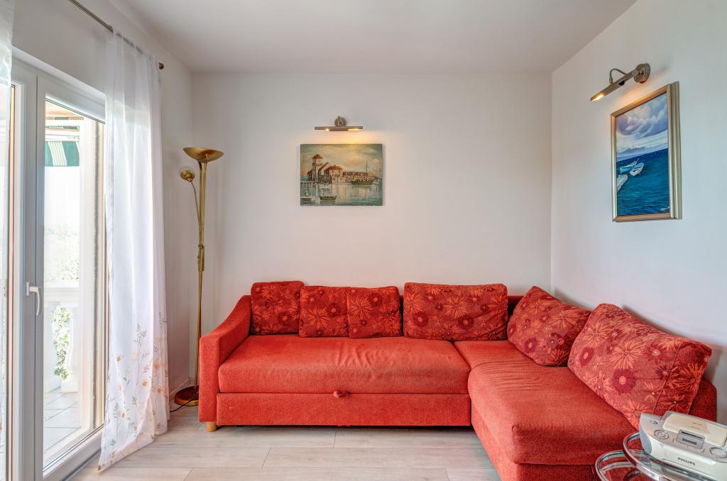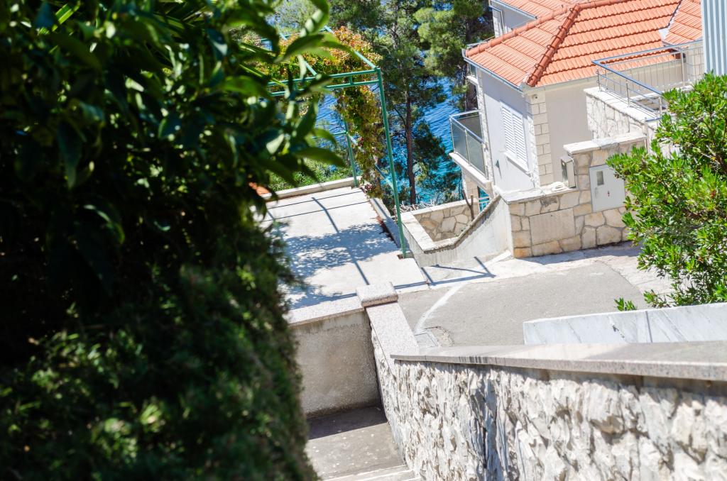 Apartma v družinski hiši, orientacije sever-jug, 30 m od morja, nahaja se v prvem nadstropju in obsega dve spalnici, dnevno sobo/jedilnico s kuhinjo, manjšo garderobo, kopalnico/wc in teraso. s pogledom na morje od 12m2 V bližini apartmaja je trgovina z živili, do centra Prižbe pa se zlahka sprehodite, cca 400 m do vseh ostalih vsebin.