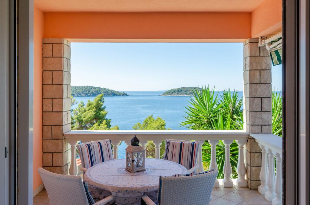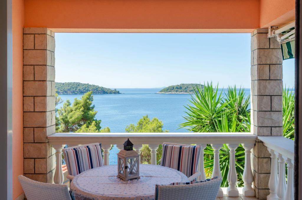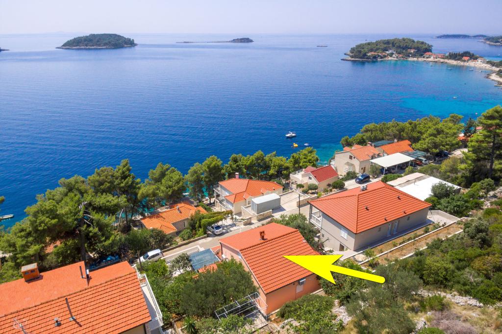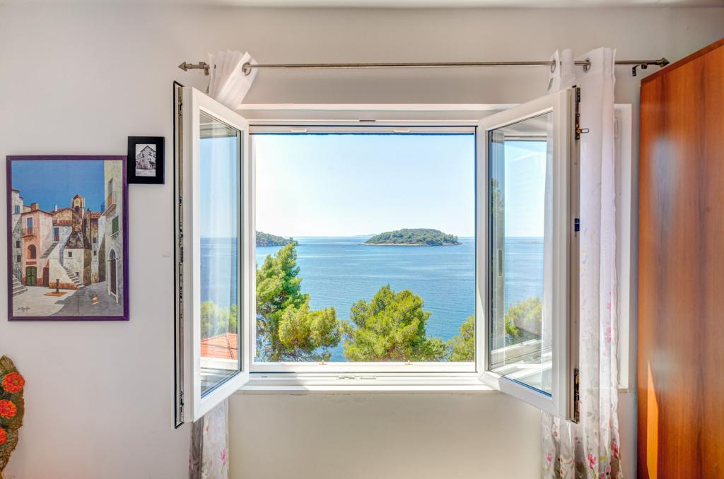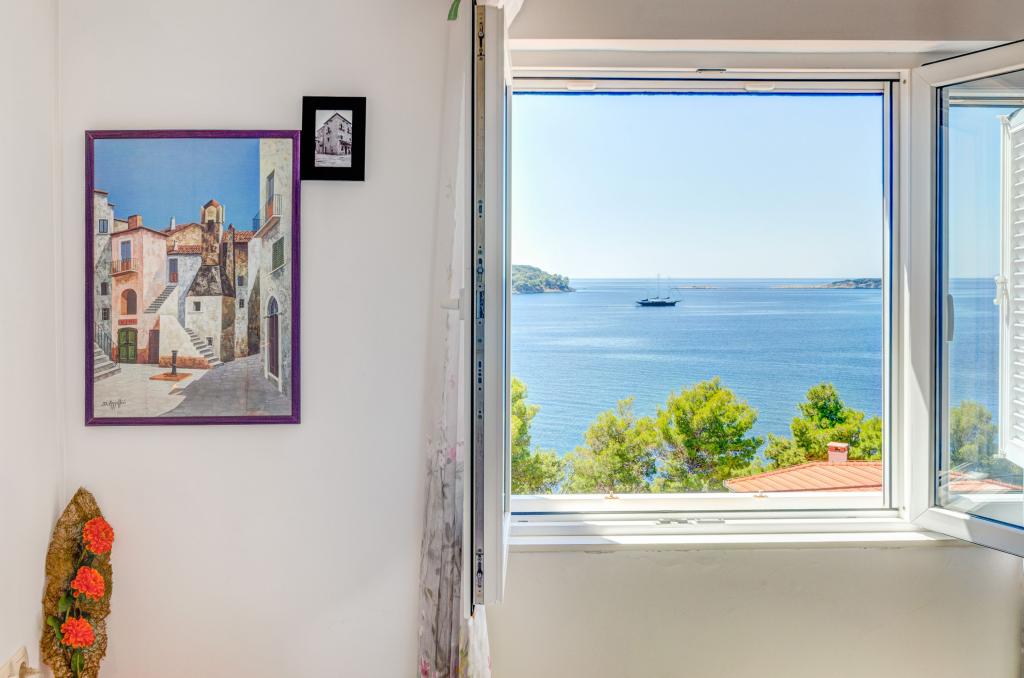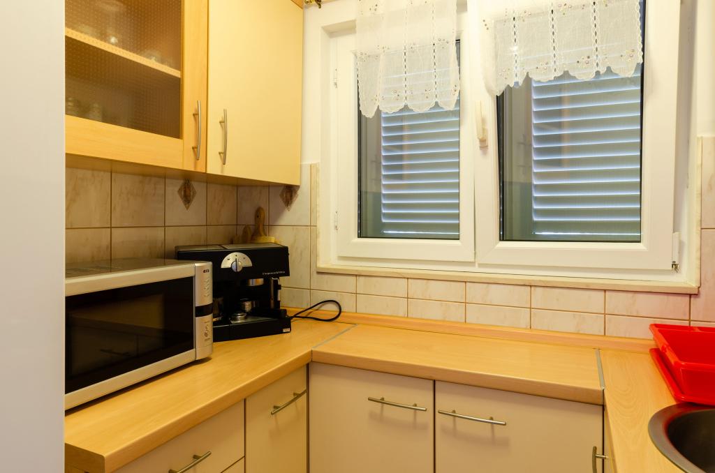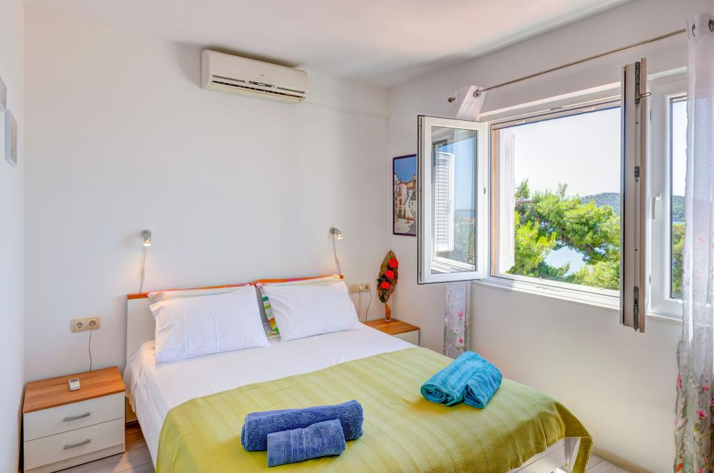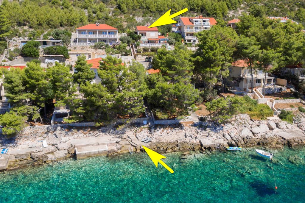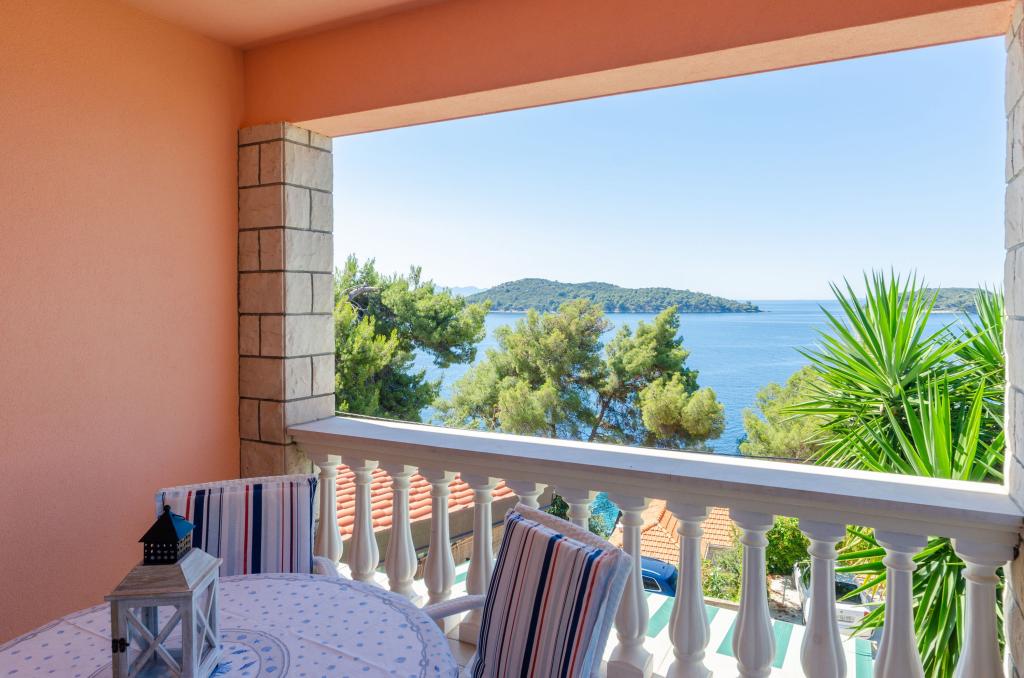 Apartma v družinski hiši, orientacije sever-jug, 30 m od morja, nahaja se v prvem nadstropju in obsega dve spalnici, dnevno sobo/jedilnico s kuhinjo, manjšo garderobo, kopalnico/wc in teraso. s pogledom na morje od 12m2 V bližini apartmaja je trgovina z živili, do centra Prižbe pa se zlahka sprehodite, cca 400 m do vseh ostalih vsebin.