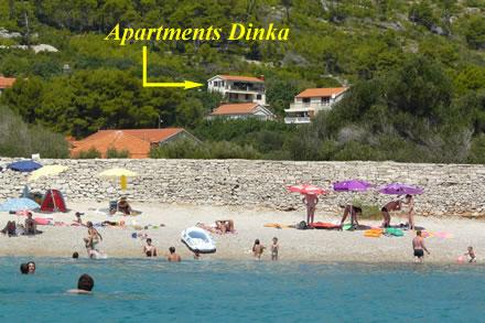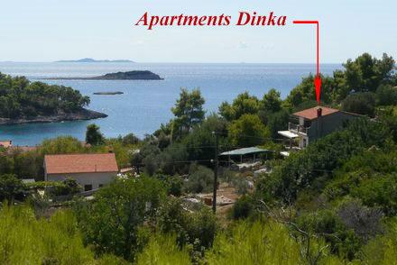 Apartmaji Dinka se nahajajo v zalivu Prižba, v mirnem delu, le 10 min- (200 m) peš od znane prodnate plaže. Vsi apartmaji imajo čudovit pogled na bližnje otočke in kanal Lastovo. V celoti in moderno opremljeno, na dvorišču je žar in parkirišče. V bližini je trgovina, restavracije, cafe bar. Če iščete kraj za družinske počitnice, v tišini, s prekrasnim pogledom na kristalno čisto morje, smo dobro sprejeti. Za vse informacije nas prosimo, da nas kontaktirate.