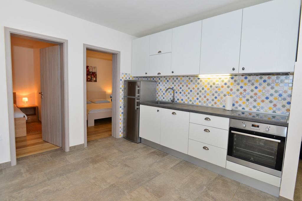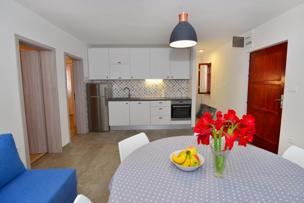 Apartmaji so zelo udobne in se nahajajo v hiši ob morju. Tik nad majhne plaže. Plaža je peščena in primerna za družine z otroki. Gostje, ki si želijo bolj intimno bivanje ob morju, se lahko odločijo za stijenovite delov obale, ki jih je mogoče doseči na kratek sprehod. Apartmaji so sestavljeni iz dveh prostorne spalnice, kopalnico, kuhinjo in veliko dnevno sobo. Vsak apartma ima teraso z mizo in stoli. Naši gostje uživajo ob jutranji kavi na terasi, ki ponuja čudovit razgled na morje in morje. Ob hiši je bazen, ki so jih gostje nastanjeni v naših dveh apartmajih v skupni rabi. Poleg bazena je prostorna vrtna opremljena z ležalniki in jedilno mizo. Gostje lahko uporabljajo nov žar, ki je določen za njihovo uporabo. Apartma je brezplačna uporaba interneta. Oddaljenost od majhnega trga je 50 metrov. Na isti razdalji je restavracija / picerija. Oddaljenost od mesta Ražanj je 500 m. Užitek sprehod do Ražanj, ker pot ob morju