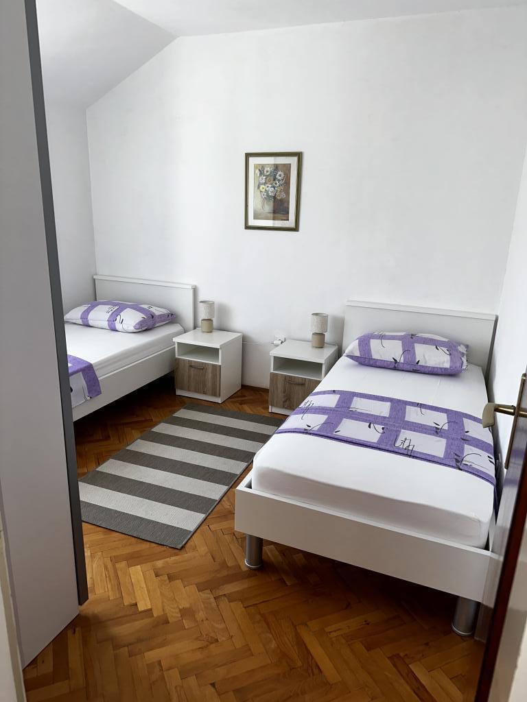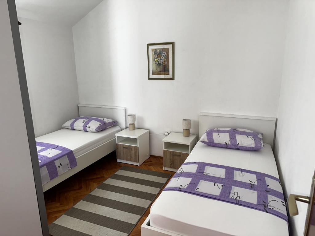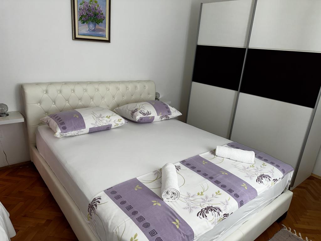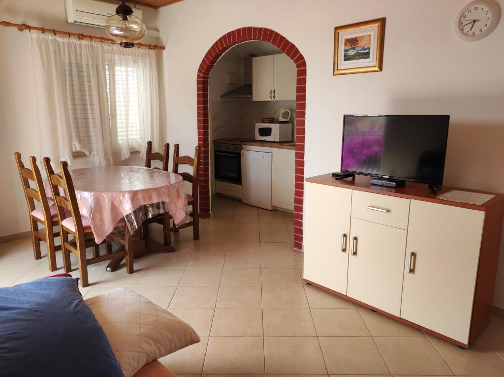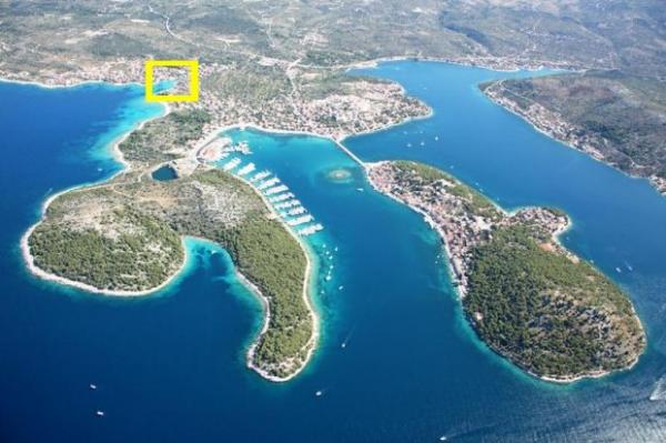 Apartma se nahaja v hiši s tremi apartmaji v neposredni bližini morja v mirnem okolju družinskih hiš. Na dvorišču hiše je varovano parkirišče za goste, apartmaje pa obdaja vrt z zasajenimi sredozemskimi rastlinami. Oba apartmaja imata dve spalnici, kopalnico, dnevno sobo s kuhinjo in velike balkone. Stanovanje v pritličju ima balkon velikosti cca. 30 m2, apartma v prvem nadstropju pa 15 m2 s pogledom na bližnje otoke. Kuhinja je opremljena z vso potrebno opremo: hladilnik, pečica, štedilnik, mikrovalovna pečica, bojler in vsi ostali kuhinjski aparati. Gostje lahko uporabljajo tudi žar na dvorišču hiše. V apartmajih je na voljo brezžični internet. Apartmaji so opremljeni s klimatsko napravo.