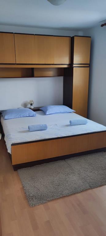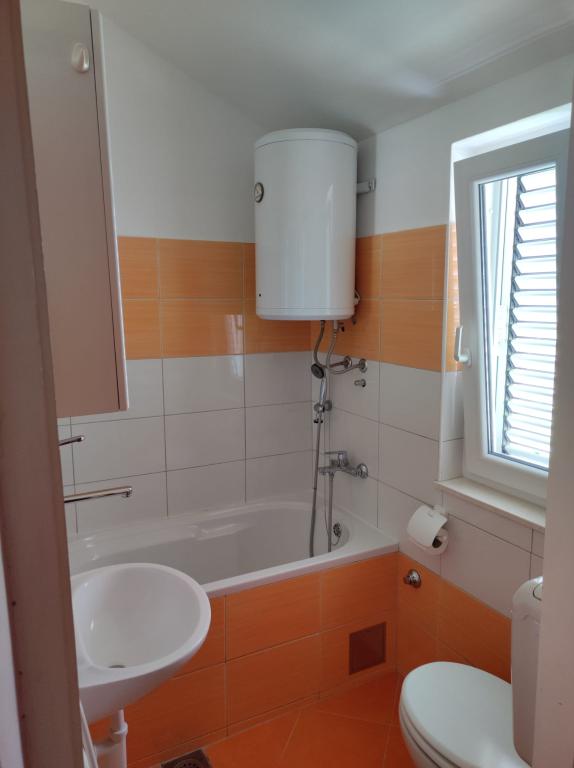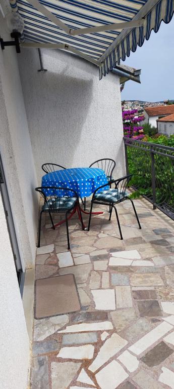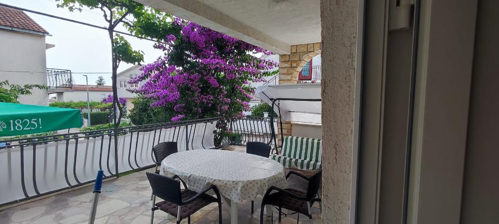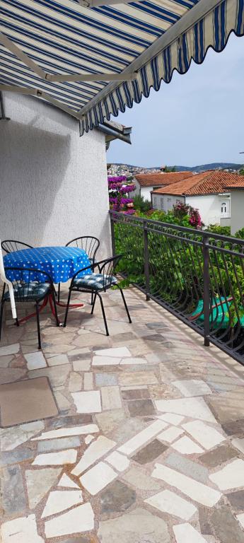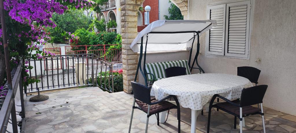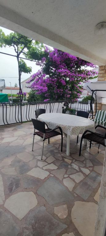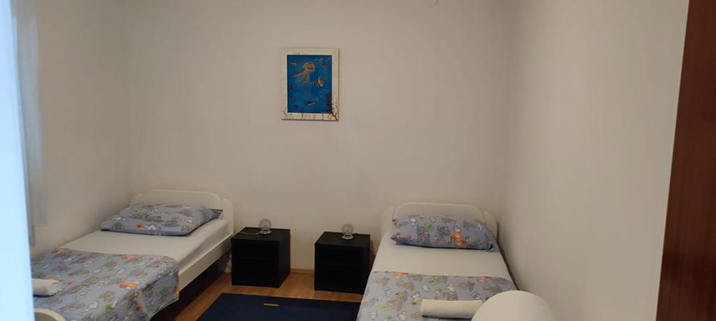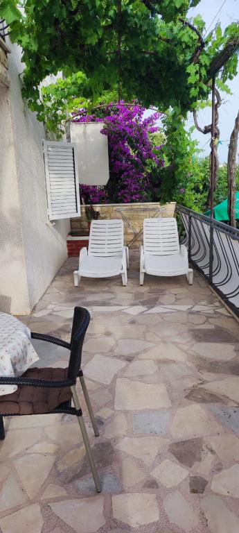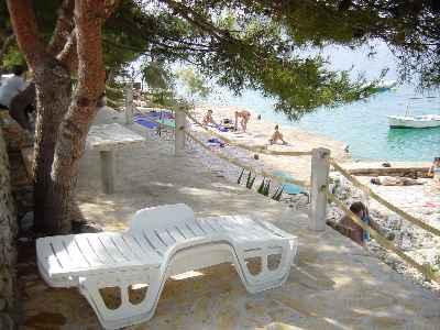 Apartma se nahaja v hiši s tremi apartmaji v neposredni bližini morja v mirnem okolju družinskih hiš. Na dvorišču hiše je varovano parkirišče za goste, apartmaje pa obdaja vrt z zasajenimi sredozemskimi rastlinami. Oba apartmaja imata dve spalnici, kopalnico, dnevno sobo s kuhinjo in velike balkone. Stanovanje v pritličju ima balkon velikosti cca. 30 m2, apartma v prvem nadstropju pa 15 m2 s pogledom na bližnje otoke. Kuhinja je opremljena z vso potrebno opremo: hladilnik, pečica, štedilnik, mikrovalovna pečica, bojler in vsi ostali kuhinjski aparati. Gostje lahko uporabljajo tudi žar na dvorišču hiše. V apartmajih je na voljo brezžični internet. Apartmaji so opremljeni s klimatsko napravo.