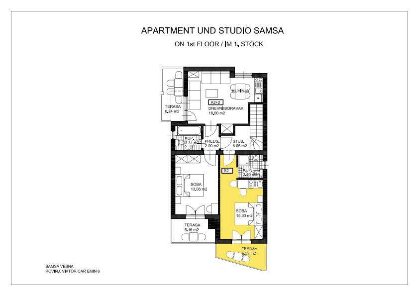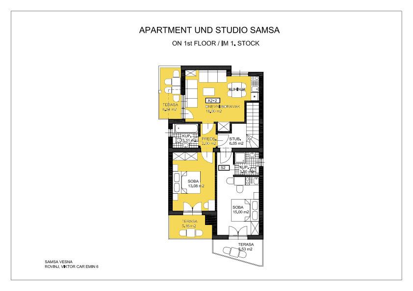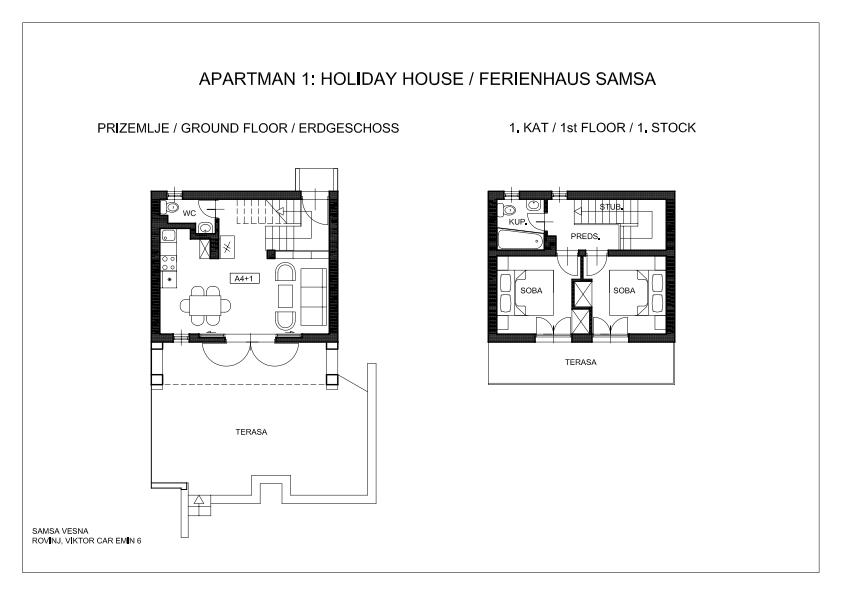 Preberite več Namestitvene enoteHišni ljubljenčki dovoljeni v hiši A4+1, v apartmaju A2+2 pa samo izven sezone. V studiu S2 jim ni dovoljeno. Dodatni stroški: 10 evrov na dan. V ceno so vključeni stroški (klima, elektrika, voda, WiFi internet itd.), posteljnina in brisače (menjava enkrat tedensko) ter turistična taksa mesta Rovinj. Pralni stroj v kleti glavne hiše je vsem našim gostom na voljo brezplačno. Stroški končnega čiščenja znašajo 65 € za hišo A4+1, 45 € za apartma A2+2 in 35 € za studio S2 (enkratno plačilo). Ob rezervaciji zahtevamo 20% akontacijo, ostalo plačate ob prihodu. Prijava: od 15.00 ure, odjava: do 9.00 ure