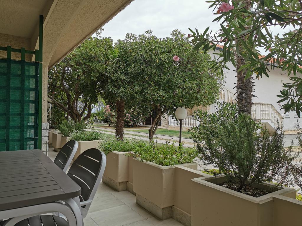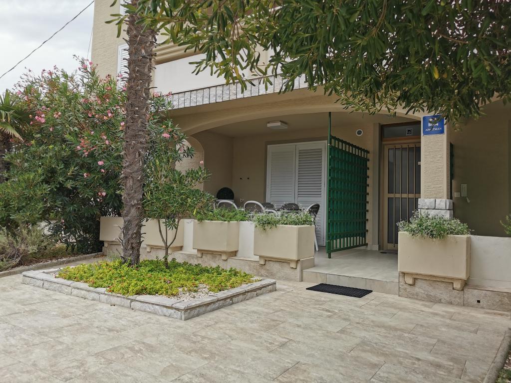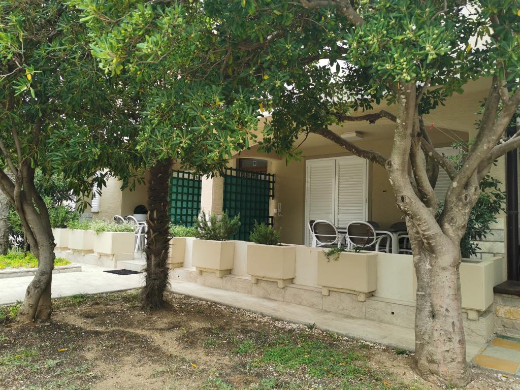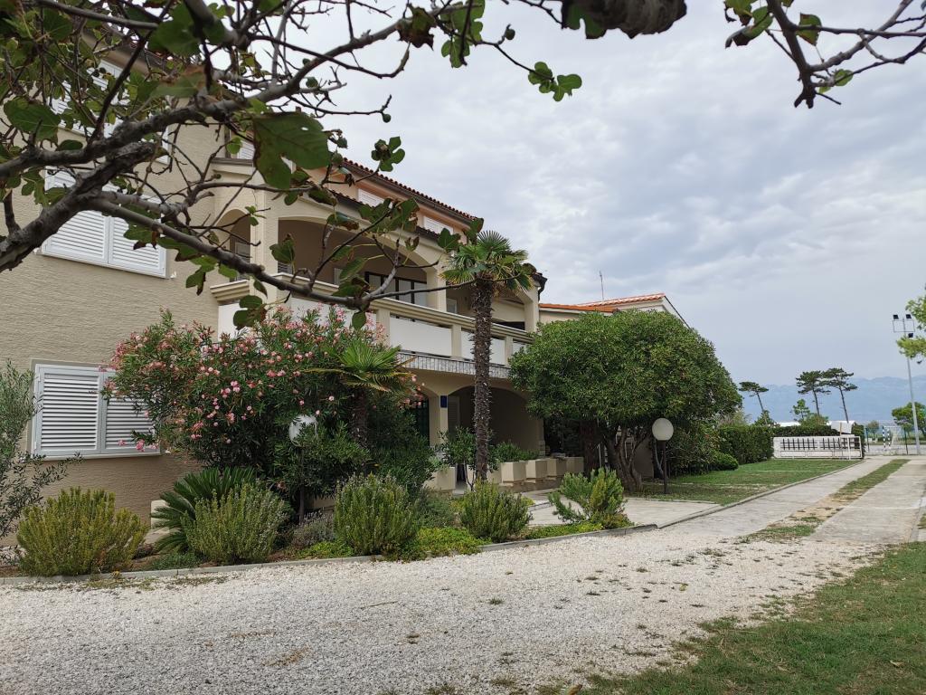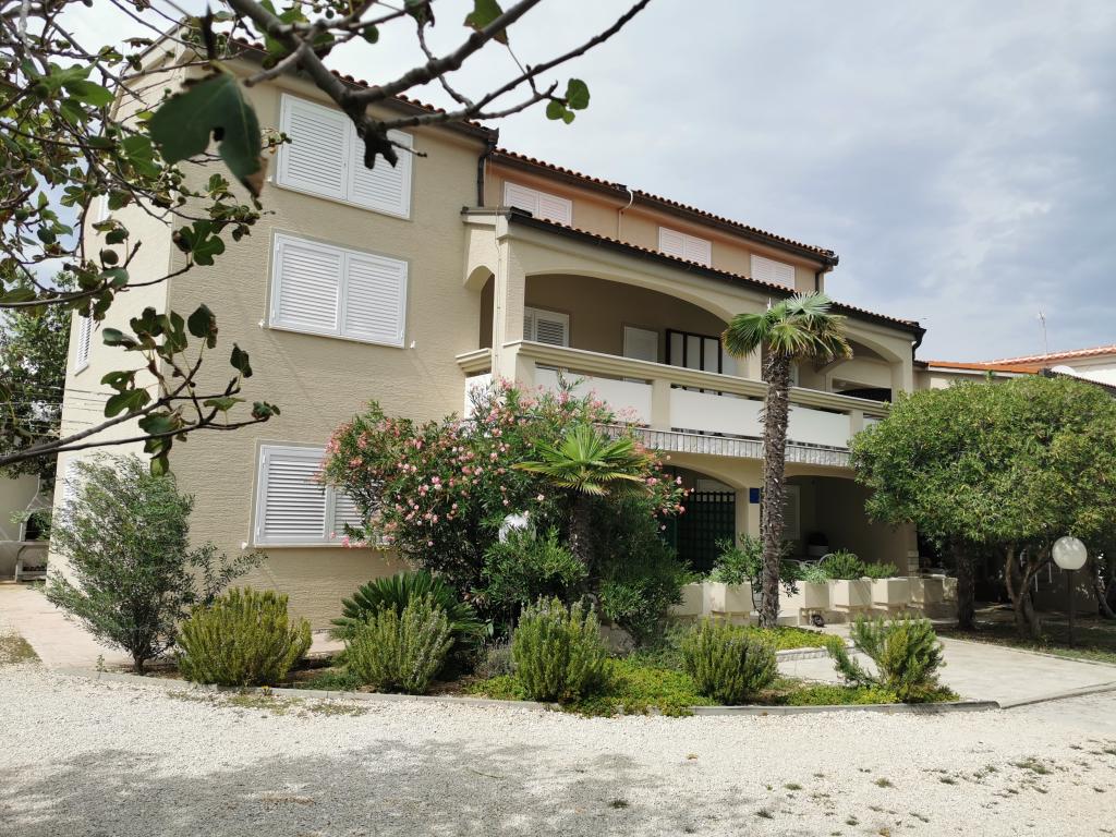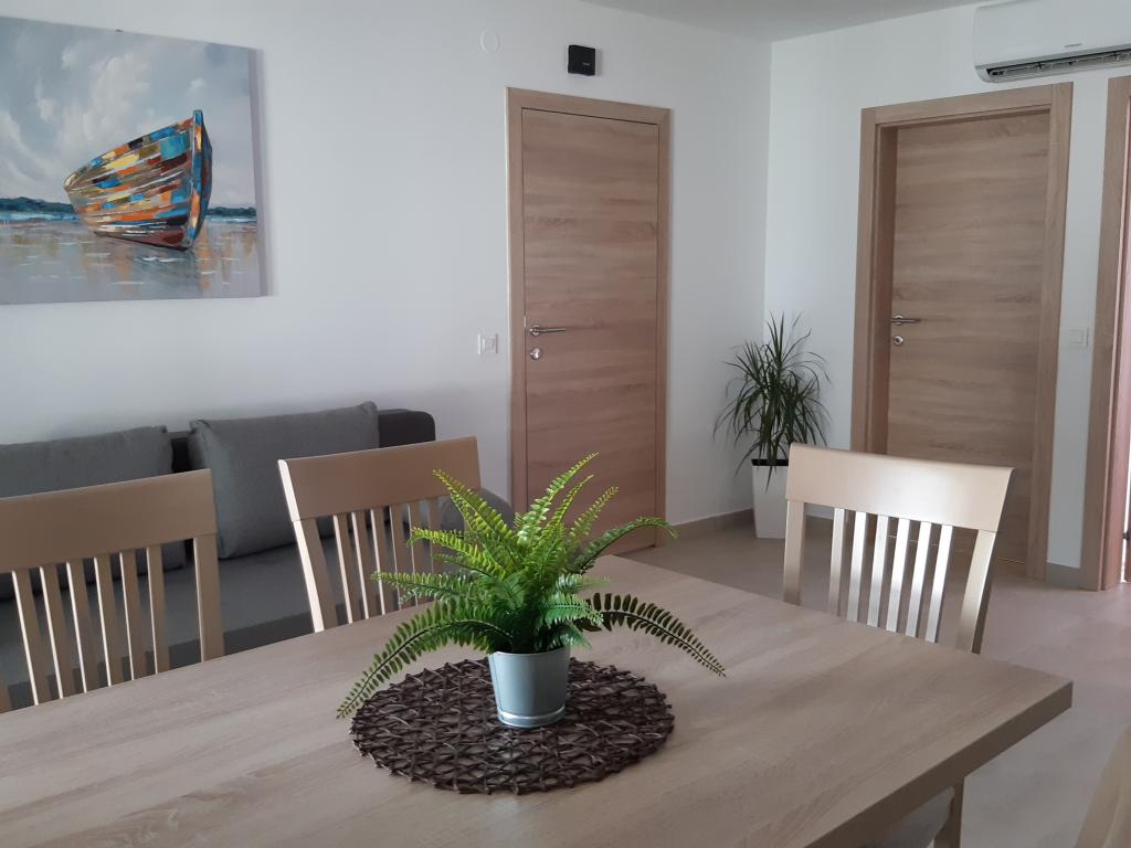 Na novo in moderno urejeni apartmaji. Lokacija v naselju - prva vrsta do morja. Apartmaji z dvema spalnicama (ena z zakonsko posteljo, druga z dvema ločenima), kuhinjo z jedilnico, pokrito teraso, kopalnico z WC in tušem. TV, kuhalnik vode, mikrovalovna pečica, kuhalna plošča, pečica, hladilnik z malim zamrzovalnikom. Dvosed v jedilnici (pomožno ležišče za 2 osebi) ali v sobi z zakonsko posteljo (pomožno ležišče za 1 osebo). Promenada do centra vasi - trgovina, pekarna, sadjernica, kavarna, sladoled - 2 min hoje. Prva restavracija 50 m pred objektom je park in borov gozd s športnimi objekti ter ograjenim novim otroškim igriščem. Dva kavarna v parku. Zaprto dvorišče našega objekta. Klima, parkirišče pokrito z zaščitno mrežo, Wi-fi, pristojbine in takse, zunanji tuš in uporaba žara vključeni v ceno.