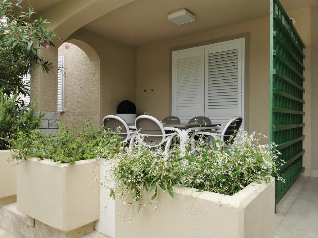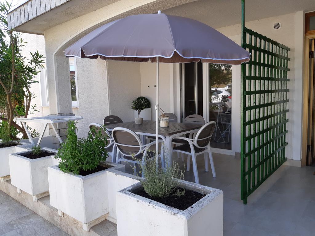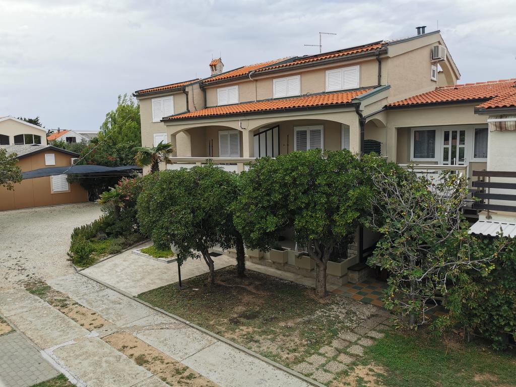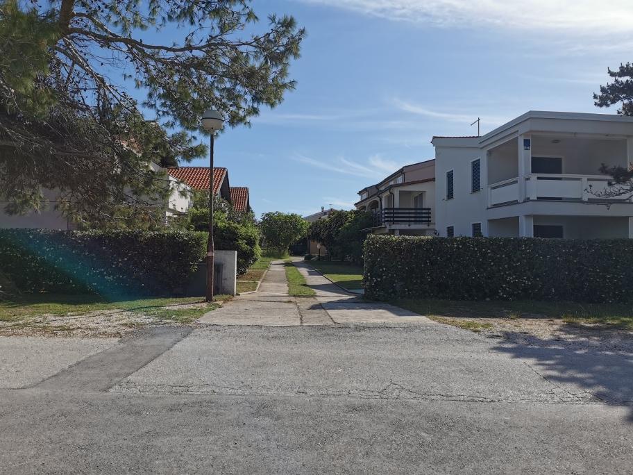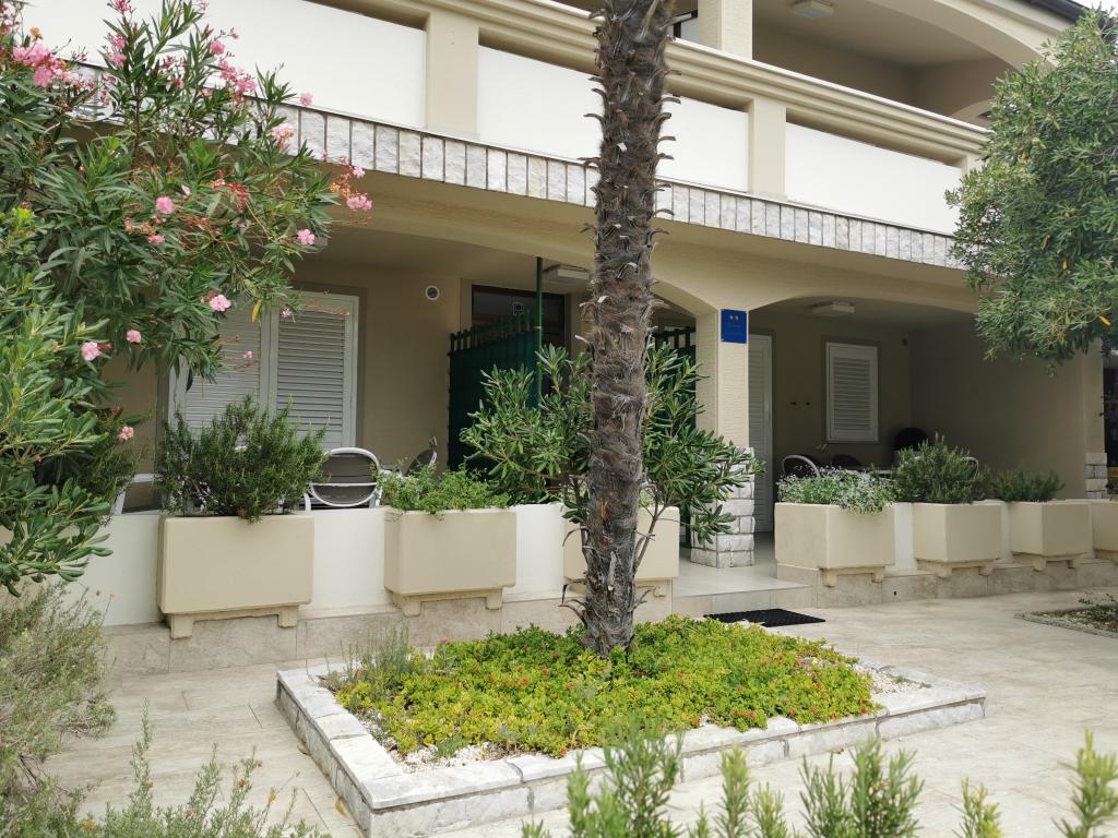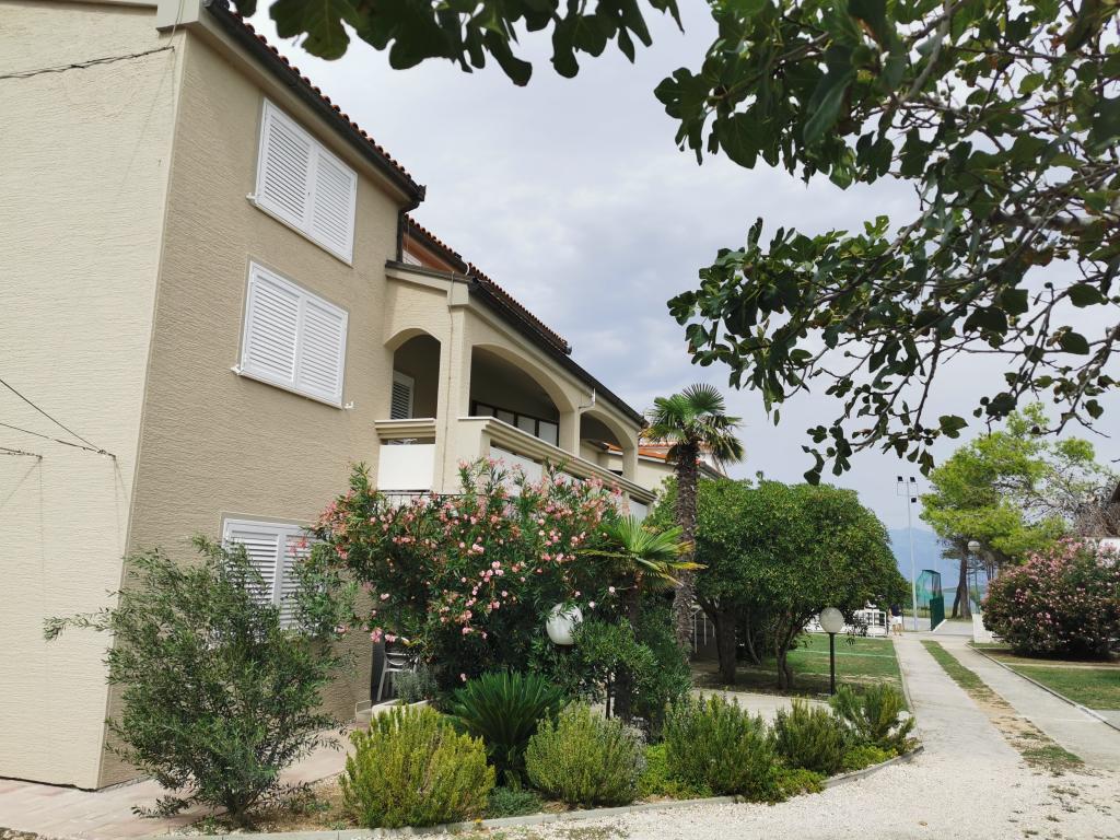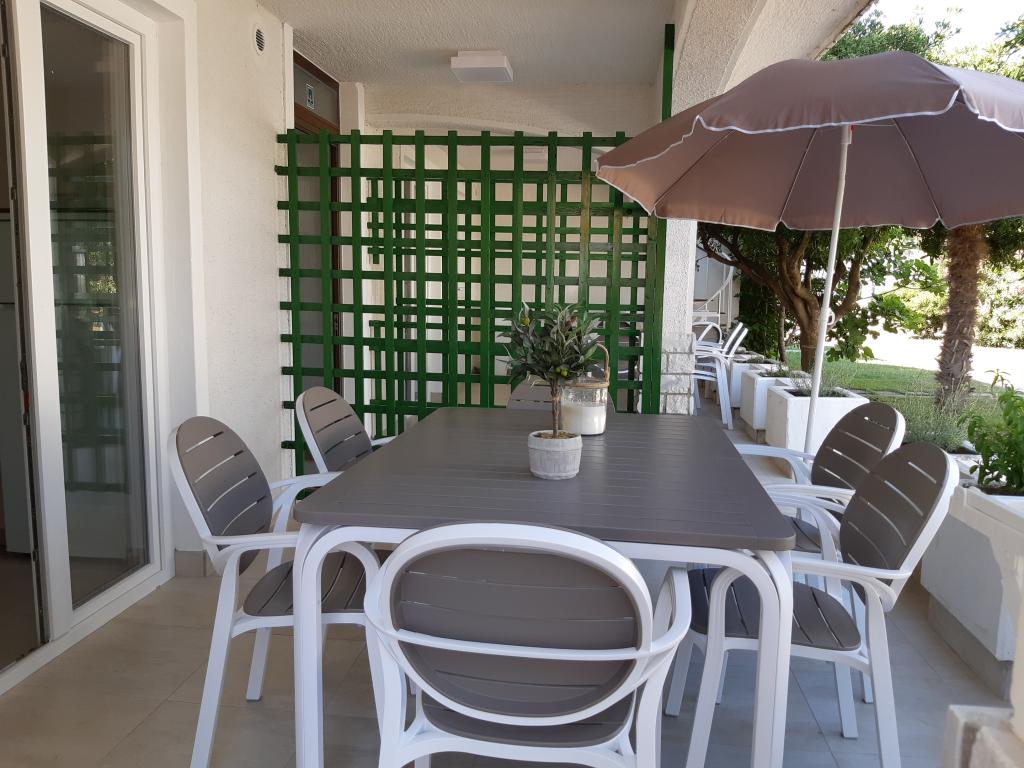 Na novo in moderno urejeni apartmaji. Lokacija v naselju - prva vrsta do morja. Apartmaji z dvema spalnicama (ena z zakonsko posteljo, druga z dvema ločenima), kuhinjo z jedilnico, pokrito teraso, kopalnico z WC in tušem. TV, kuhalnik vode, mikrovalovna pečica, kuhalna plošča, pečica, hladilnik z malim zamrzovalnikom. Dvosed v jedilnici (pomožno ležišče za 2 osebi) ali v sobi z zakonsko posteljo (pomožno ležišče za 1 osebo). Promenada do centra vasi - trgovina, pekarna, sadjernica, kavarna, sladoled - 2 min hoje. Prva restavracija 50 m pred objektom je park in borov gozd s športnimi objekti ter ograjenim novim otroškim igriščem. Dva kavarna v parku. Zaprto dvorišče našega objekta. Klima, parkirišče pokrito z zaščitno mrežo, Wi-fi, pristojbine in takse, zunanji tuš in uporaba žara vključeni v ceno.