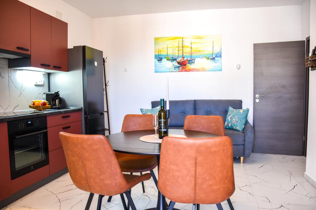 Apartmaji se nahajajo v družinski hiši, le nekaj minut hoje od morja in promenade s številnimi restavracijami, kavarnami, športnimi objekti in trgovinami. Apartma "Ema" (2+2) je sestavljen iz dvoposteljne sobe, kuhinje z jedilnico, kjer je raztegljiv kavč za dve osebi, ki se lahko raztegne v zakonsko posteljo, kopalnice in prostorne terase z žarom. Drugi apartma "Gita" (2+1) ima dvoposteljno sobo, prostorno kuhinjo z jedilnico z raztegljivim kavčem, kopalnico in prostorno teraso.