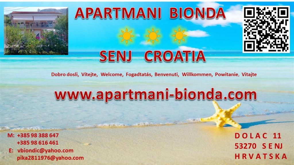 Apartmaji BIONDA so na novo zgrajeni, popolnoma in moderno opremljeni v mirnem delu mesta Senj. Nahajajo se v samostojnem objektu, to je samostojni hiši. Vsak apartma ima ločen vhod, svoj balkon ali teraso, mizo in stole za balkon na voljo, SAT-TV, brezžični internet, WI-FI, mini bar, klimatsko napravo, električne grelne plošče, zagotovljeno pa je tudi parkirišče za vaš avto. V neposredni bližini mesta Senj se nahajajo nacionalni park Plitvička jezera, naravni parki Velebit, Zavratnica, otoki Goli, Grgur, Prvić, Krk in Rab. Apartmaji se oddajajo vse leto.