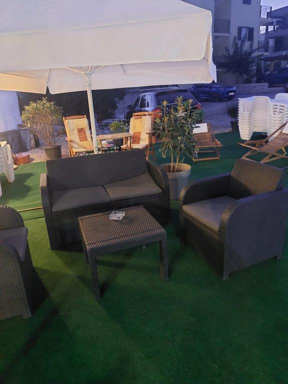 udobni apartmaji, lep pogled iz terase, v obliki bonusov bazen na vrtu, dobro opremljene zasebno plažo, bar in reštika tri minute od plaže ...