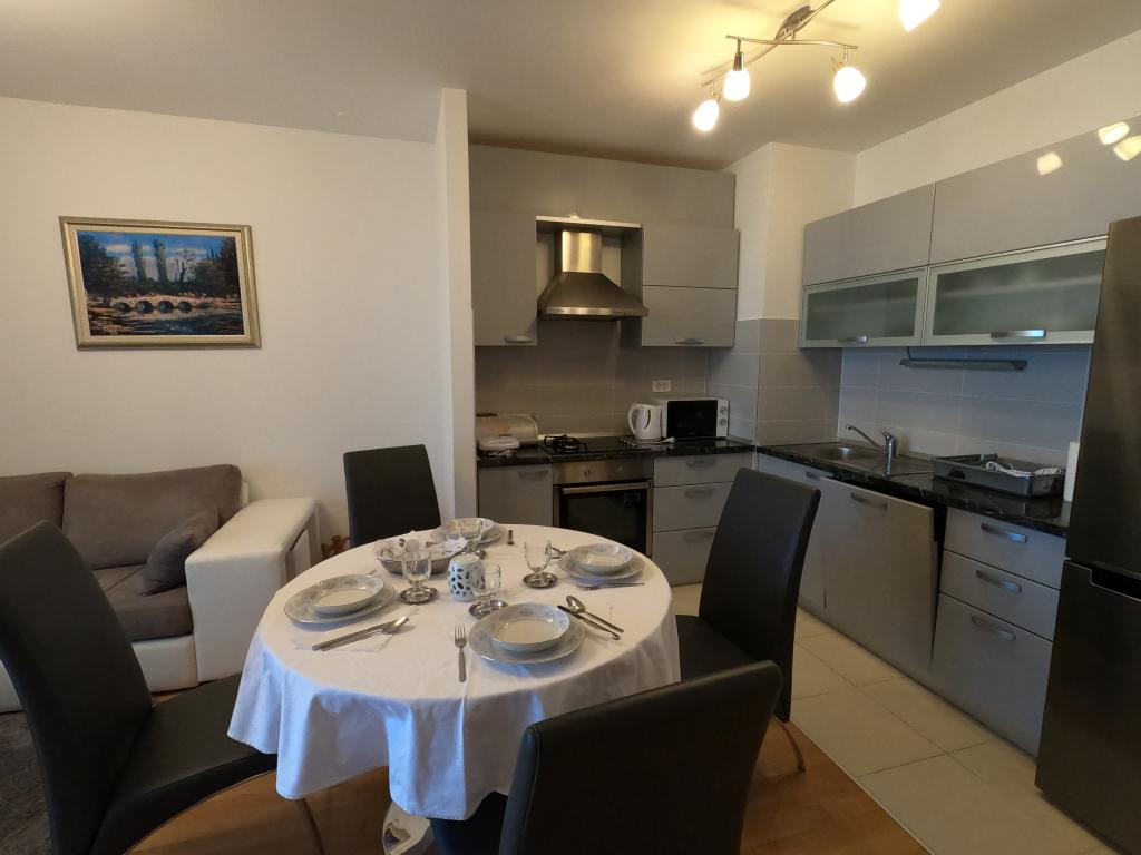 Kuhinja vključuje hladilnik, pečico, indukcijsko kuhalno ploščo, mikrovalovno pečico, grelnik za vodo in opekač kruha. Stanovanje ima lastno parkirno mesto v garaži, ki je dostopna z dvigalom. V sklopu nastanitve sta McDonalds in supermarket, ki sta odprta do polnoči.