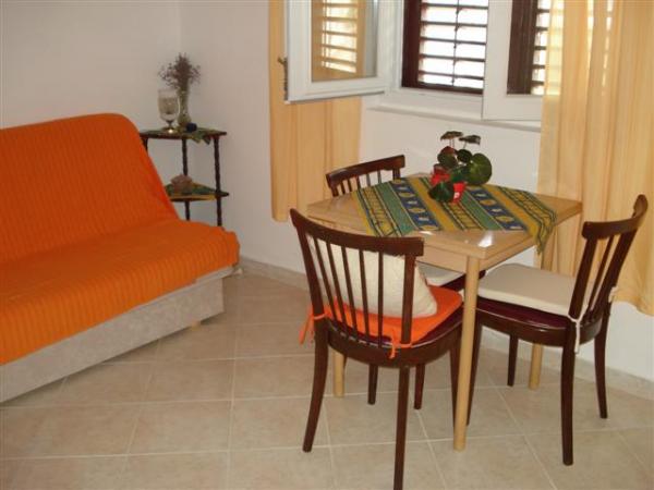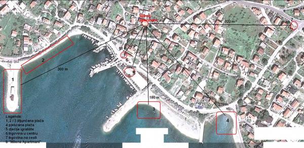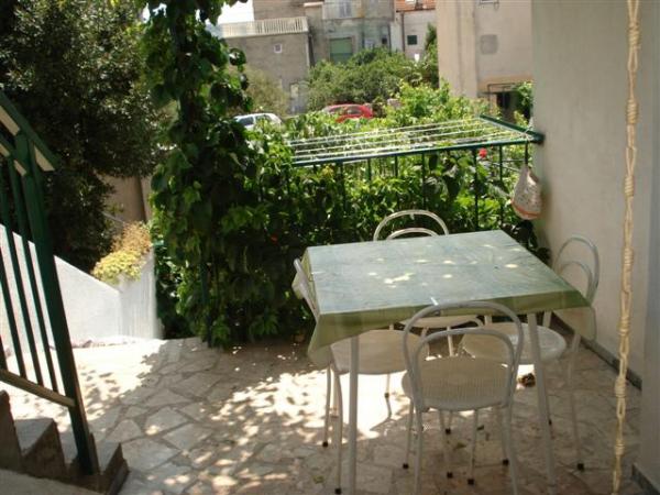 V družinski hiši se v prvem nadstropju oddajata dva apartmaja. Vsak apartma ima ločen vhod in svojo teraso. Hiša se nahaja v samem centru Srime, 60m od trgovine in 80m od morja. Plaža z modro zastavo je oddaljena 150 m. Restavracija je oddaljena 250m. Apartma 1, 2+2. Sestavljen je iz: spalnice, dnevne sobe z raztegljivim kavčem, kopalnice s kadjo in pralnim strojem, kuhinje s pomivalnim strojem, terase. Ima klimatsko napravo. Apartma 2, 2+1. Sestavljen je iz: prostorne spalnice, kuhinje - dnevne sobe v enem prostoru, stranišča s tušem in velike terase. Možnost dveh dodatnih ležišč, prvo ležišče je kavč v dnevni sobi, drugo dodatno ležišče pa lahko postavite v spalnico. Ima klimatsko napravo.
