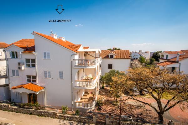 Villa Moretti se nahaja v Srimi na prodnati plaži (5 m) in ima 8 klimatiziranih apartmajev, standardno opremljenih z velikimi terasami 18/12 m2 s čudovitim pogledom na morje. Na dvorišču hiše v senci imamo zagotovljeno parkirišče za naše goste.