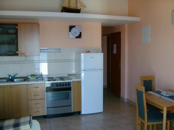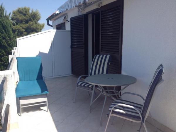 Apartmaji se nahajajo v zasebni hiši, drugo vrstico, oddaljenost od plaže okoli 50m. So v drugem nadstropju in ima teraso s pogledom na morje. Oba apartmaja sta klimatizirana. Večji apartma ima dnevno sobo in kuhinjo, spalnico in kopalnico s kadjo. Studio apartma ima dnevno sobo in kuhinjo in kopalnico s kadjo. Možnost uporabe žara. Oddaljenost od centra mesta je približno 850m, kjer so restavracije, picerije, kavarne, in drugih trgovinah. V bližini potapljaški center in marino za čolne. Idealen kraj za družine z otroki, saj so apartmaji, ki se nahajajo v mirnem okolju. Čeprav nimamo WiFi, na našem balkonu s pogledom na morje, se vam zdi boljše povezave! :)
