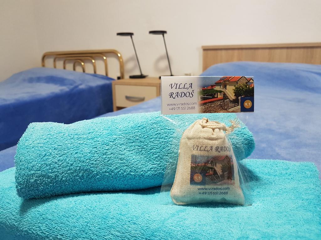 VILLA RADOŠ, 4 zvezdice, se nahaja v vzhodnem delu Supetra nasproti zelenega pasu. Od centra in plaže je oddaljen le nekaj minut hoje. Ima skupno 4 apartmaje: 2-nadstropna 4-sobna stanovanja za max. 6-8 oseb, 1 dvoposteljna soba za max. 2-4 osebe in 1 studio za max. 2 osebi. Vsi naši apartmaji imajo velike, popolnoma in sodobno opremljene sobe in tako omogočajo lagoden dopust. Vsak duplex apartma ima 3 spalnice (2 troposteljni in 1 dvoposteljna), kletni apartma ima 1 triposteljno sobo in dnevno sobo s kavčem, garsonjera pa 1 dvoposteljno sobo s kavčem. Vsak dvoetažni apartma ima 2 kopalnici, sodobno opremljeno kuhinjo (opekač kruha, aparat za kavo, mikrovalovna pečica, pomivalni stroj...), dnevno sobo (SAT-smart-TV, hi-fi, DVD itd.) ter veliko teraso in balkon., v pritličju pa velik vrt z različnim cvetjem in agrumi. Manjša stanovanja imajo po 1 kopalnico in novo opremo. Parkirišče za 6 avtomobilov je pred glavnim vhodom, prav čez cesto pa so največji supermarketi LIDL, TOMMY in KONZUM.