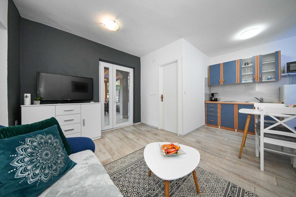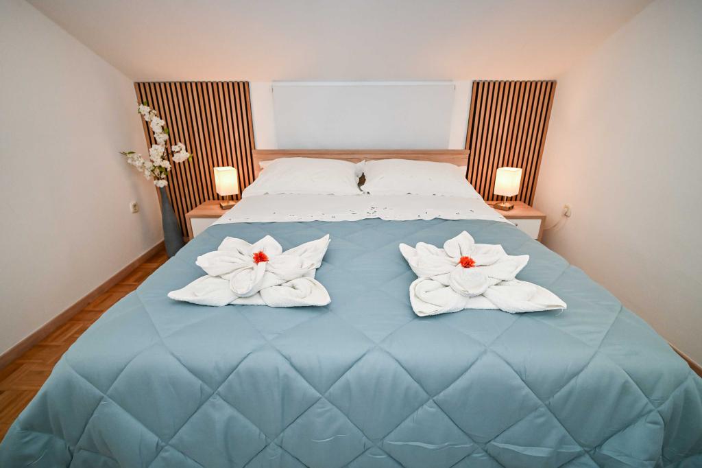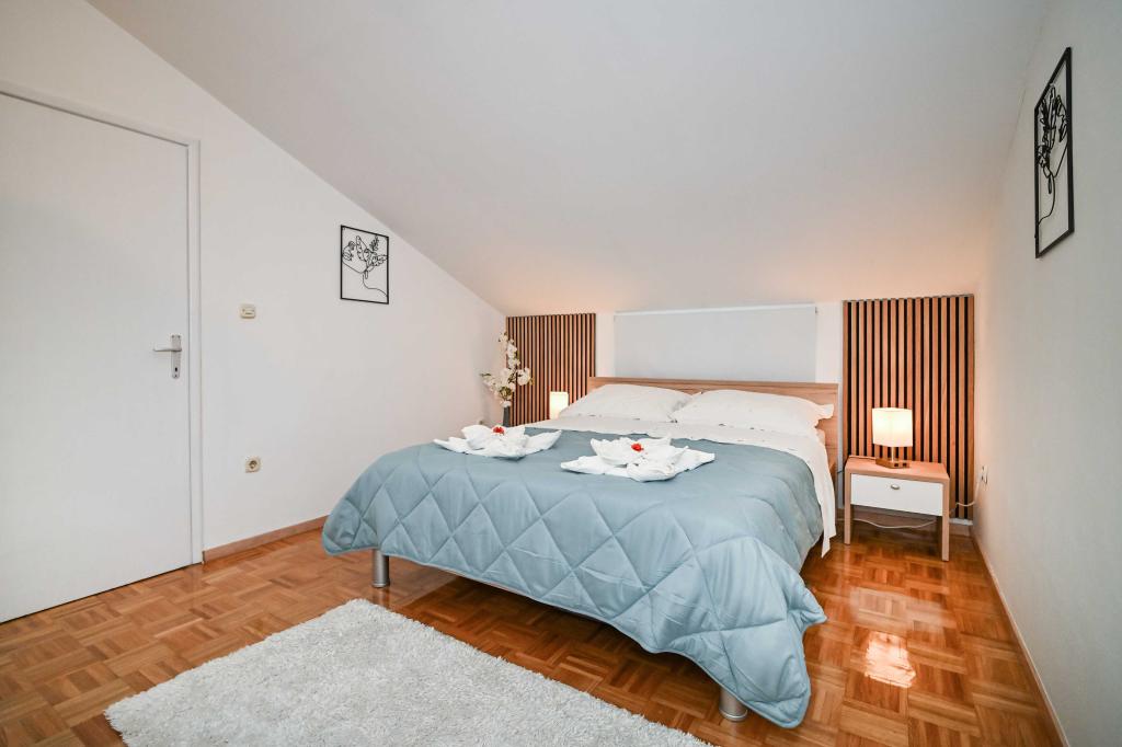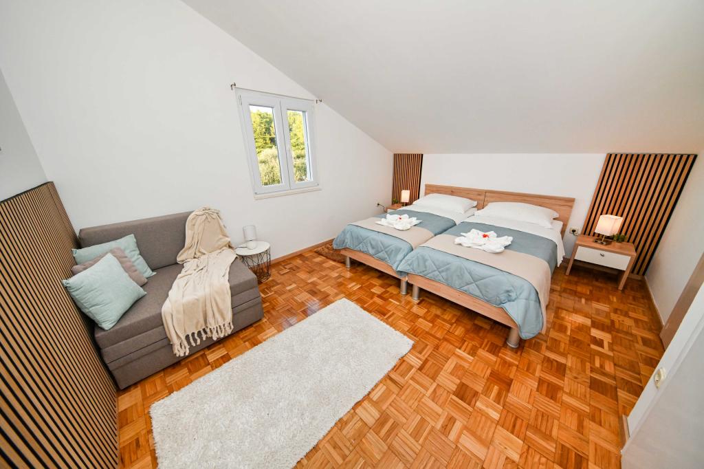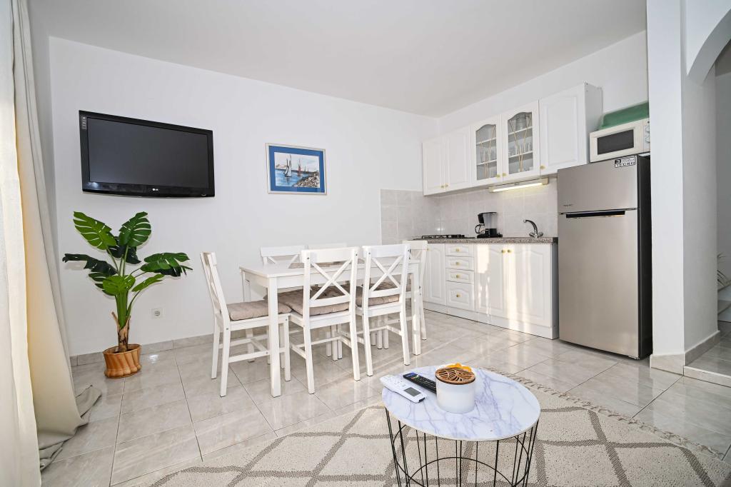 Dajte nam priložnost in si nepozabne počitnice boste doživeli samo pri nas. V naših apartmajih vrhunsko urejenih v bližini borovega gozda in morja bo vaš dopust popoln. Promenada in bližnji razgledni, kolesarske poti, v bližini Vransko jezero Naravni park, in Nacionalni parki Kornati in slapovi Krke, starodavna mesta Zadra in Šibenika, bo zagotovo izpolnila pričakovanja tudi najbolj zahtevne goste. Naš kompleks je velikosti 2500m2, obdan z oljkami in borovim gozdom. Iz dvorišča je lep pogled na morje Pašman Channel. V kompleksu je: • Družinska hiša, kjer sta dva ločena apartmaja (za 4 in 6 oseb). • Apartmaji so opremljeni s klimatsko napravo, TV, Wi-Fi in terase s pogledom na bazen morje in bazen. • Bazen: Ob hiši je bazen z lepo okolico in ležalniki • Bazen se nahaja, obstajata dve kopalnici s tušem in dve kopalnici, ločen prostor za pranje perila, ki je Opremjen s pralnim strojem in sušilni